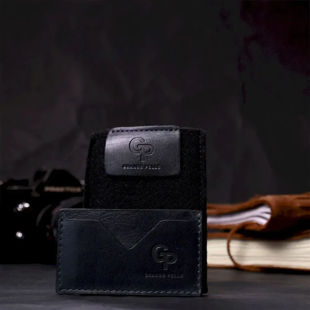 Стильний шкіряний кард-кейс ручної роботи із натуральної висококласної шкіри. На лицьовій стороні виріб має тиснений логотип виробника Grande Pelle, а також прошитий по краю рівним рядком під колір виробу. Аксесуар складається із двох відділень під картки. Завдяки компактним розмірам аксесуара він чудово поміщається у гаманець, кишеню чи сумку будь-якого розміру. Відмінний аксесуар для сучасної людини.