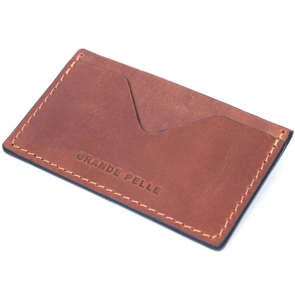 Стильний шкіряний кард-кейс ручної роботи із натуральної висококласної шкіри. На лицьовій стороні виріб має тиснений логотип виробника Grande Pelle, а також прошитий по краю рівним рядком під колір виробу. Аксесуар складається із двох відділень під картки. Завдяки компактним розмірам аксесуара він чудово поміщається у гаманець, кишеню чи сумку будь-якого розміру. Відмінний аксесуар для сучасної людини.