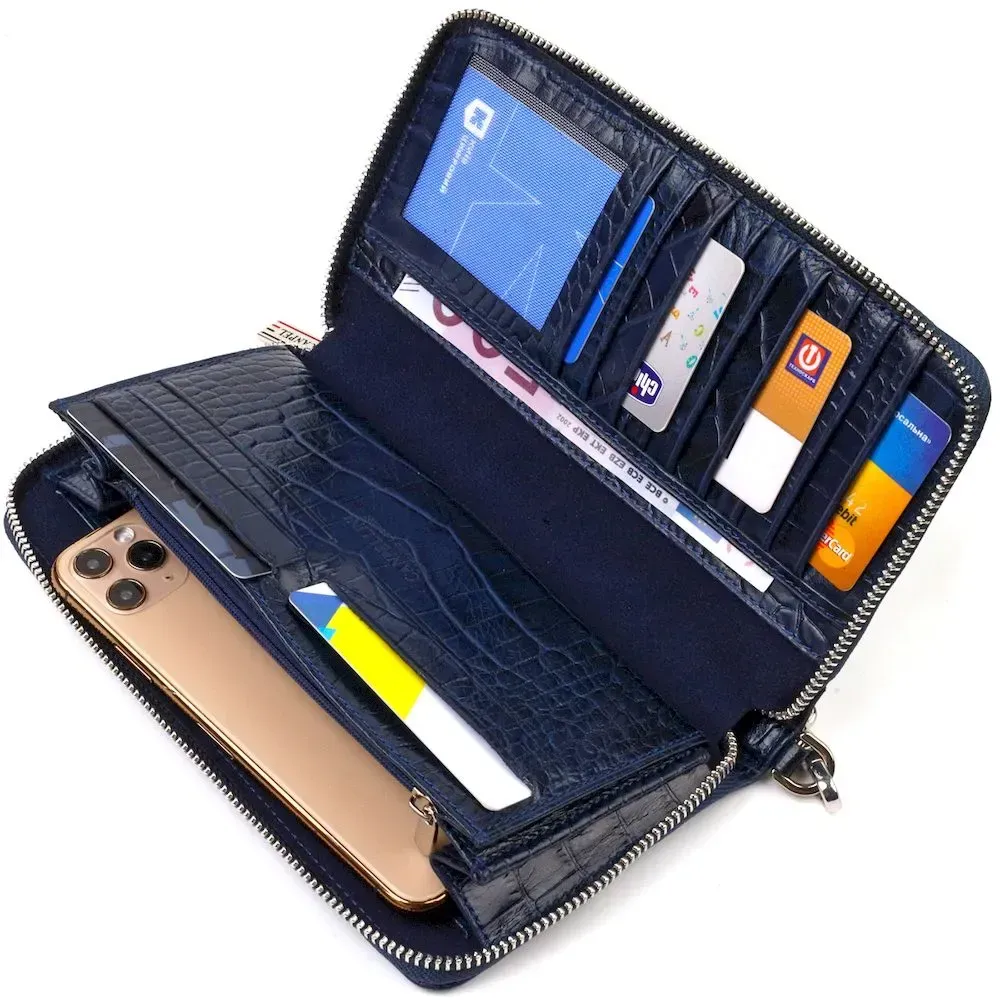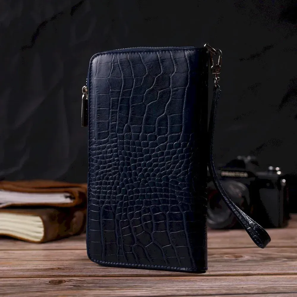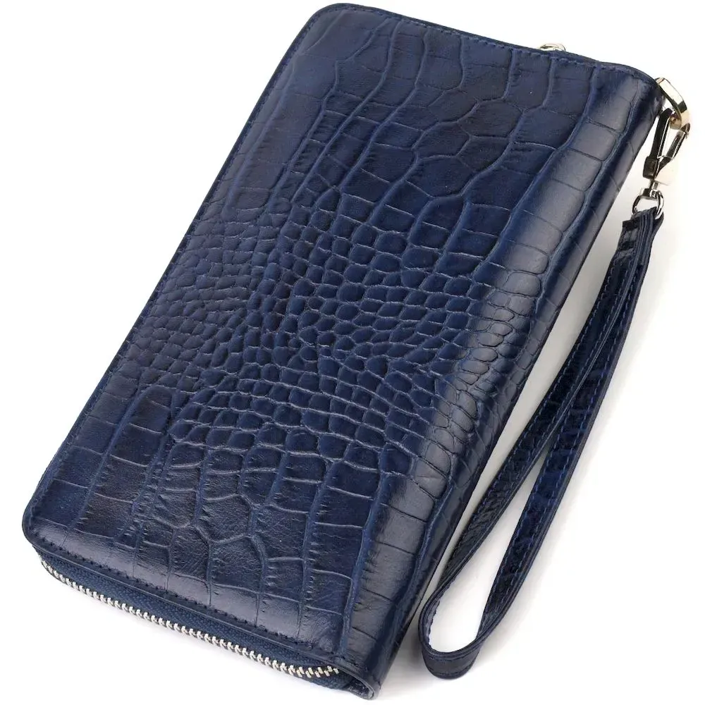 Чудовий і зручний жіночий клатч з натуральної фактурної шкіри, з тисненням під крокодила. Аксесуар має велике відділення для купюр, 15 осередків для карток (одна під сіточкою), кишеню-перегородку на блискавці, три прилеглі кишені, кишеню з розширювачем на блискавці зовні та тримач для ручки. Носити цю модель зручно в руці або за допомогою знімного кистьового ременя. Закривається аксесуар на блискавку. Купуючи шкіряний аксесуар цієї фірми собі або на подарунок, будьте певні, що він радуватиме око не один рік.