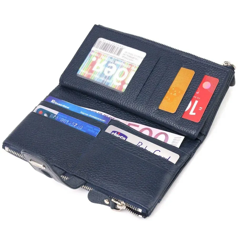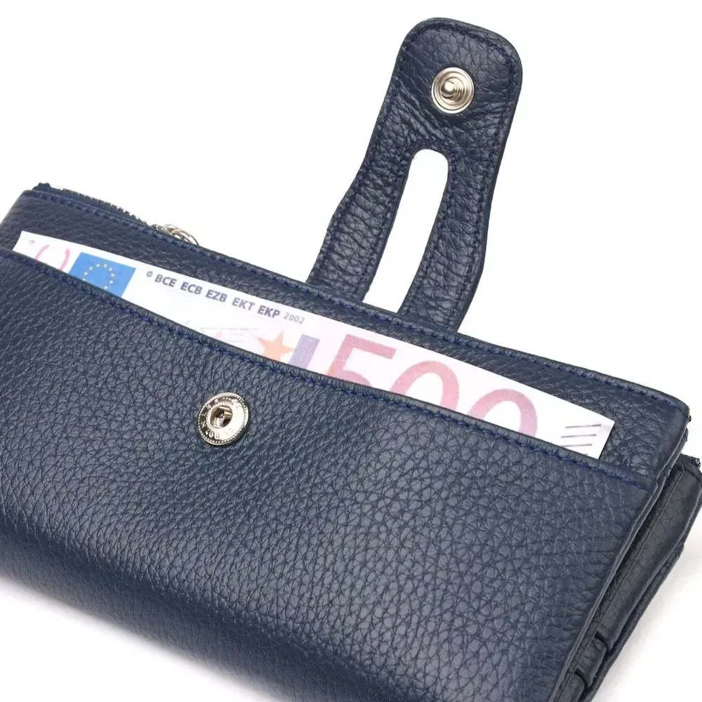Практичний жіночий гаманець з натуральної зернистої шкіри. Аксесуар має два широкі основні відділення, в які поміщаються купюри всіх номіналів, дві монетниці, двадцять чотири кишені для карток, дві відкриті кишені зовні та одне прозоре віконце для документів. Закривається аксесуар хлястиком на кнопку. Якщо Ви хочете порадувати себе та здивувати близьких, то неодмінно купуйте шкіряні аксесуари в нашому магазині, якість і ціна Вас однозначно порадує.