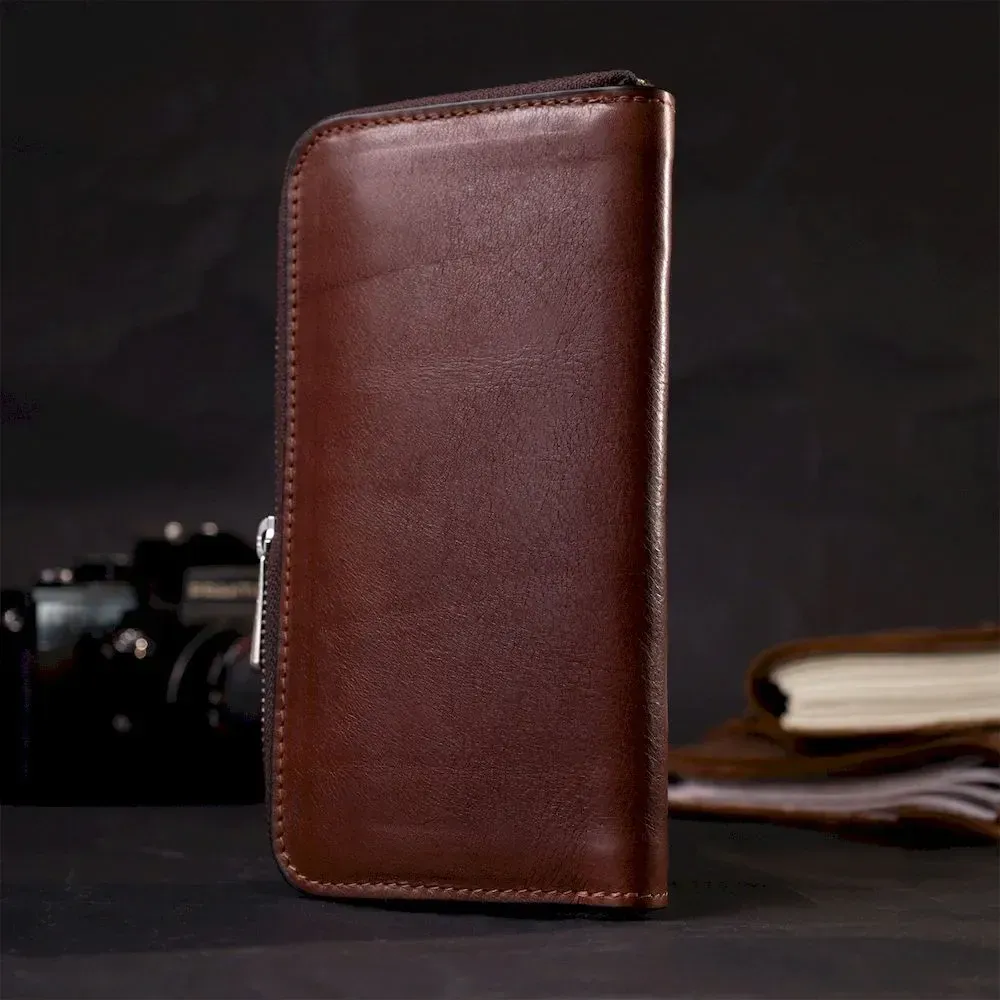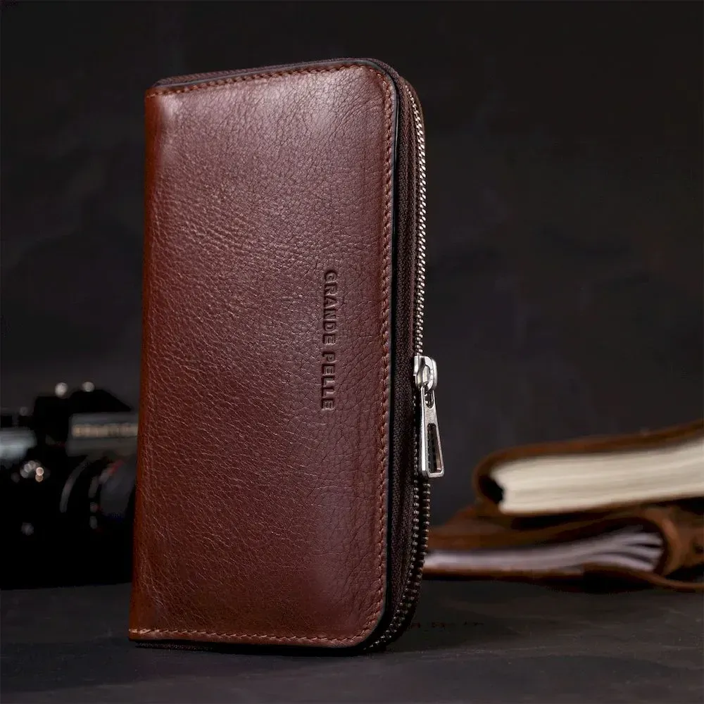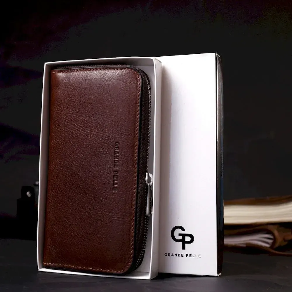 Зручний гаманець-клатч на блискавці з натуральної шкіри GRANDE PELLE 11659 Коричневий