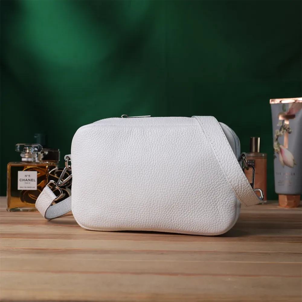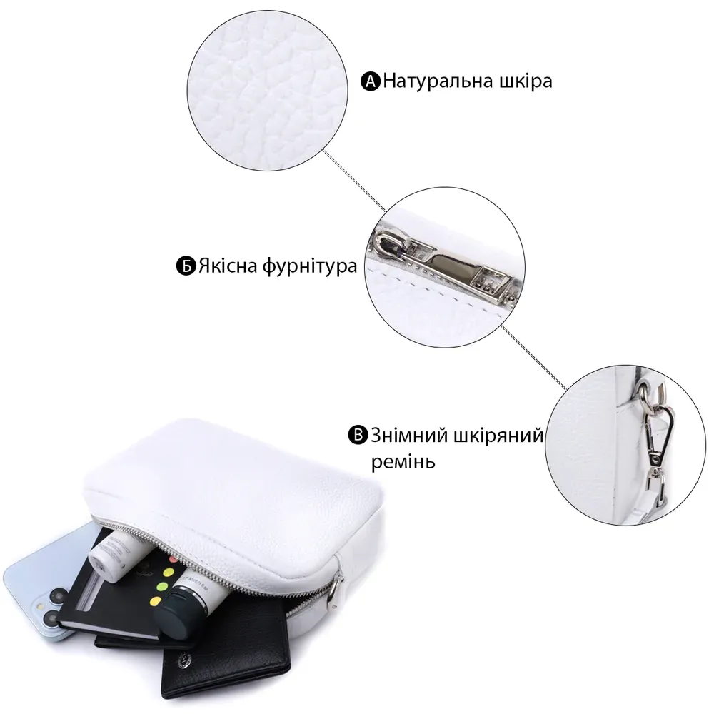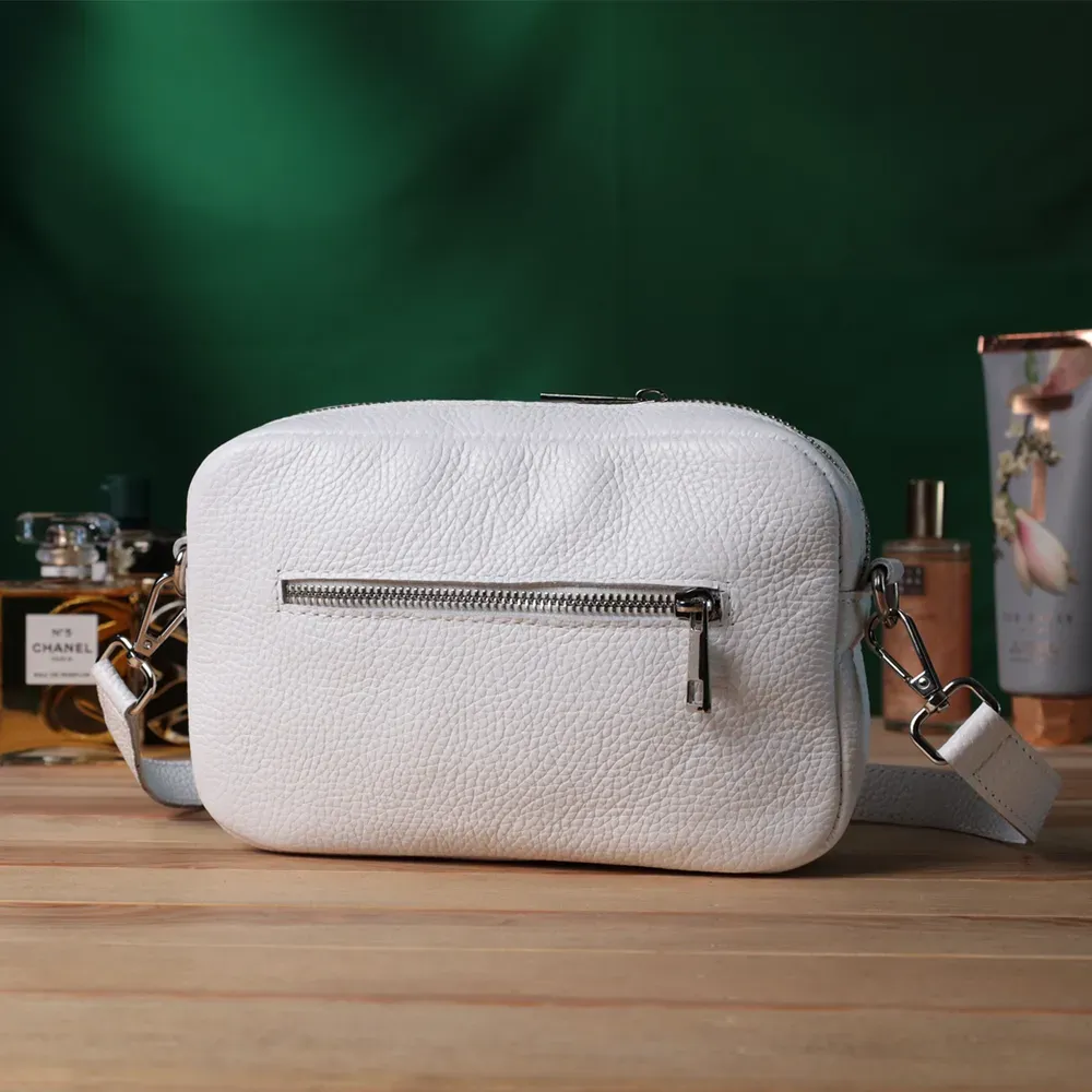 Стильна жіноча сумка, яку можна носити через плече як крос-боді, на плечі і як клатч в руках, для цього ремінець легко відстібається. Виріб виконаний у стильному білому кольорі із зернистої натуральної шкіри стійкою до подряпин. Шкіра м'яка, приємна на дотик із високими показниками зносостійкості. Відмінний варіант як кожного дня, так і на вечір. Сумка добре тримає форму, має міцну підкладку, фурнітура срібного кольору – стійка не змінює свій колір у процесі носіння. Аксесуар чудово поєднується з усіма стилями в одязі та може стати чудовим подарунком на будь-яке свято.