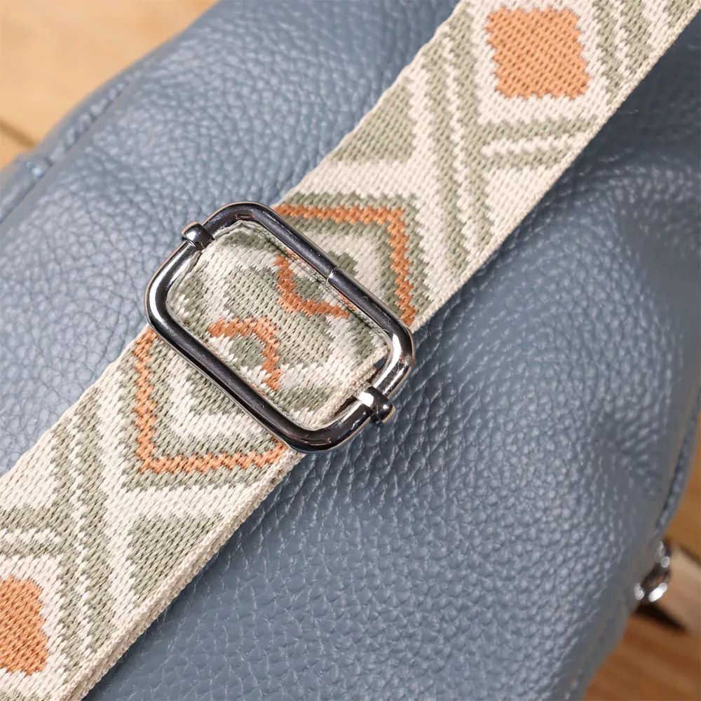 На особливу увагу заслуговує регульований текстильний ремінь з яскравим стильним візерунком - він не тільки забезпечує комфортну посадку на тілі, але і стає виразним елементом дизайну. Ремінь незнімний, але легко регулюється під ваше зростання і спосіб носіння. Фурнітура виконана в сріблястому кольорі, що надає аксесуару сучасний і стриманий блиск, який чудово поєднується з текстурою шкіри та акцентами ременя.