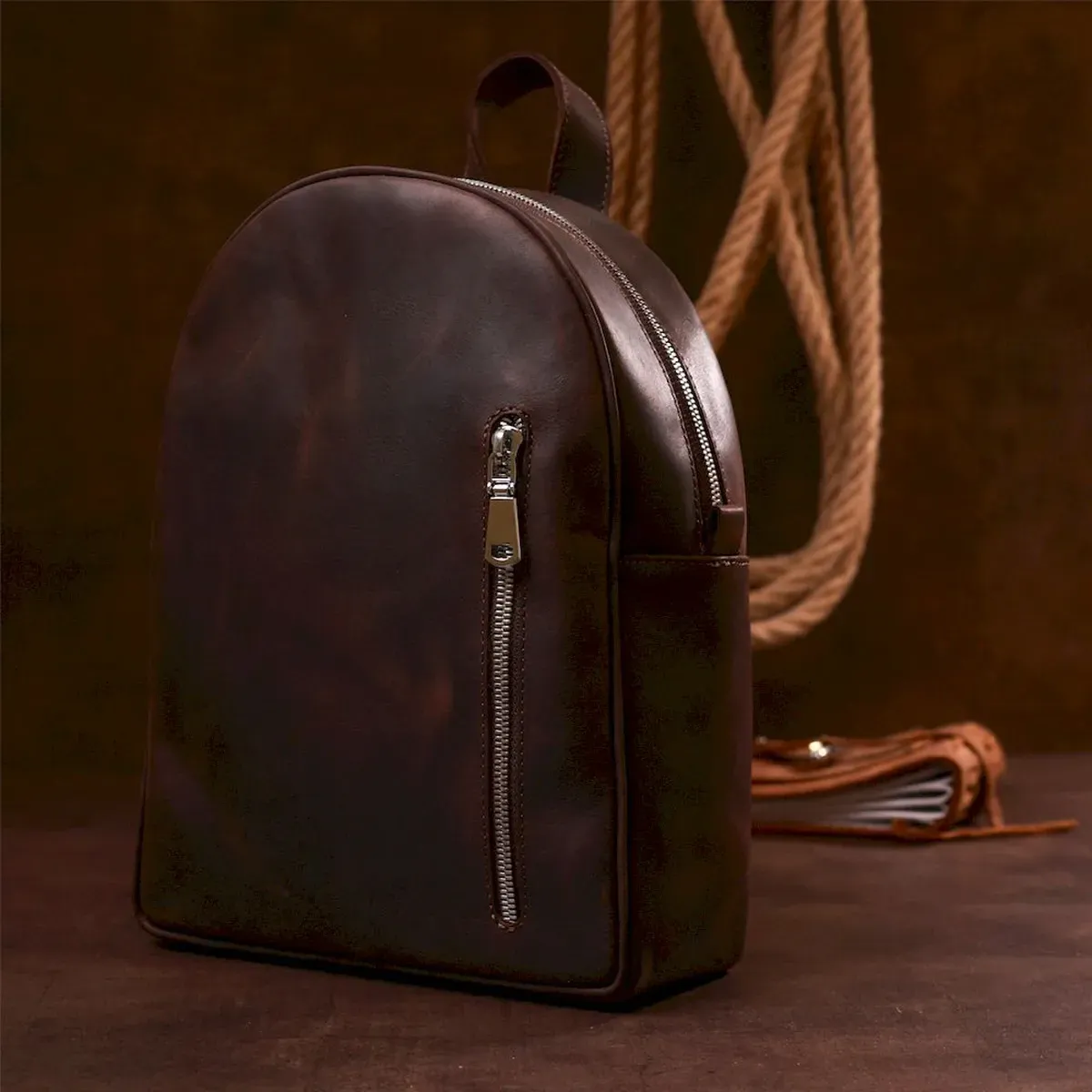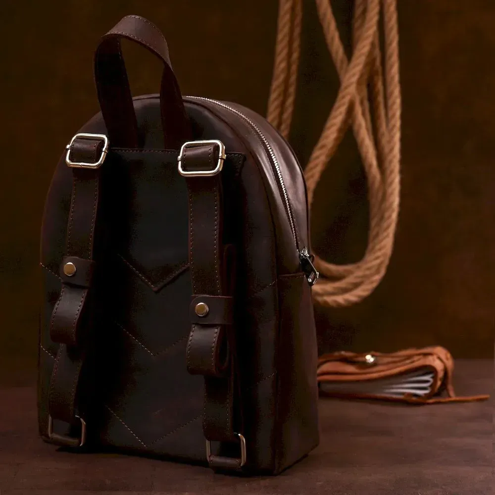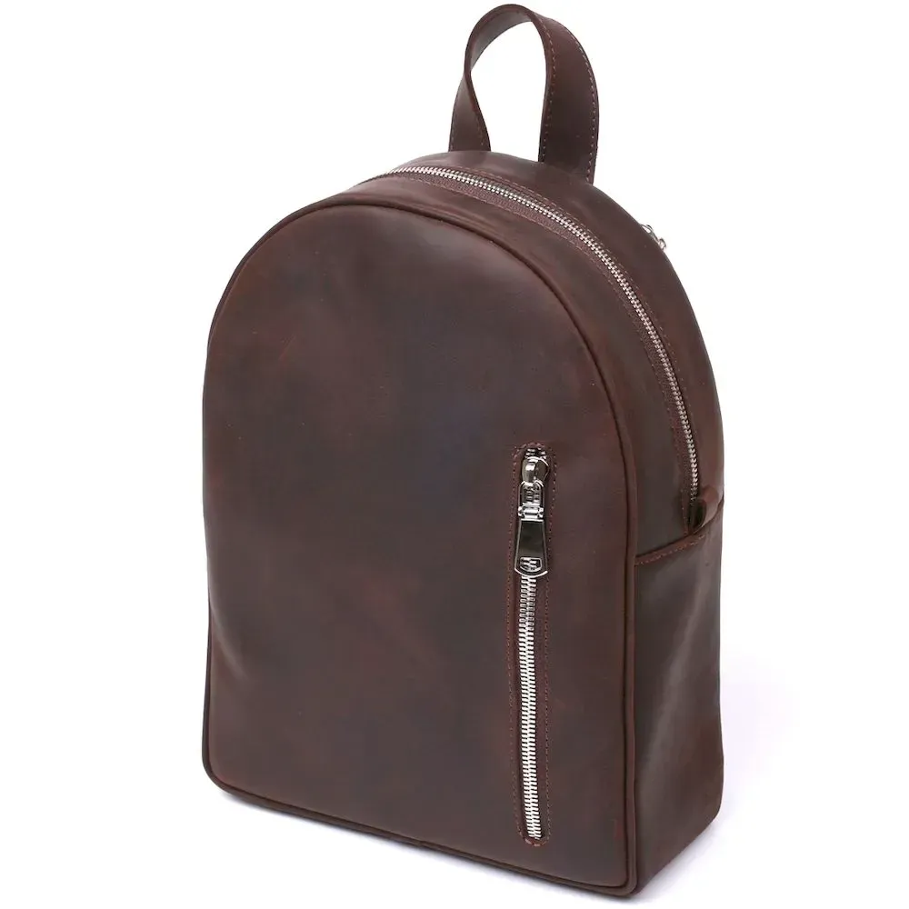Стильний та практичний жіночий рюкзак невеликого розміру для повсякденного використання. Матеріал виготовлення – натуральна міцна шкіра високої якості. Колір виробу – насичений коричневий, фактура – гладка vintage, що виглядає дуже красиво. Усередині є містке основне відділення та дві кишені, на зовнішній стороні також є вертикальна кишеня на блискавці.