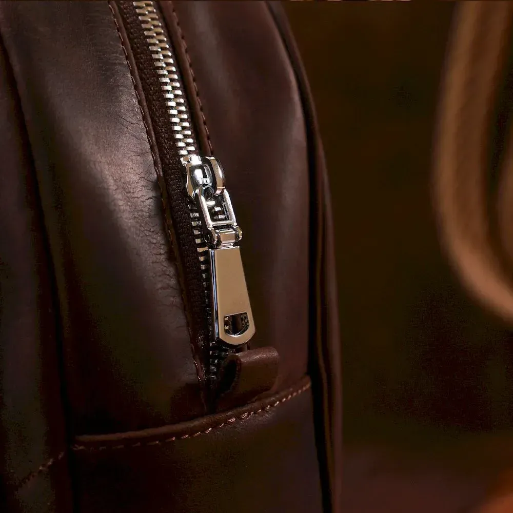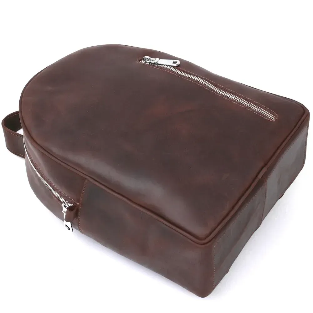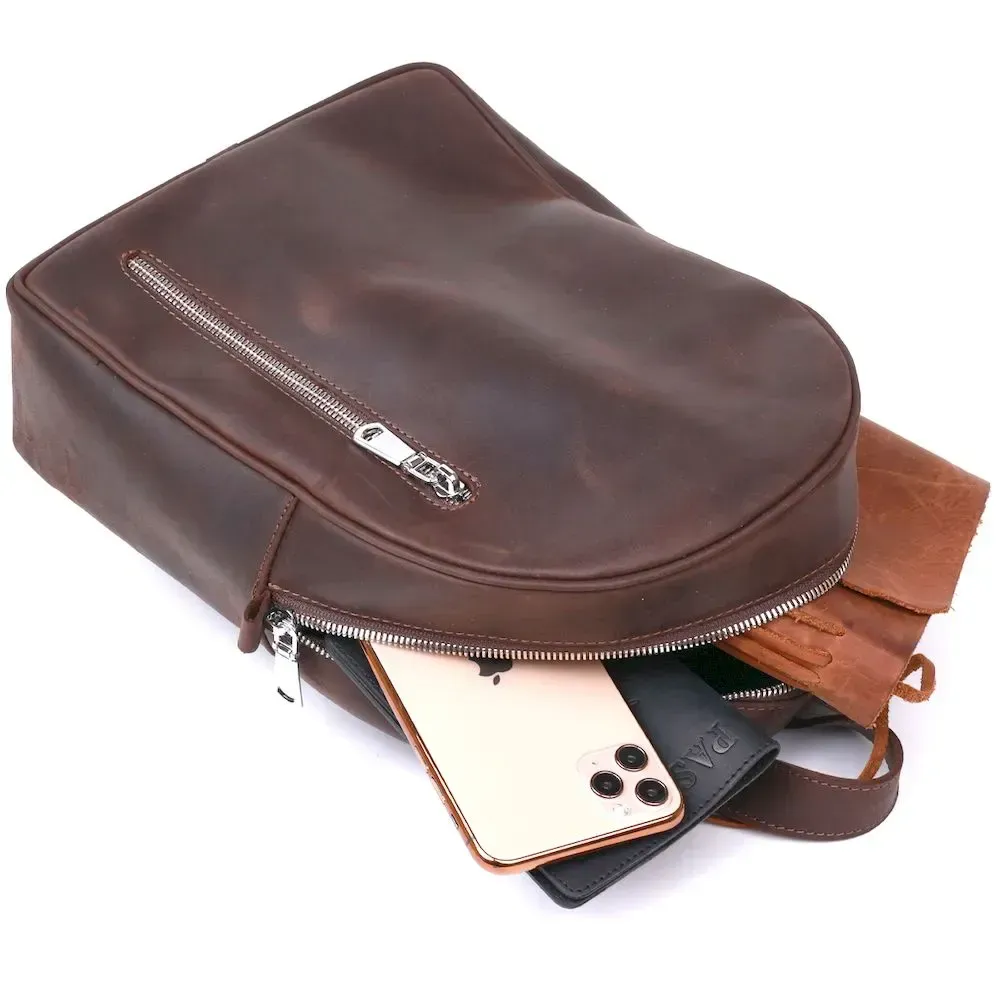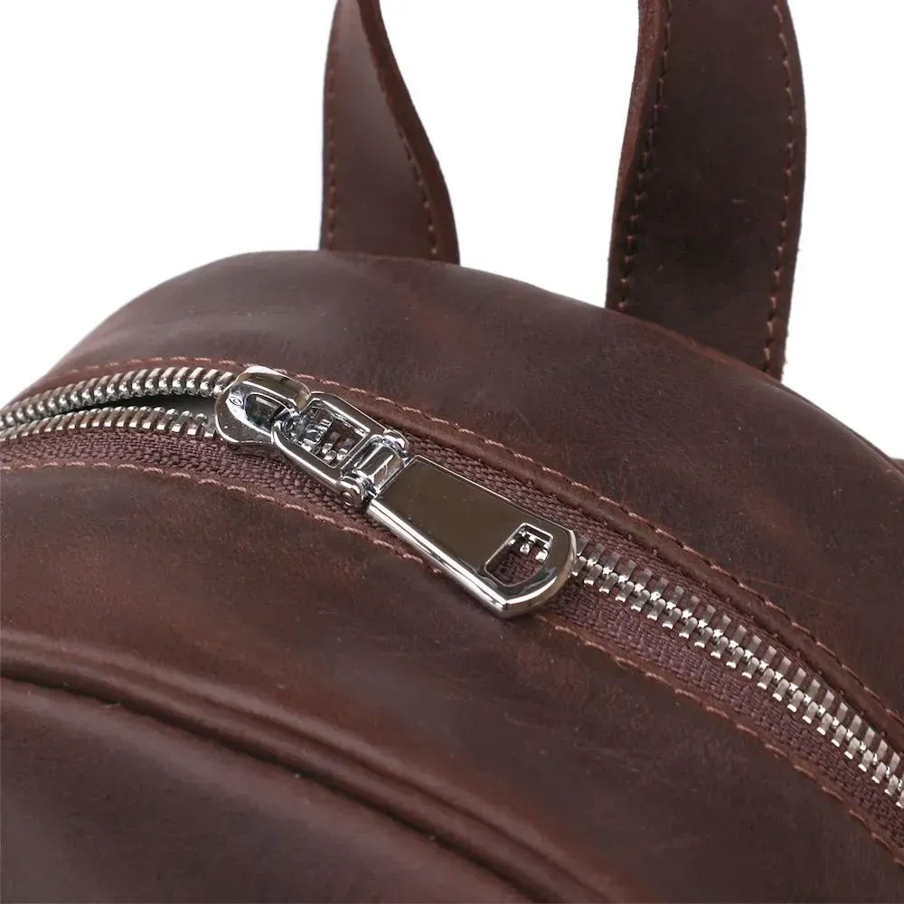 Стильний та практичний жіночий рюкзак невеликого розміру для повсякденного використання. Матеріал виготовлення – натуральна міцна шкіра високої якості. Колір виробу – насичений коричневий, фактура – гладка vintage, що виглядає дуже красиво. Усередині є містке основне відділення та дві кишені, на зовнішній стороні також є вертикальна кишеня на блискавці.