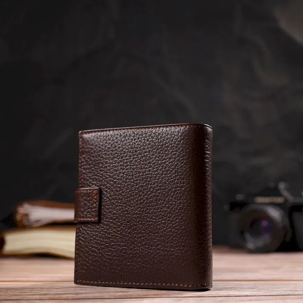 Практичний компактний чоловічий гаманець з натуральної зернистої шкіри. Аксесуар має основне відділення з перегородкою, п'ять відсіків для карток, дві прилеглі кишені, прозору кишеню для документів та монетницю. Закривається аксесуар хлястиком на кнопку. Відмінний аксесуар від надійного виробника, який прослужить дуже довго.