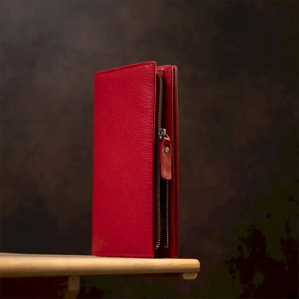 Жіночий шкіряний гаманець у класичний та практичний дизайн. Має красивий насичений червоний колір та зернисту матову фактуру шкіри. Усередині розмістилися зручні відділення для купюр, монет, слоти для карт та інші кармани. Виконано виріб дуже якісно та надежно. Цей аксесуар стане чудовим подарунком для рідного людини на будь-яке свято.