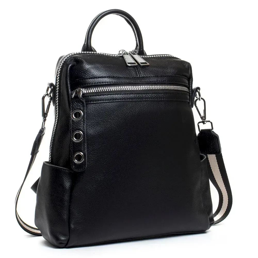 Жіноча сумка-рюкзак&Alex Rai. Виготовлена із натуральної м'якої шкіри. Можна носити на плечі широкому ремені. Закривається на блискавку. Усередині знаходиться основне та додаткове відділення, розділене кишенею-перегородкою на блискавці та кишеню на блискавці. Зовні рюкзака на фасаді та на звороті розташовані кишені на блискавці. На торцях рюкзака є невеликі відкриті кишені. Плямові лямки регулюються по довжині.