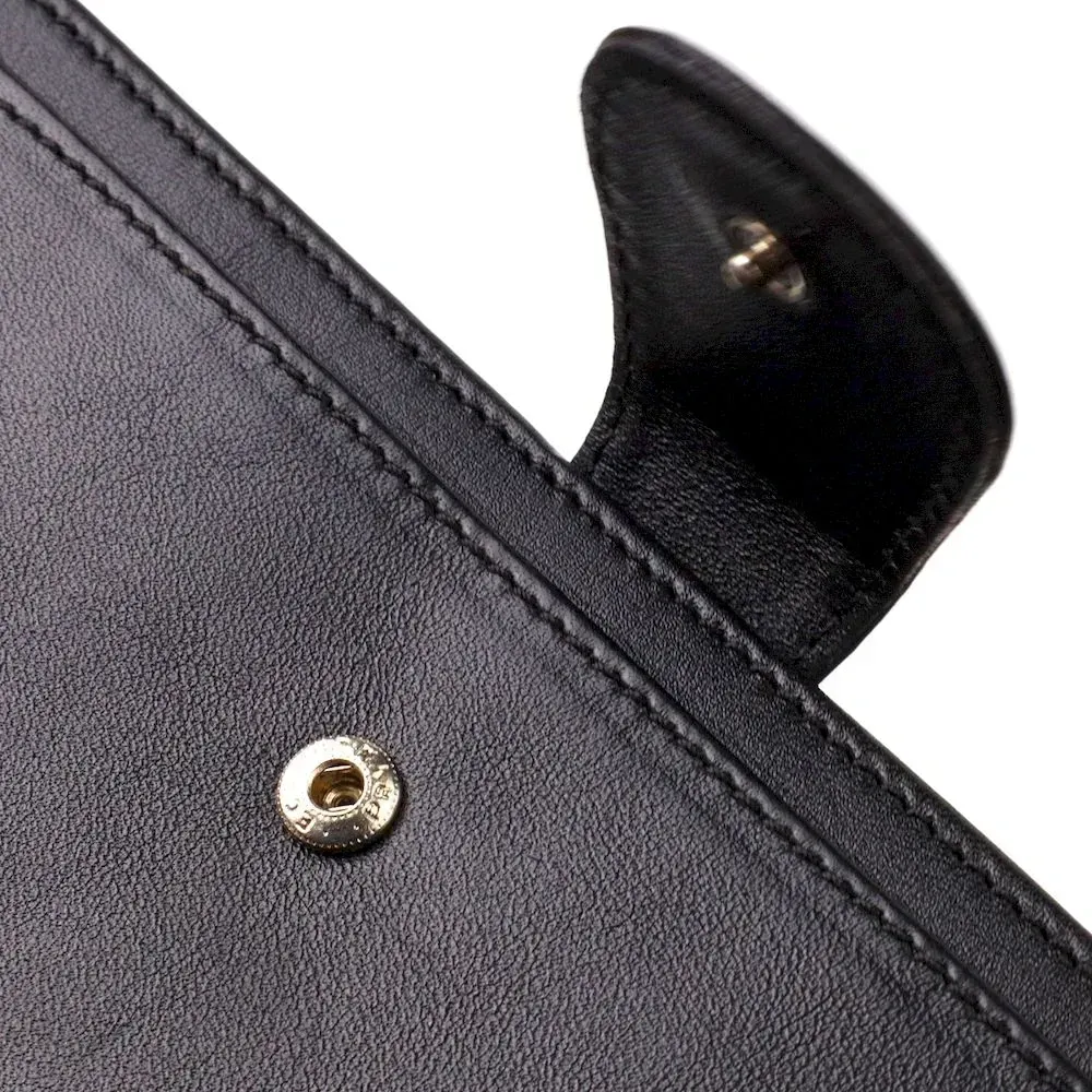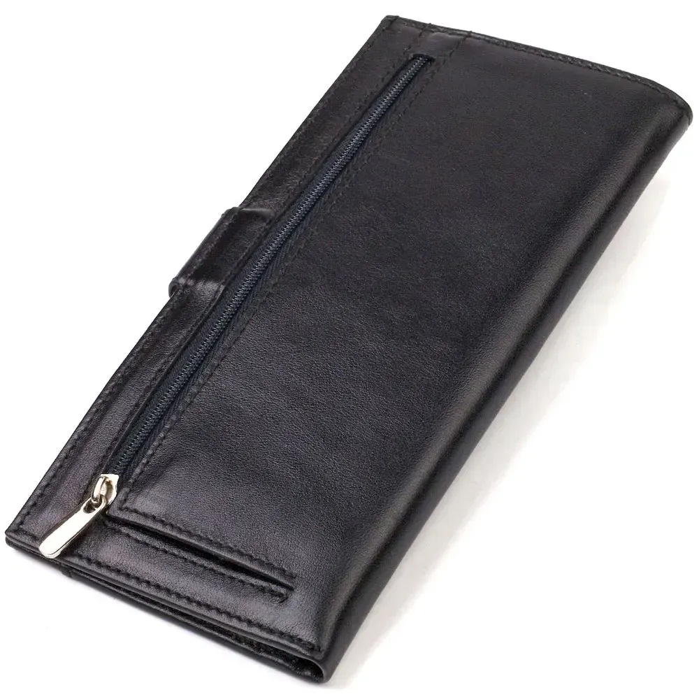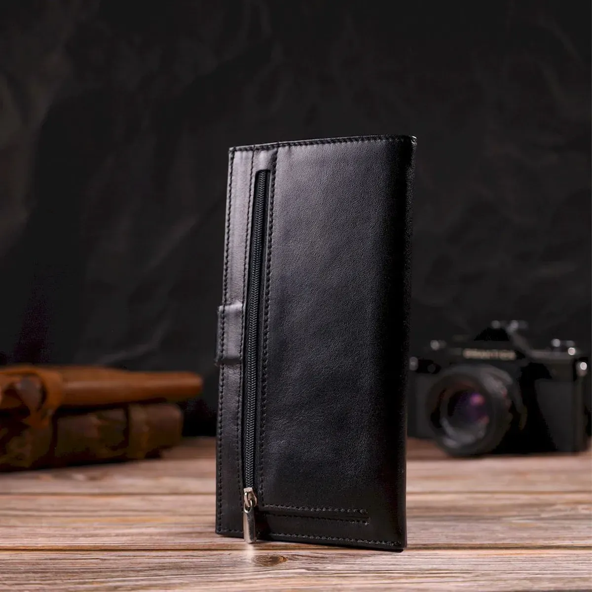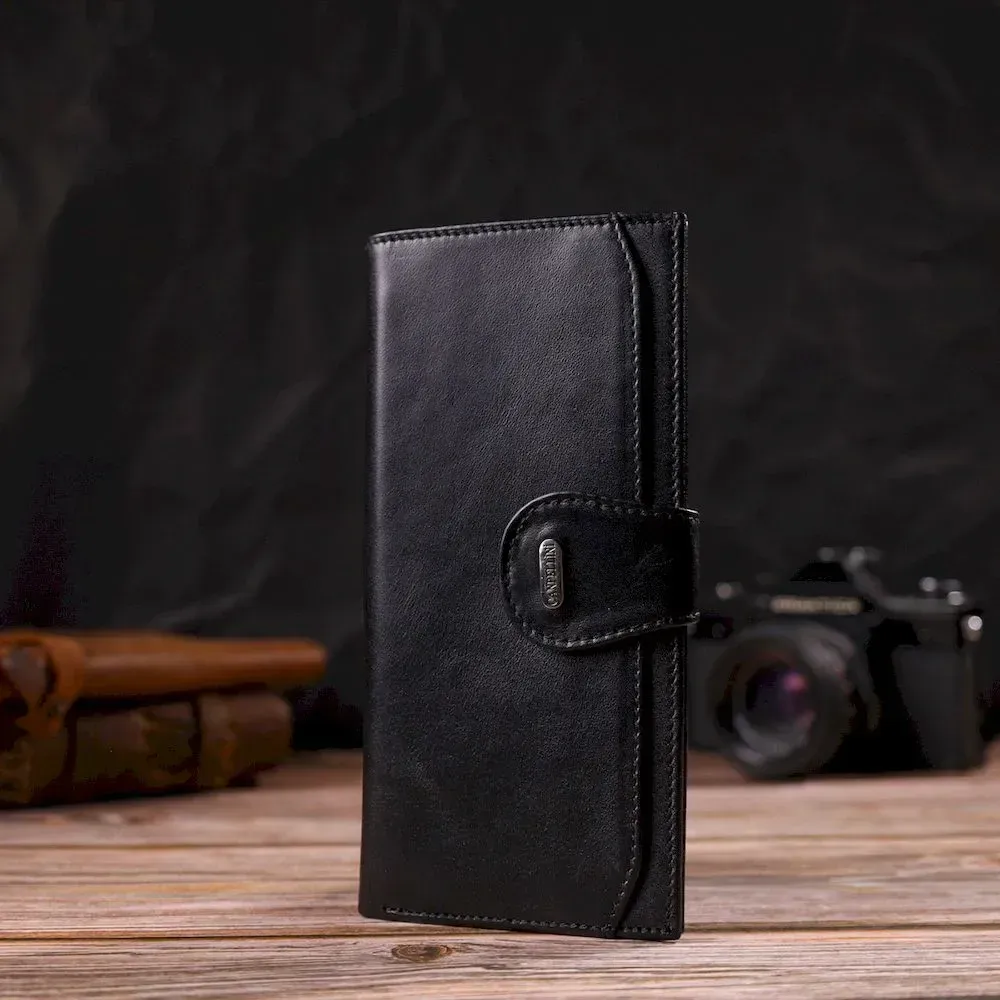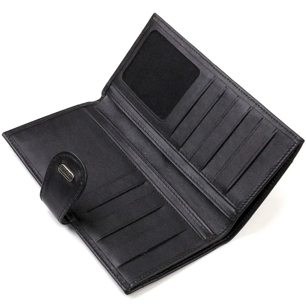 Оригінальний чоловічий гаманець з натуральної гладкої шкіри. Аксесуар має одне основне вертикальне відділення для купюр усіх номіналів, одинадцять осередків для карток, кишеню під сіточкою для пропуску, п'ять прилеглих кишень та монетницю. Закривається аксесуар навпіл хлястиком на кнопку. Купуючи шкіряний аксесуар цієї фірми, собі чи на подарунок, будьте певні, що він прослужить Вам не один рік.