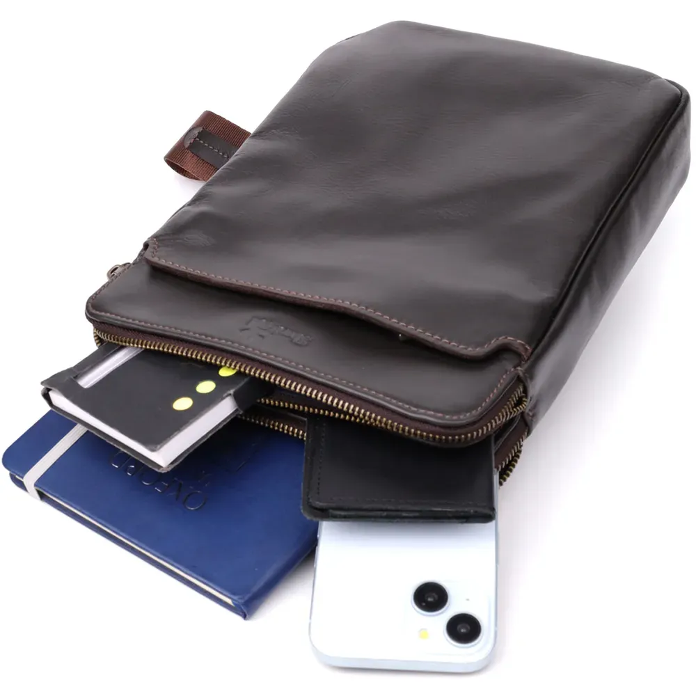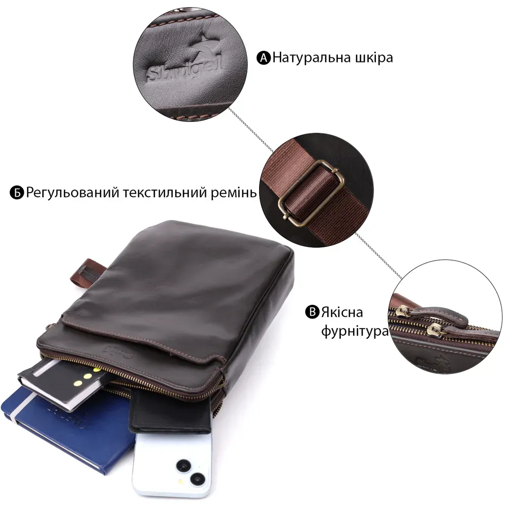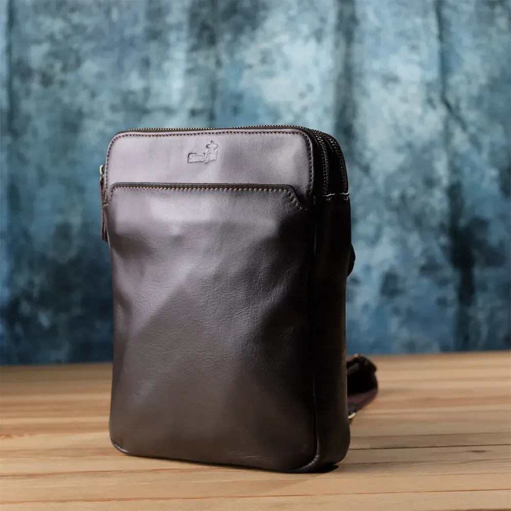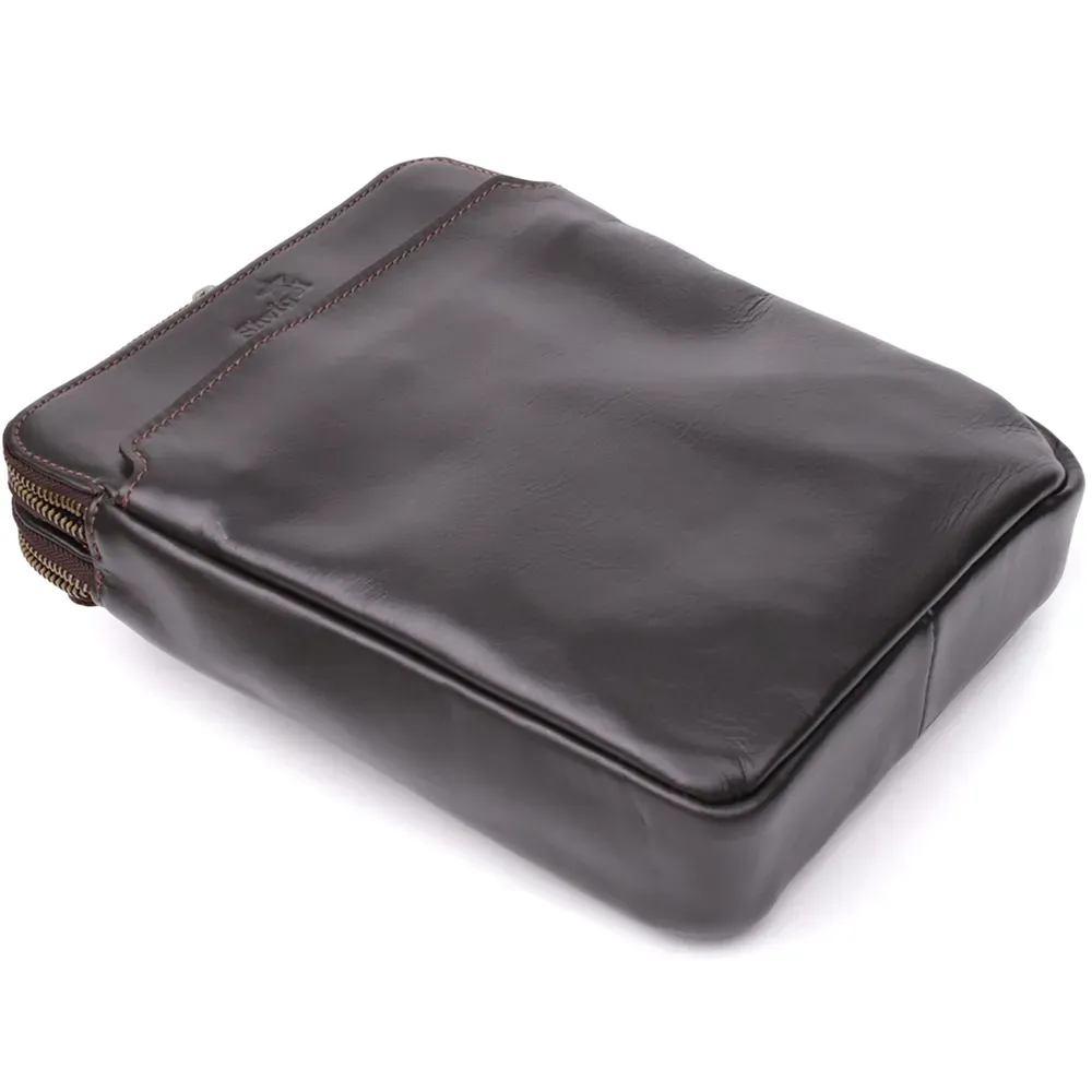 Чоловіча вертикальна сумка від українського бренду SHVIGEL виготовлена з натуральної гладкої коричневої шкіри. Мінімалістичний дизайн та акуратне оздоблення підкреслюють елегантність та статус власника.