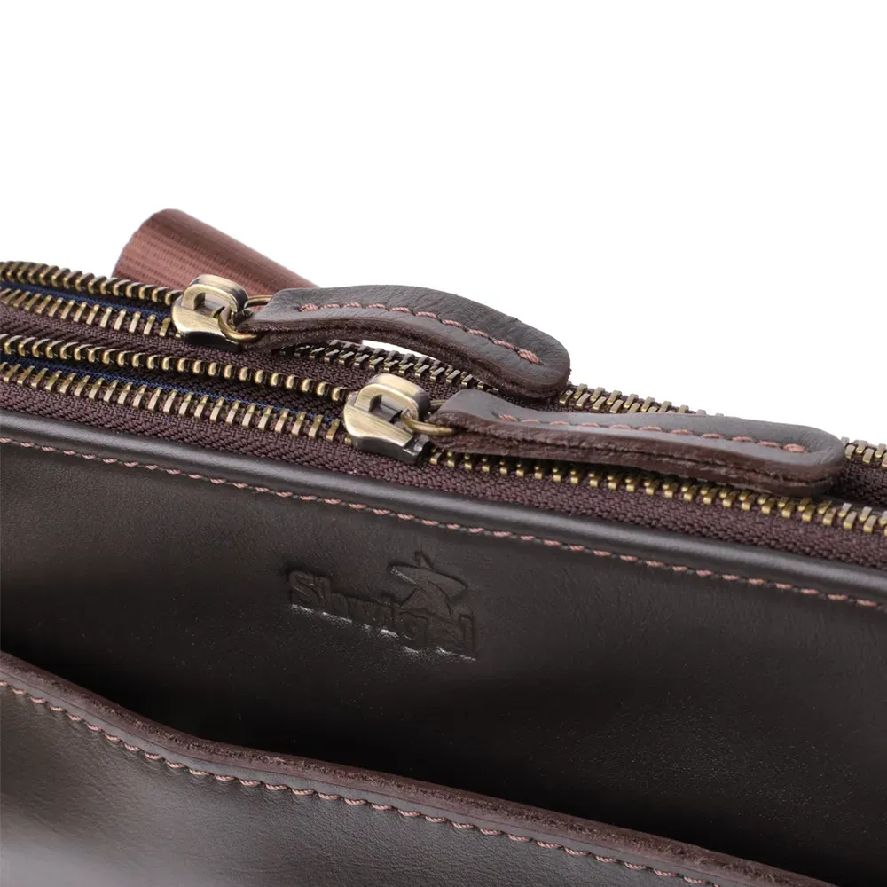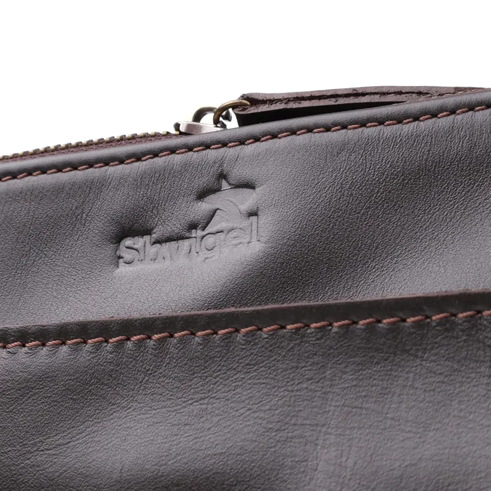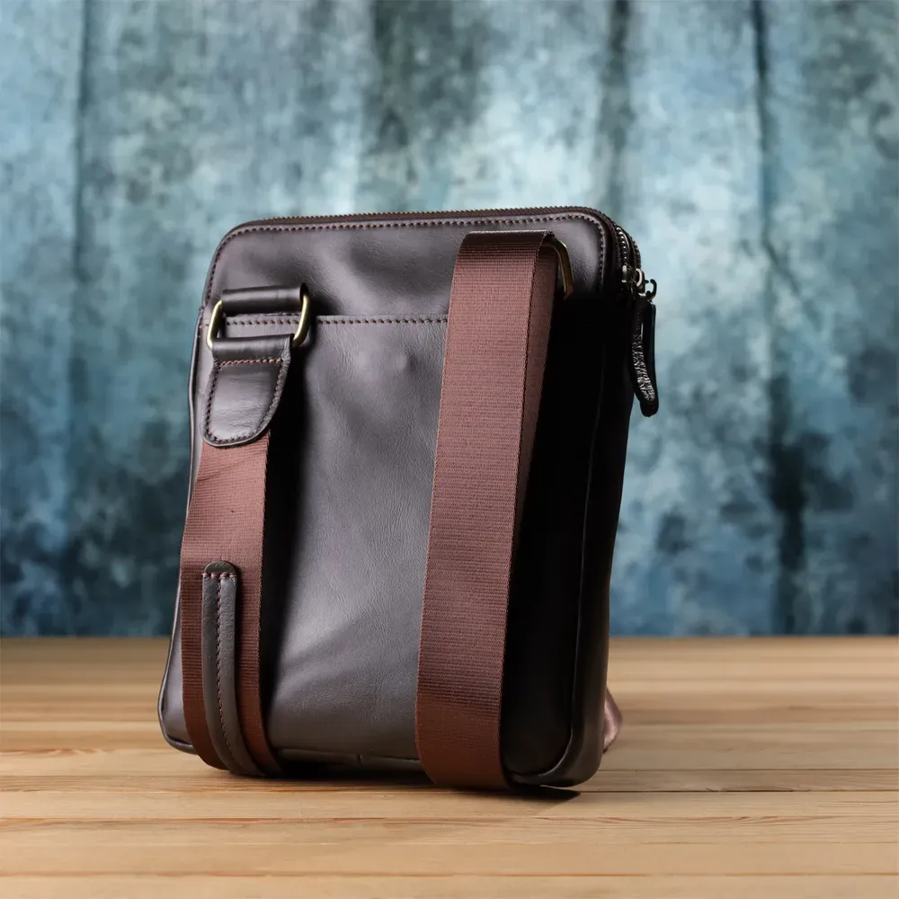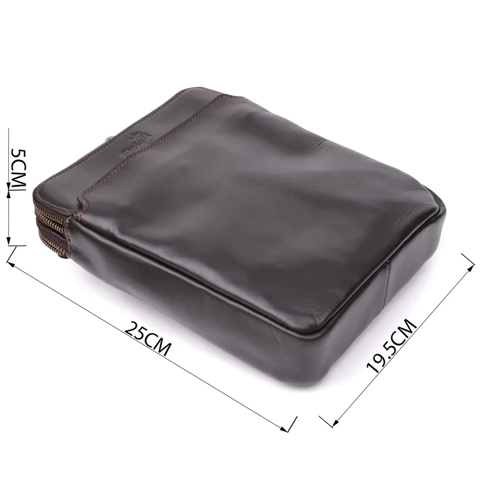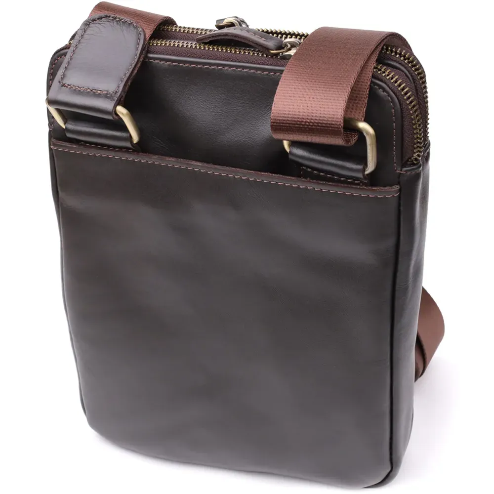 Чоловіча вертикальна сумка від українського бренду SHVIGEL виготовлена з натуральної гладкої коричневої шкіри. Мінімалістичний дизайн та акуратне оздоблення підкреслюють елегантність та статус власника.