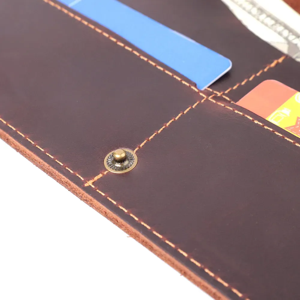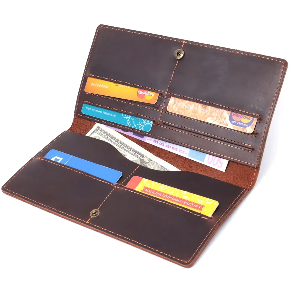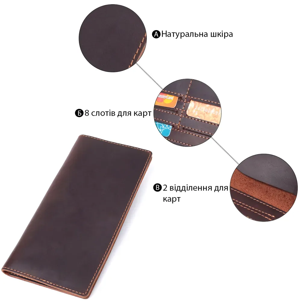 Стильний гаманець для ділових чоловіків з натуральної шкіри в коричневому кольорі. Портмоне доповнено надійною фурнітурою, без підкладки. Вироби з натуральної шкіри завжди будуть чудовим подарунком для близької людини.