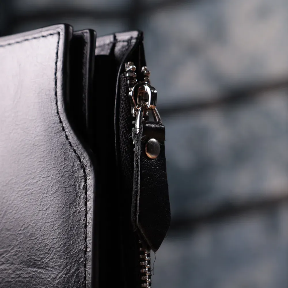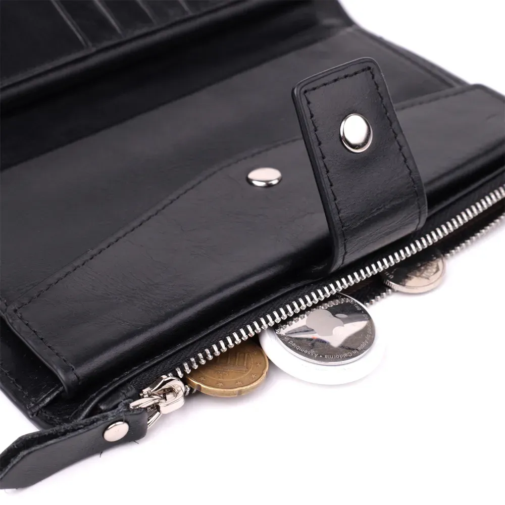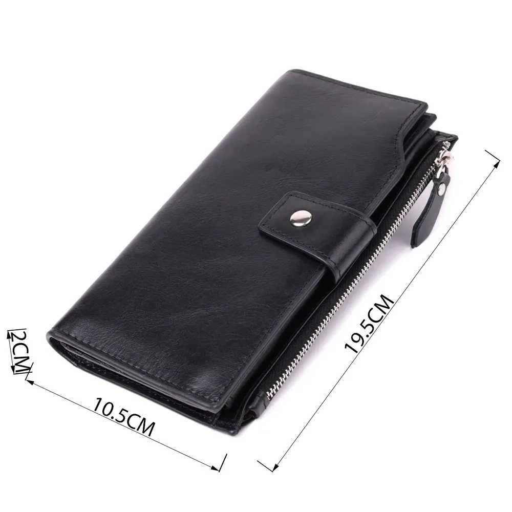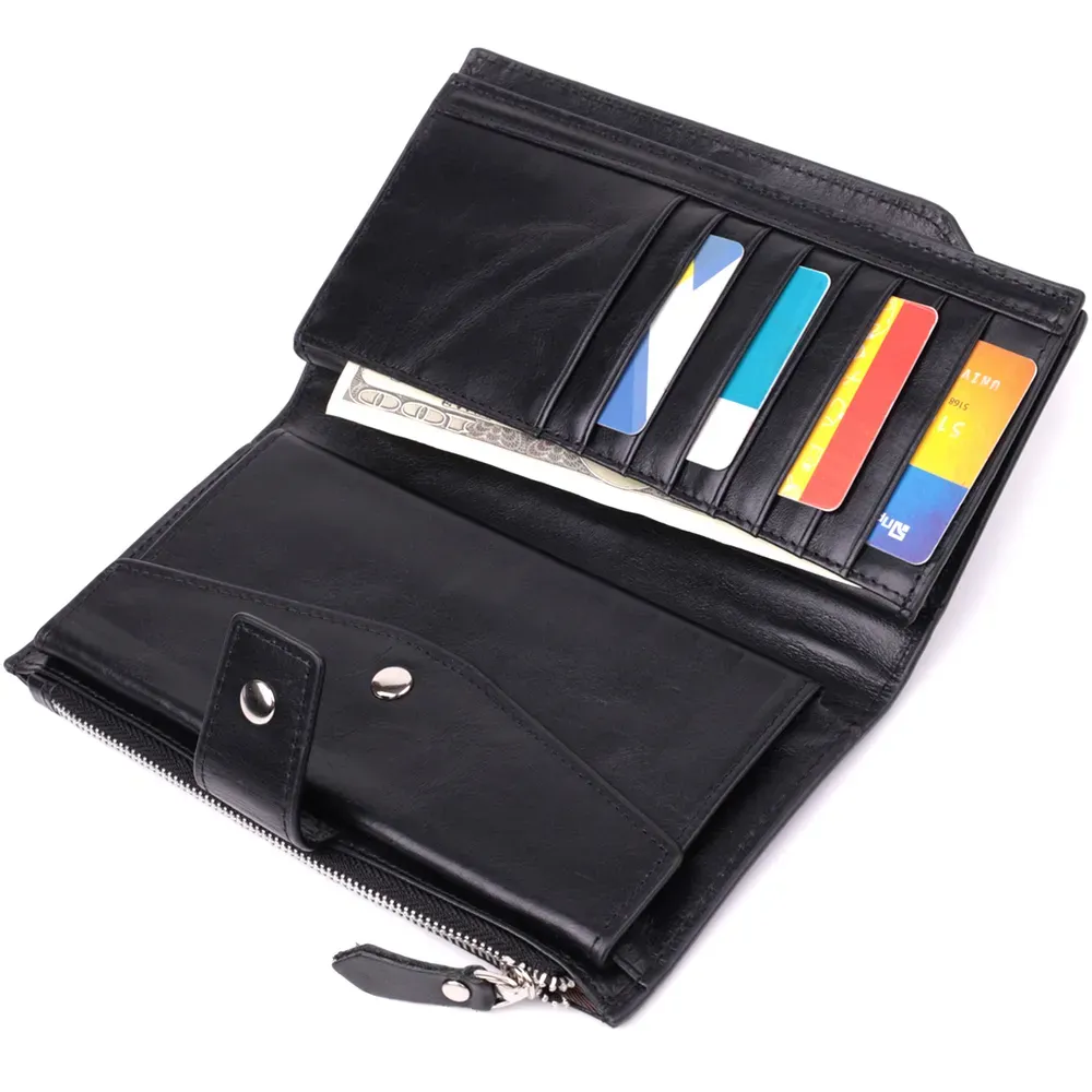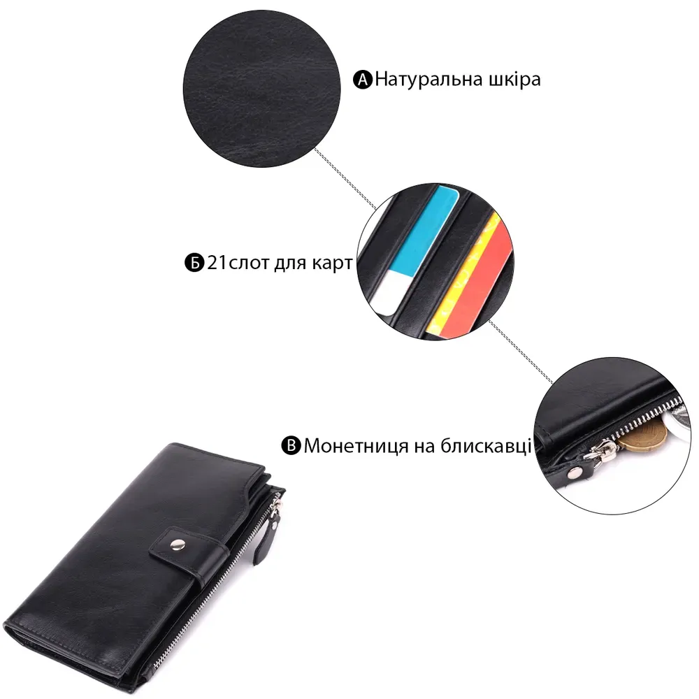 Універсальне портмоне як для чоловіка, так і для жінки у класичному чорному кольорі з невимушеним дизайном. Аксесуар виготовлений з якісної натуральної шкіри, яка має вишуканий блиск і приємна на дотик. Тонкий і м'який на дотик гаманець має більш ніж достатньо осередків для кредиток, кишеньок для монет та відділення для купюр. Аксесуар дуже стильний і доповнений найнеобхіднішим функціоналом без зайвих деталей. Це портмоне, ідеальне поєднання практичності та витонченого стилю, що підкреслює Ваш смак та увагу до деталей.