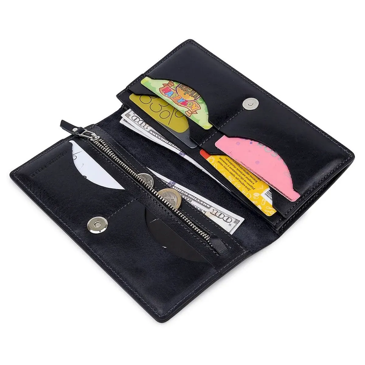 Відмінний гаманець із висококласної натуральної шкіри у гладкій глянсовій фактурі. Має універсальний темно-синій колір, тому підійде під будь-який гардероб. Внутрішнє наповнення представлене у вигляді містких відділень для банкнот, слотів для кредитних та візитних карток, а також монетниці на блискавці. Запакований аксесуар у фірмову коробку.