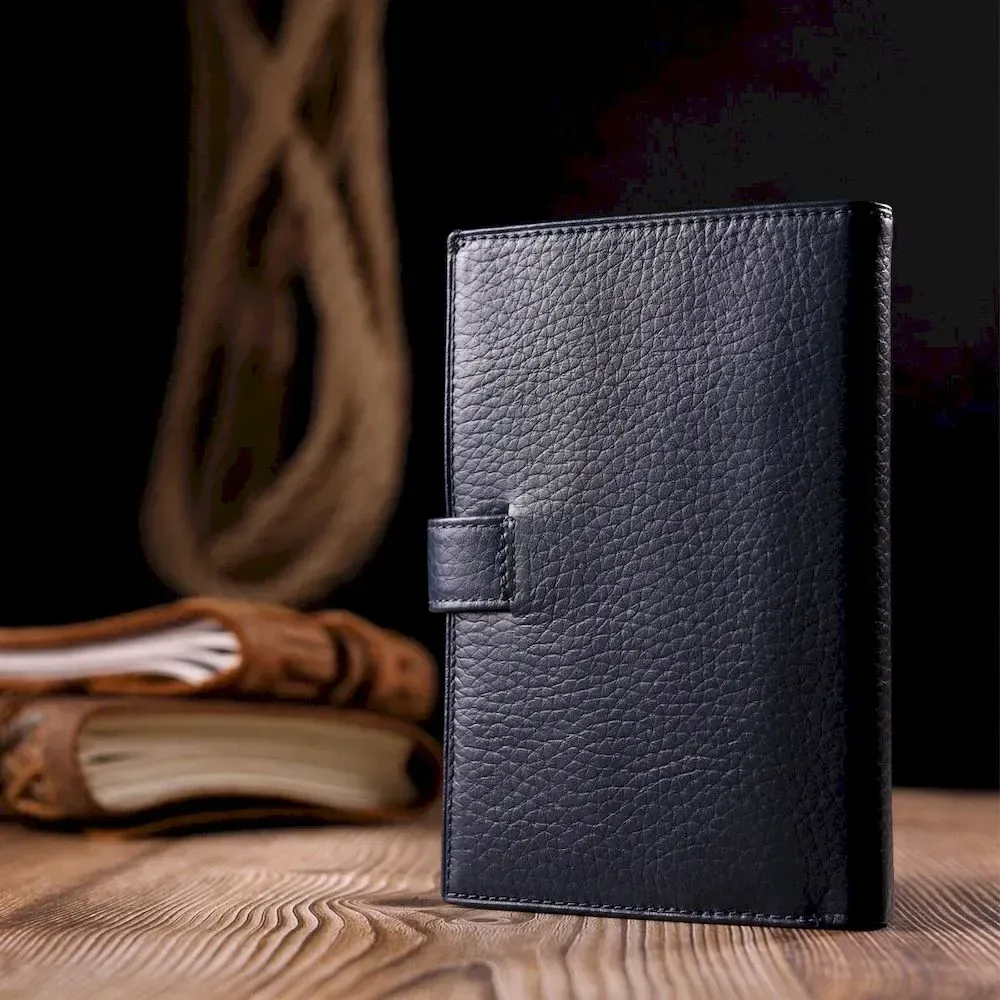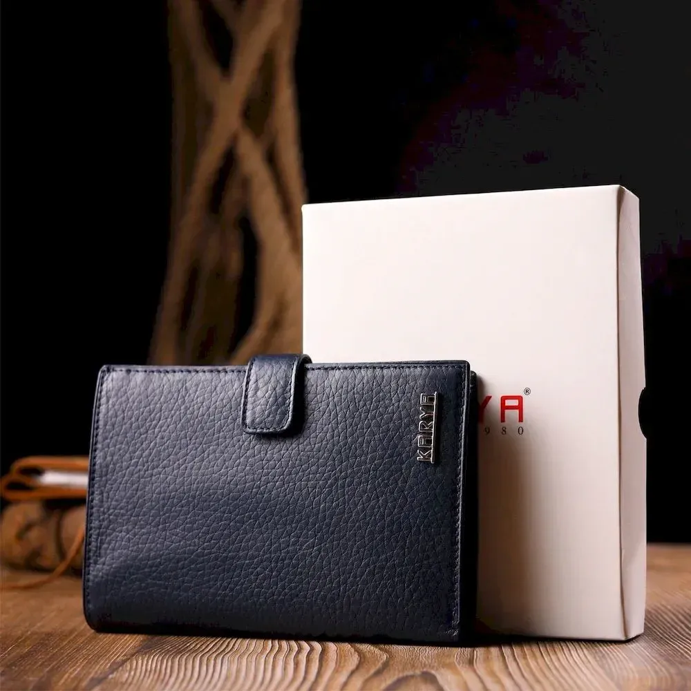 - виріб упакований у фірмову коробку. Універсальний чоловічий гаманець з натуральної шкіри, в синьому кольорі. Модель вертикального типу складається наполовину і закривається хлястиком на кнопку. Короткий дизайн, відмінно лягає в руку, поміщається в будь-яку сумку. Аксесуар упакований у фірмову коробочку. Вироби з натуральної шкіри завжди будуть чудовим подарунком для близької людини.