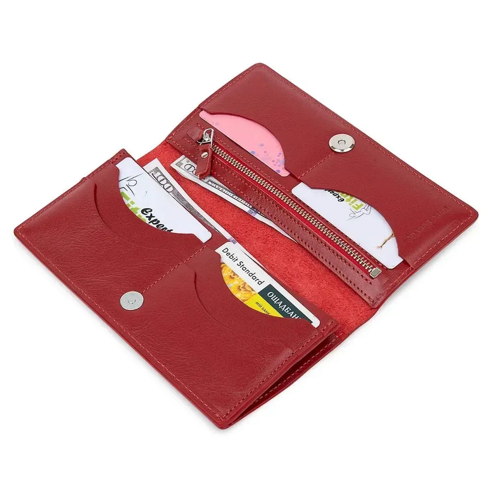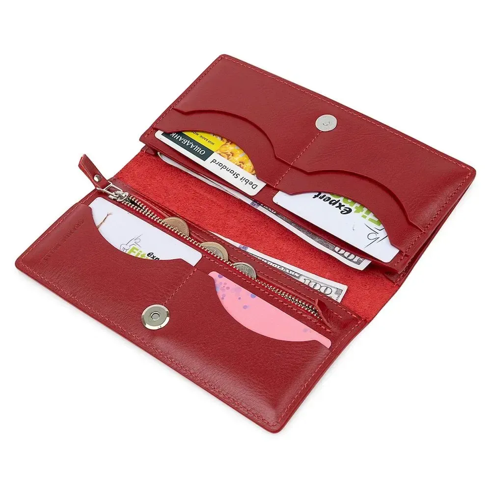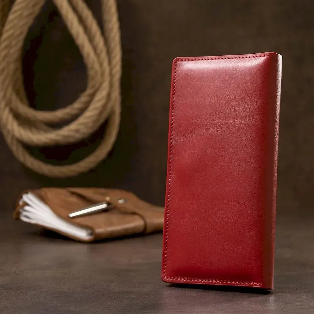 Цікаве жіноче вертикальне портмоне з високоякісної натуральної шкіри з відмінними експлуатаційними характеристиками. Має красивий насичений червоний колір та гладку глянсову фактуру. Всередині є місткі відділення для купюр, кредитних та візитних карток та кишеня на блискавці для дрібниці чи іншого. Запакований гаманець у фірмову коробку.