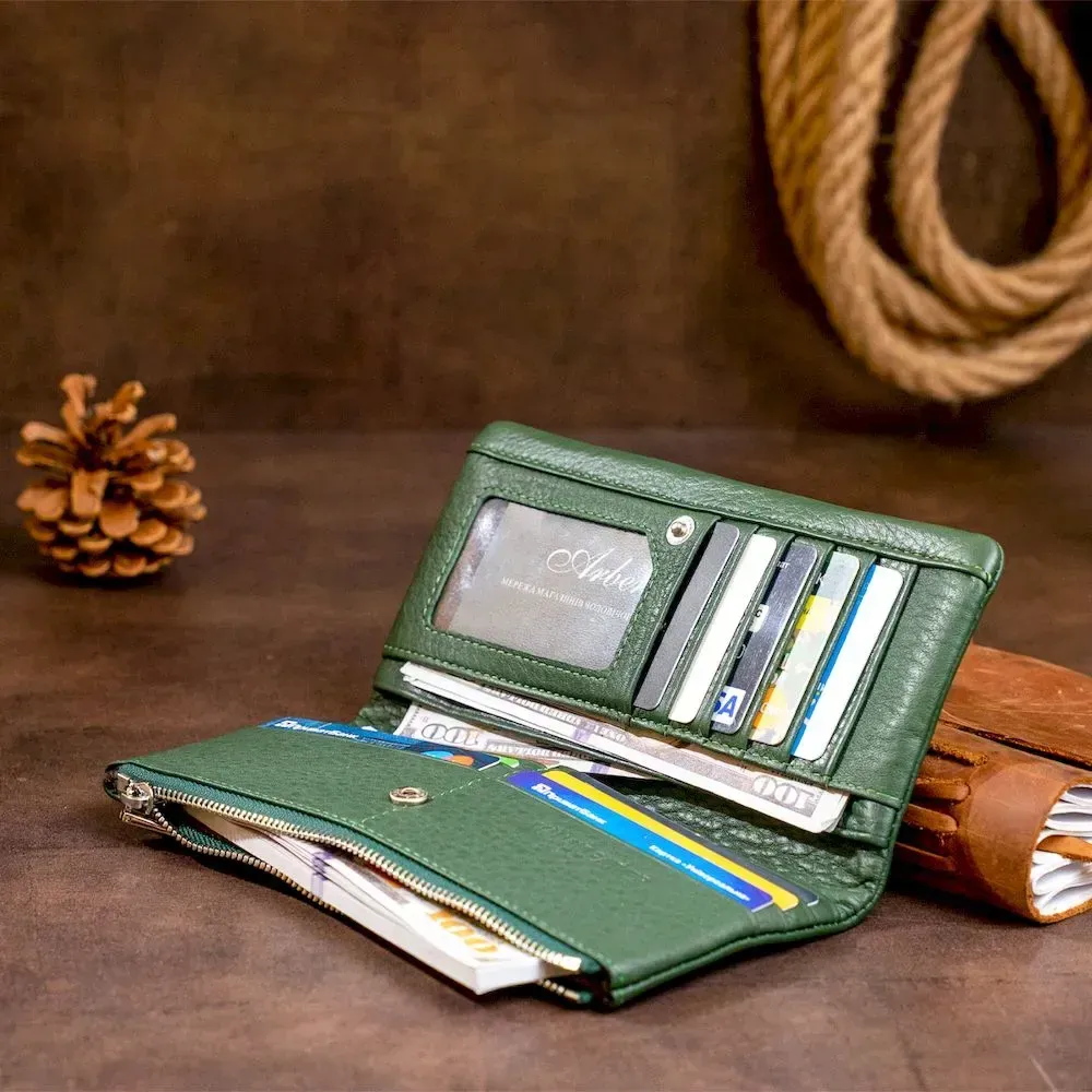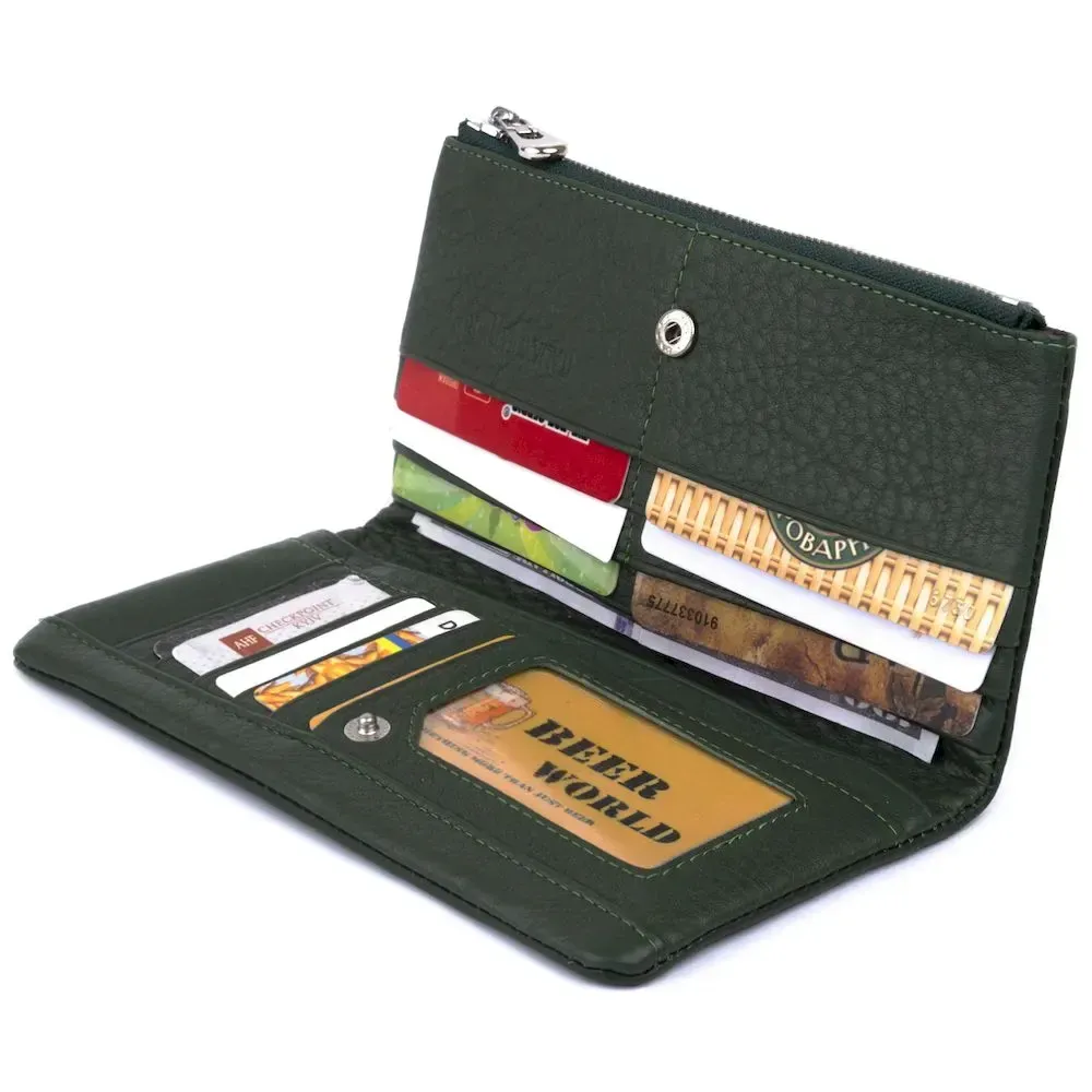 Вертикальний гаманець із натуральної шкіри благородного зеленого кольору. У бічній кишені на блискавці поміститься мобільний телефон невеликого розміру. Аксесуар має кишені як для купюр, так і для кредиток, що робить його більш універсальним у використанні. Виріб виготовлений виключно з натуральної шкіри китайського виробництва. У комплекті до гаманця йде фірмове картонне пакування. Виріб стане чудовим подарунком для ваших близьких.