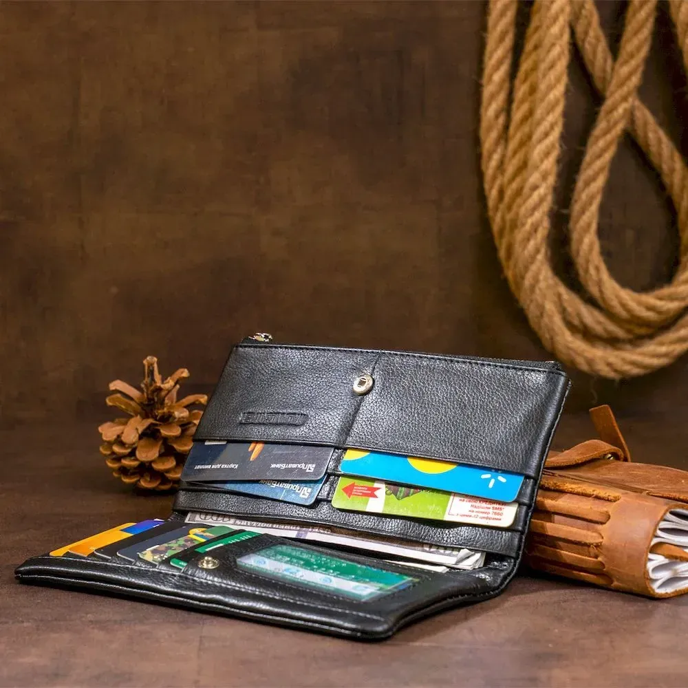 Нова модель гаманця з боковою кишенькою на блискавці для мобільного телефону чи інших особистих речей тепер і у класичному чорному кольорі. Універсальний колір не прив'язує вас до інших аксесуарів та палітри кольорів вашого гардеробу. Виріб компактний і поміститься в невелику сумку. Гаманець виконаний із 100% натуральної шкіри китайського виробництва. Функціонал моделі представлений трьома кишенями для купюр, осередками для кредиток. Закривається гаманець на кнопку. Укомплектована модель у фірмовій коробці білого кольору. Шкіряний вертикальний гаманець доступний на нашому сайті в різних кольорах: рожевому, ліловому, темно-синьому, червоному, зеленому, синьому, бордовому та чорному. Замовляйте у нас за найдоступнішою ціною.