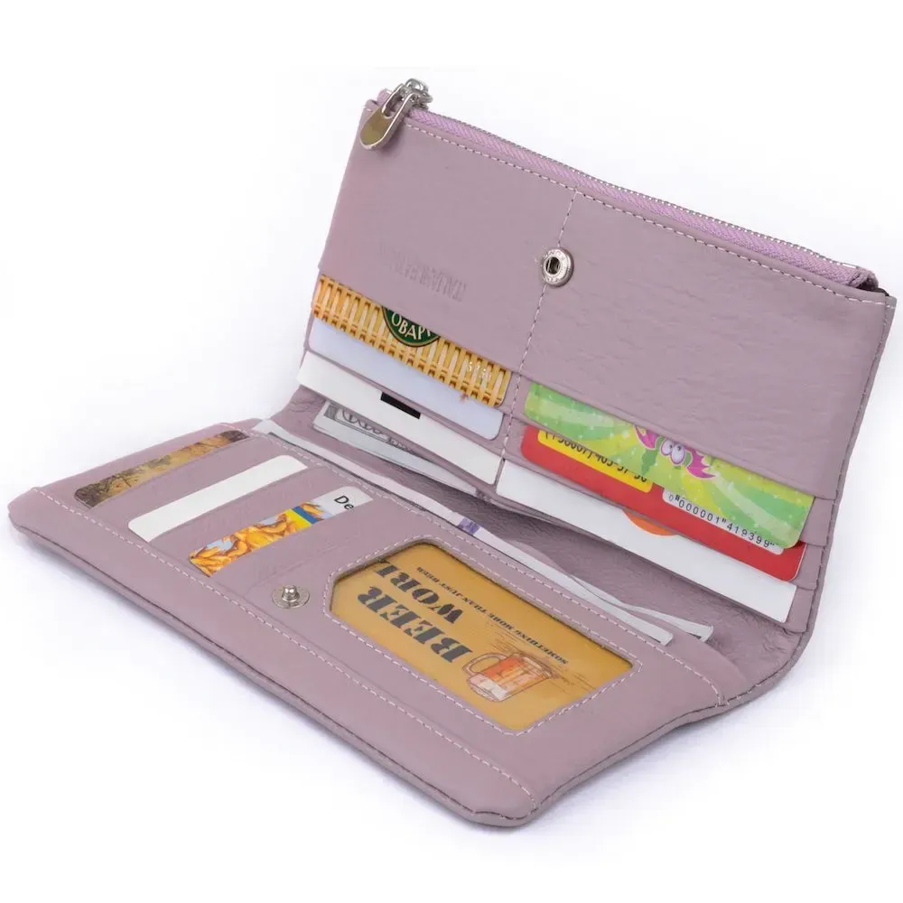 Вертикальний гаманець із натуральної шкіри оригінального лілового кольору. У бічній кишені на блискавці поміститься мобільний телефон невеликого розміру. Аксесуар має кишені як для купюр, так і для кредиток, що робить його більш універсальним у використанні. Виріб виготовлений виключно з натуральної шкіри китайського виробництва. У комплекті до гаманця йде фірмове картонне пакування. Виріб стане чудовим подарунком для ваших близьких.