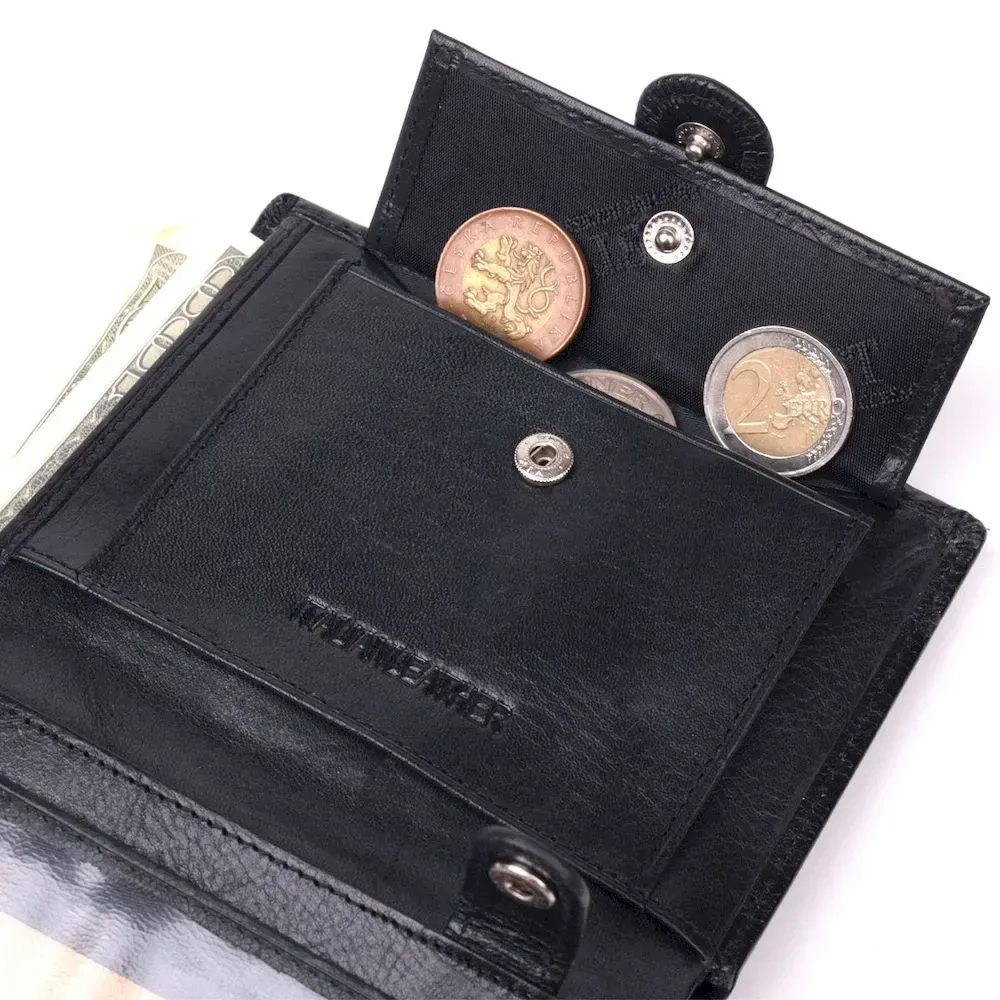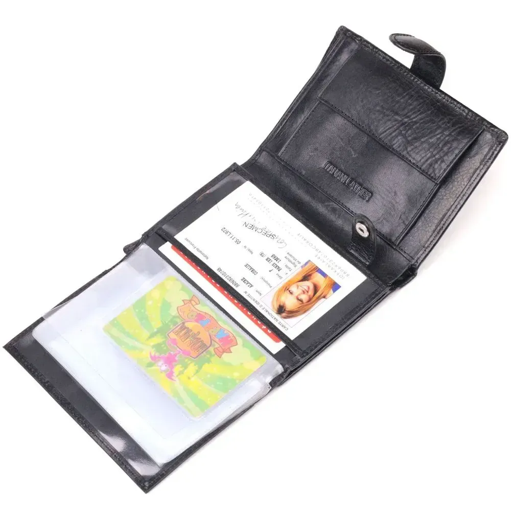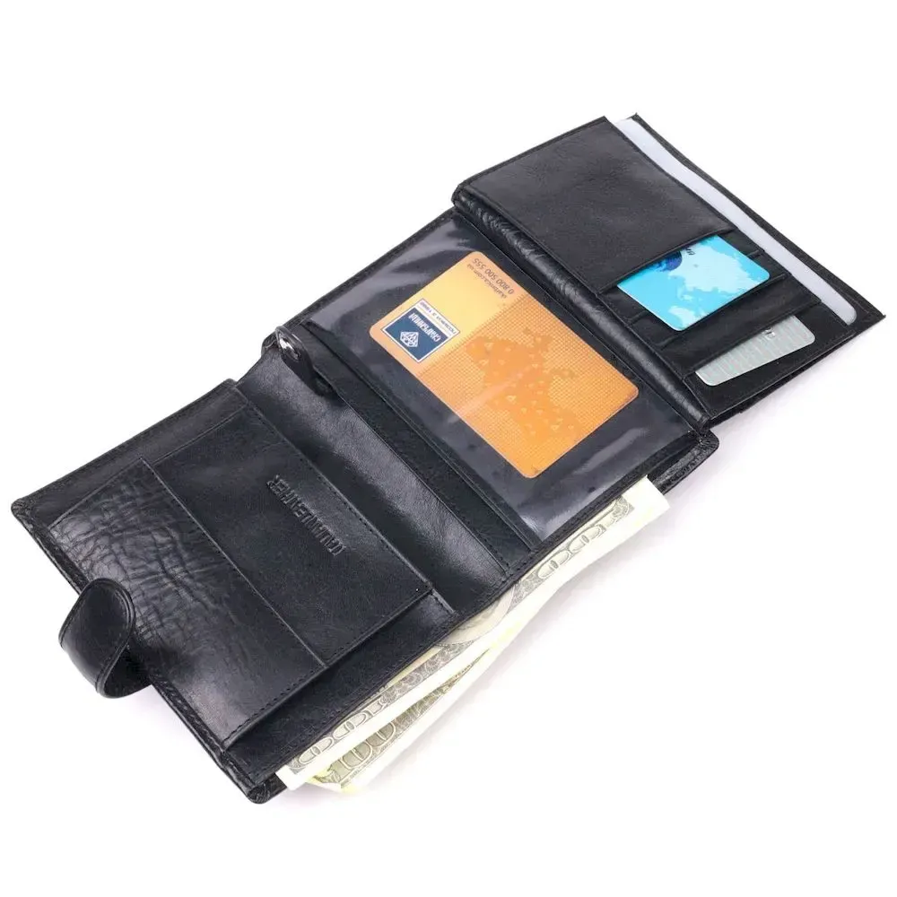 Практичний чоловічий гаманець чорного кольору з натуральної якісної шкіри. Для перегородки між відділеннями використовується натуральна шкіра та міцний текстиль. Виріб складається із двох великих відділень для купюр, восьми слотів для карток, прозорого відділення, монетниці, що закривається клапаном на кнопку, а також блоку для документів, що закривається хлястиком на кнопку. Продається гаманець у красивій коробці від виробника.