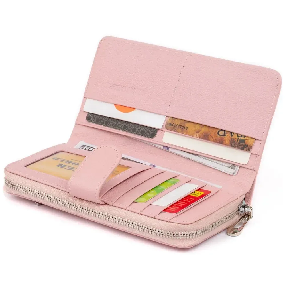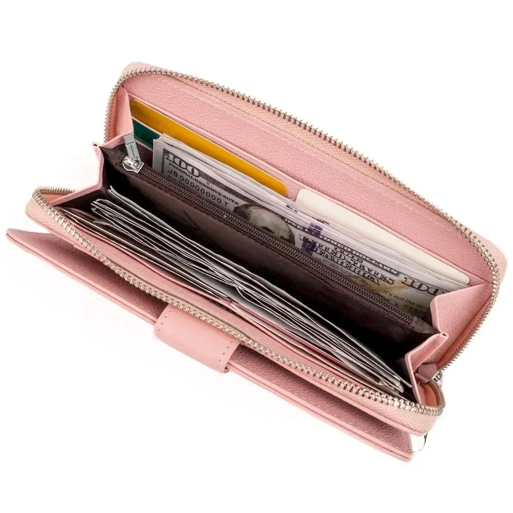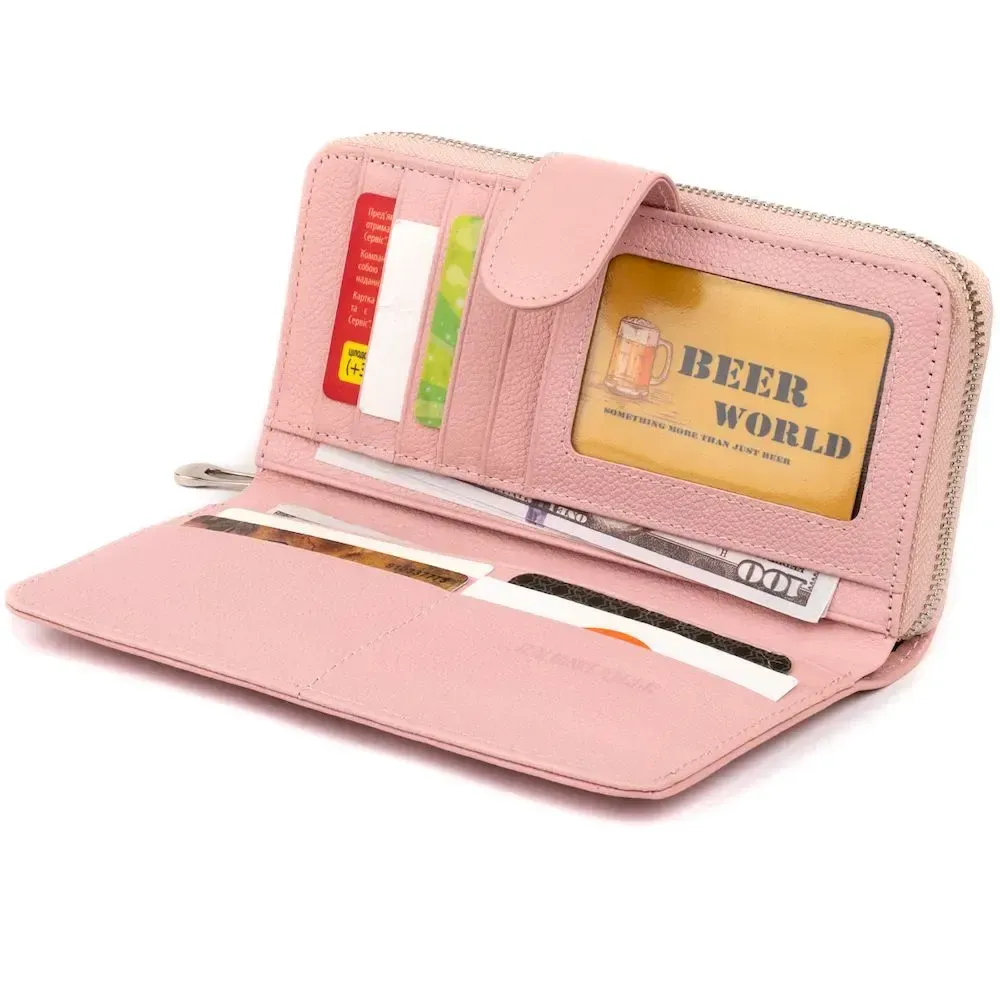 Масивний місткий та функціональний жіночий гаманець з натуральної шкіри. Виробництво – фабричний Китай. Усередині моделі ви знайдете кишені для купюр у розгорнутому вигляді, кишеньку на блискавці для монет, приховані кишені та достатньо слотів для кредиток. Також у модель вбудована автономна частина для візиток. Впевнені, що такий аксесуар оцінять любителі носити з собою карти знижок. Гаманець зручно лежить у руці та поміщається у сумку. Ніжний рожевий колір додає легкості та невимушеності. Аксесуар упакований у фірмову картонну коробку. Виріб підійде як подарунок для дівчини будь-якого віку. Замовляйте на нашому сайті цю модель за максимально доступною ціною.