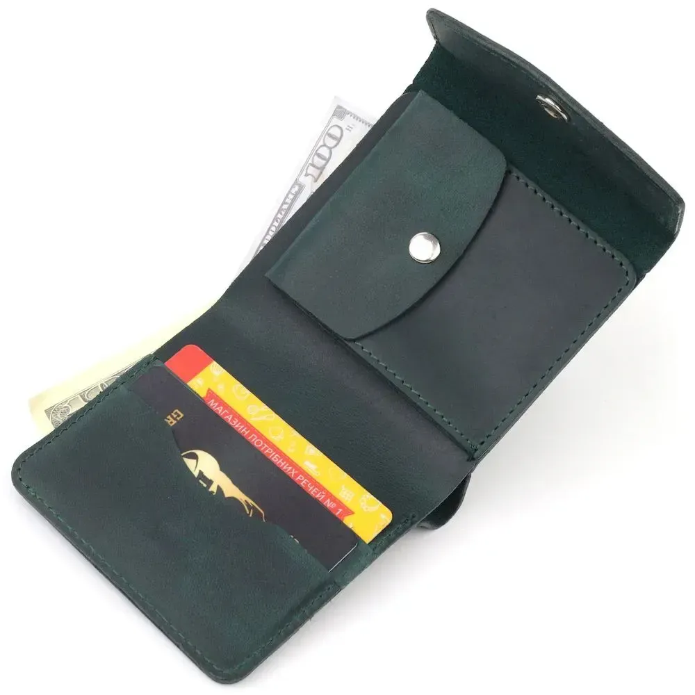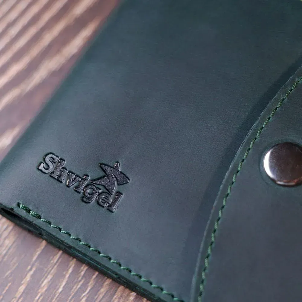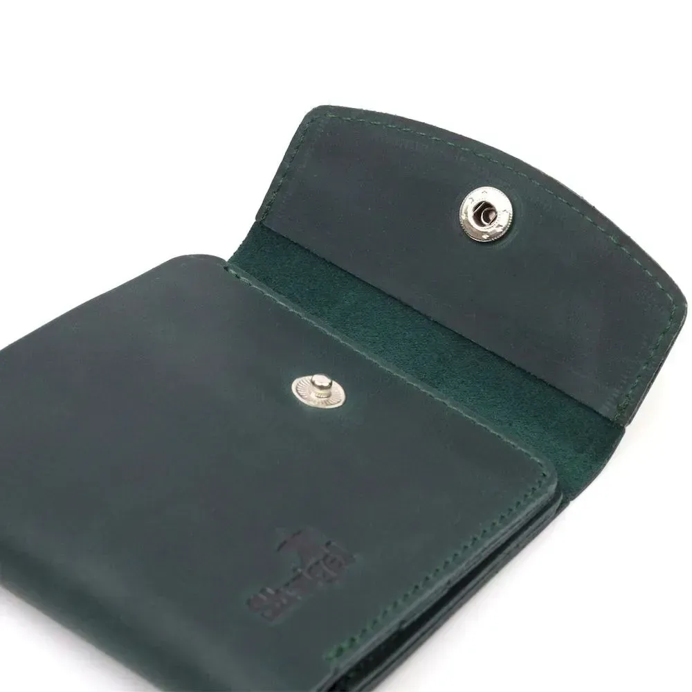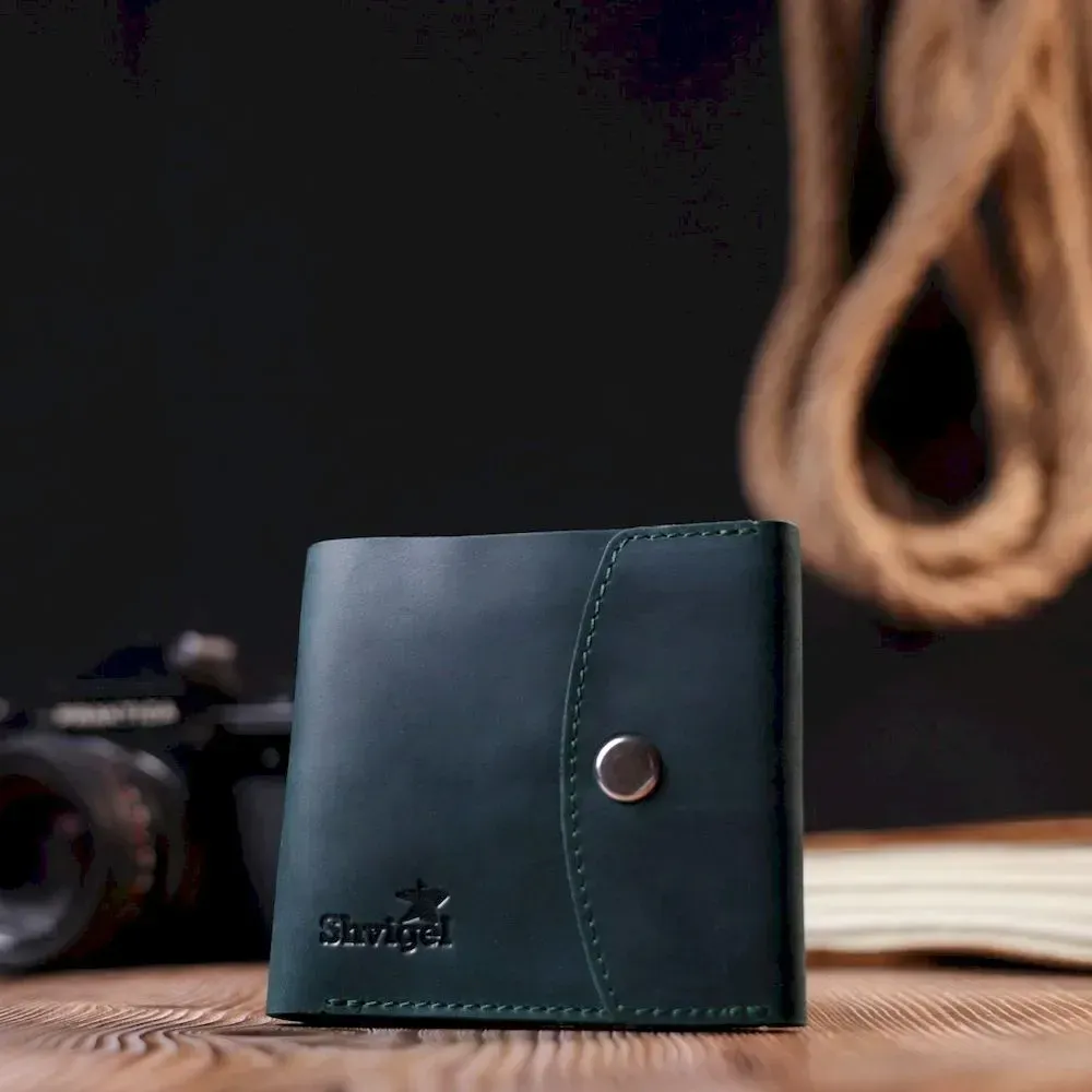 Урожай компактний гаманець зеленого кольору, маленького розміру, який легко поміститься навіть у найменшу сумочку. Аксесуар не займе багато місця та не має зайвої ваги. Закривається гаманець хлястиком із кнопкою. Зовні та всередині виріб виготовлено з натуральної шкіри. На лицьовій стороні гаманець прикрашений тисненим логотипом Shvigel. Добротна вінтажна шкіра прослужить Вам дуже довго.