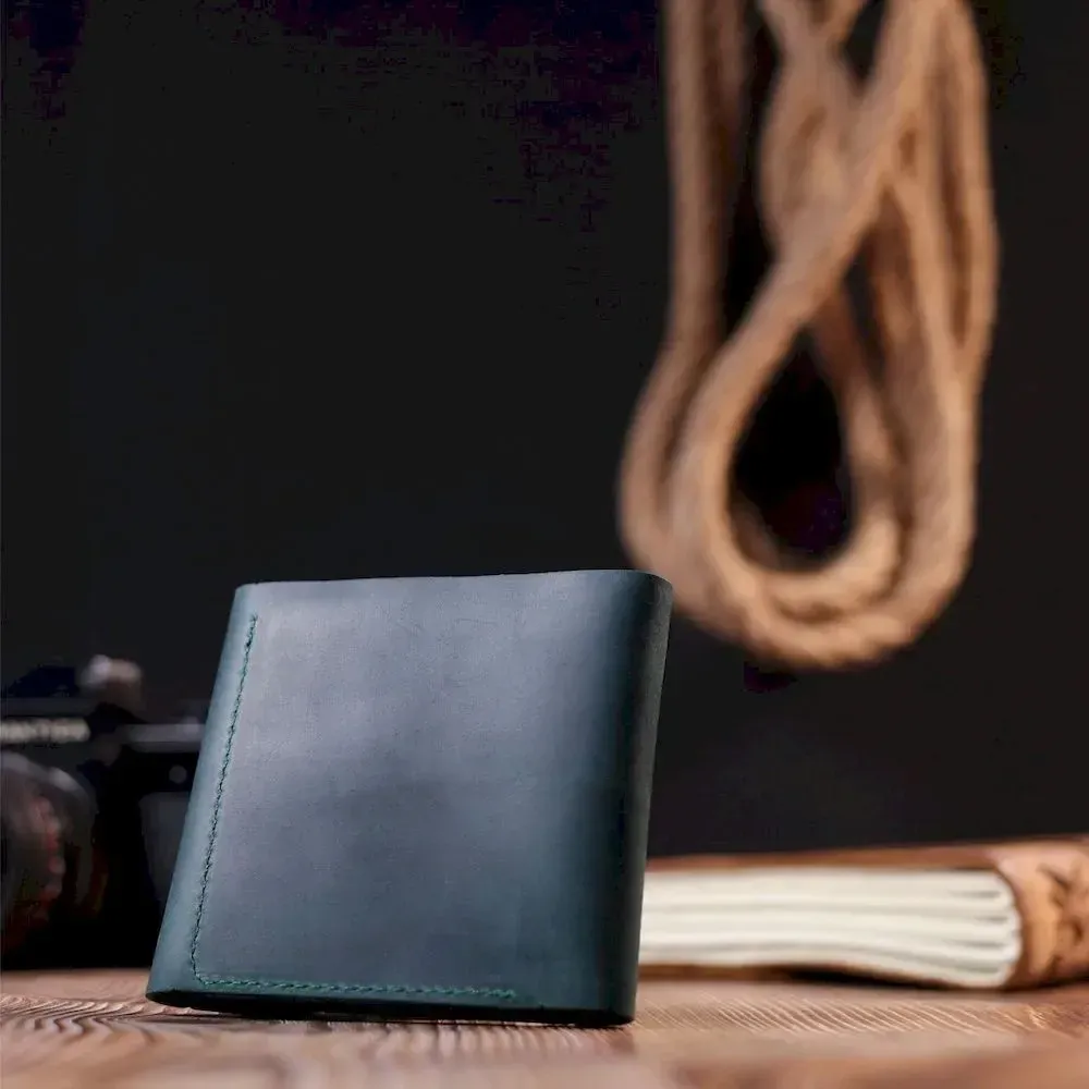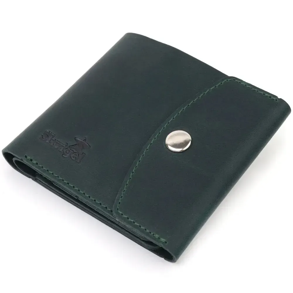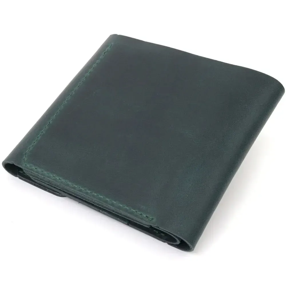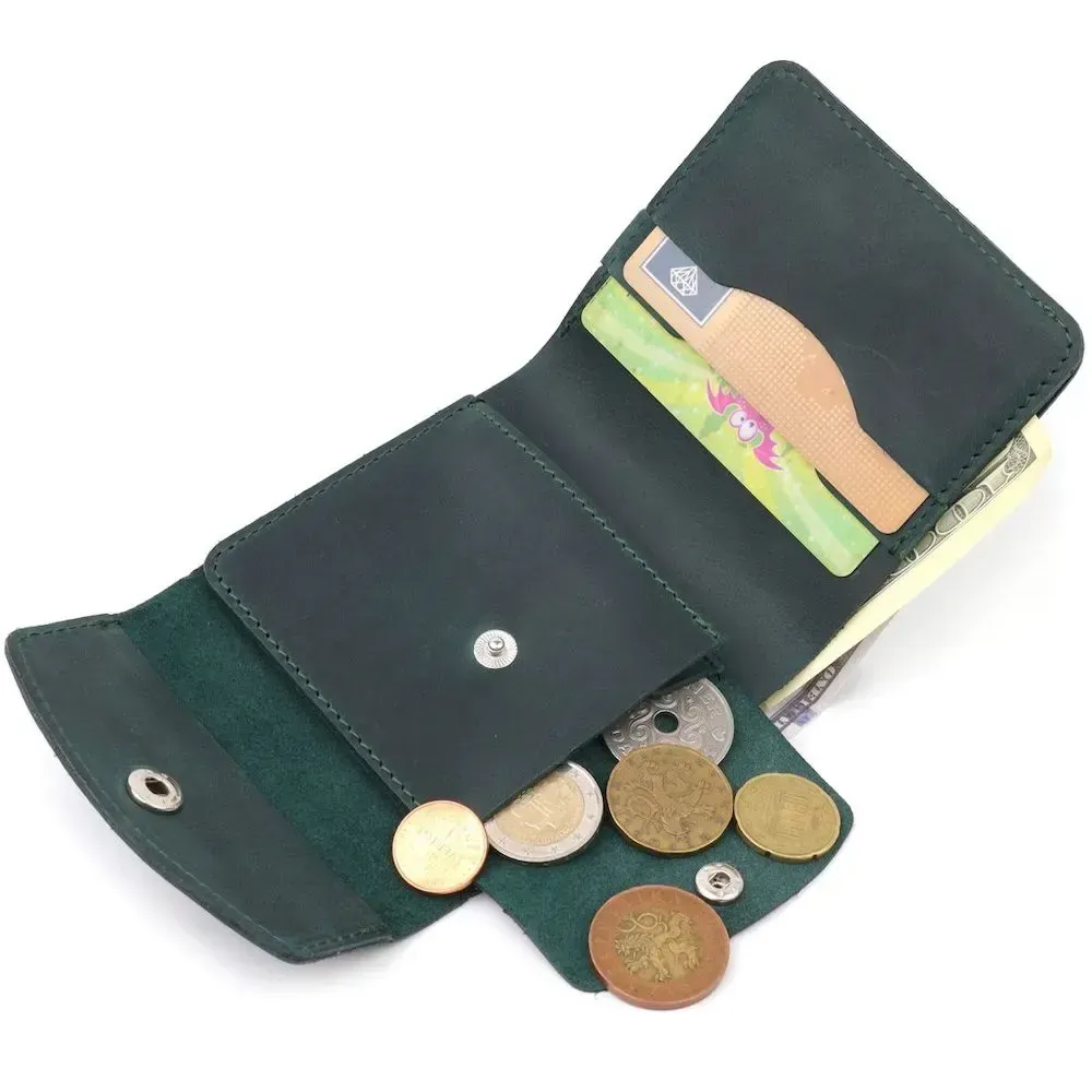 Урожай компактний гаманець зеленого кольору, маленького розміру, який легко поміститься навіть у найменшу сумочку. Аксесуар не займе багато місця та не має зайвої ваги. Закривається гаманець хлястиком із кнопкою. Зовні та всередині виріб виготовлено з натуральної шкіри. На лицьовій стороні гаманець прикрашений тисненим логотипом Shvigel. Добротна вінтажна шкіра прослужить Вам дуже довго.