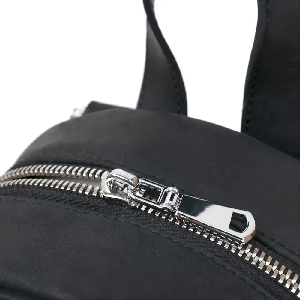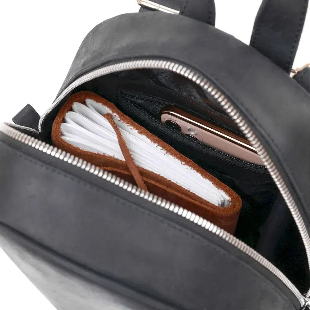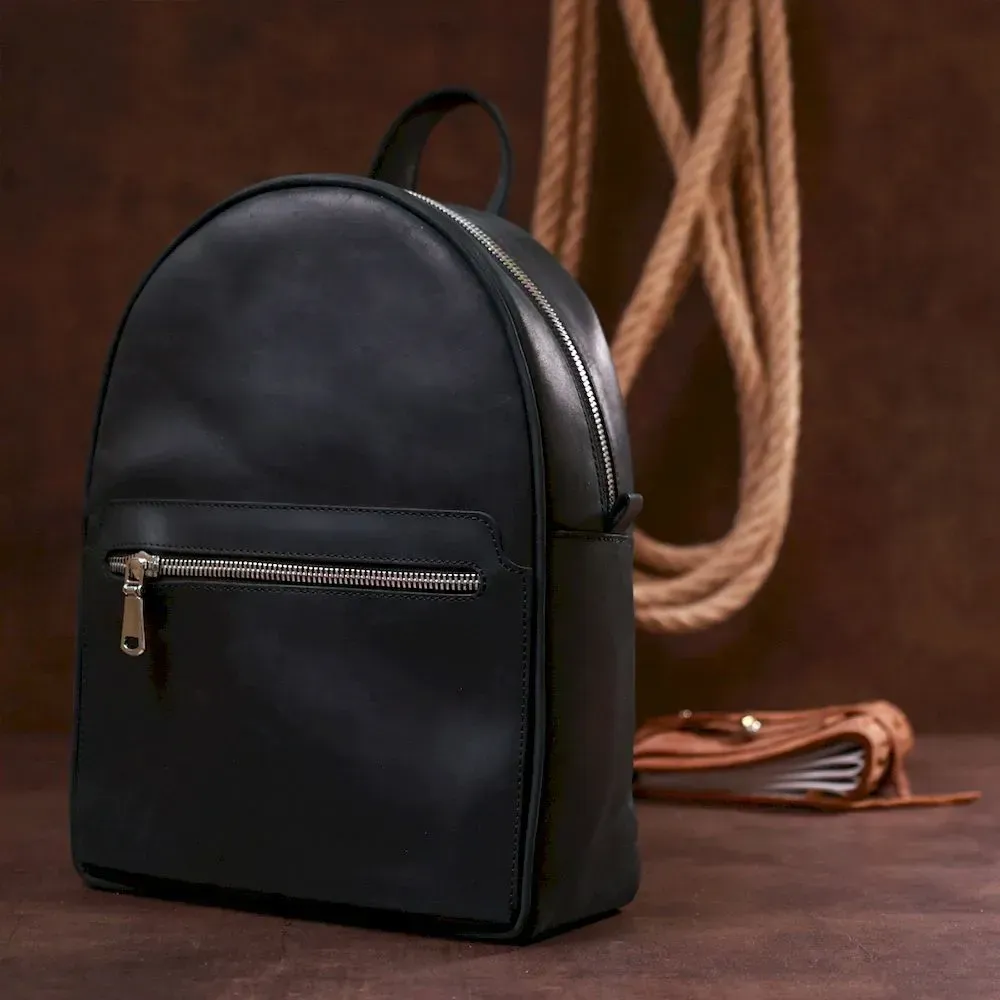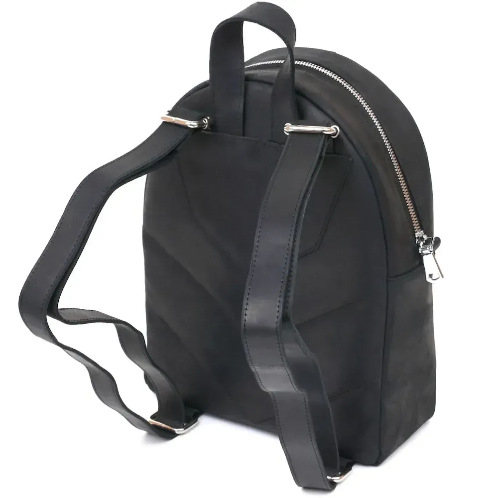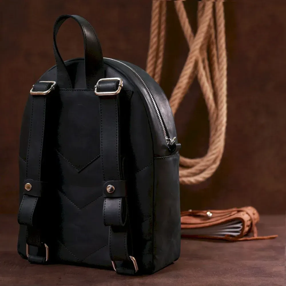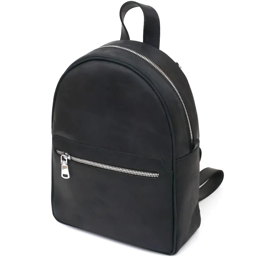 Практичний невеликий жіночий рюкзак у стильному та модному дизайні від українського виробника. Виконано цю модель з натуральної високоякісної шкіри з покращеними показниками стійкості до зносу. Колір – універсальний чорний, що дуже практично, фактура – гладка матова з вінтажними нотками.
