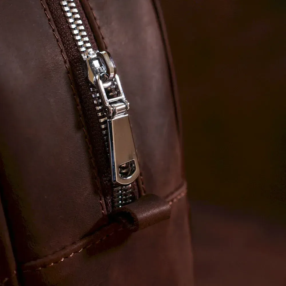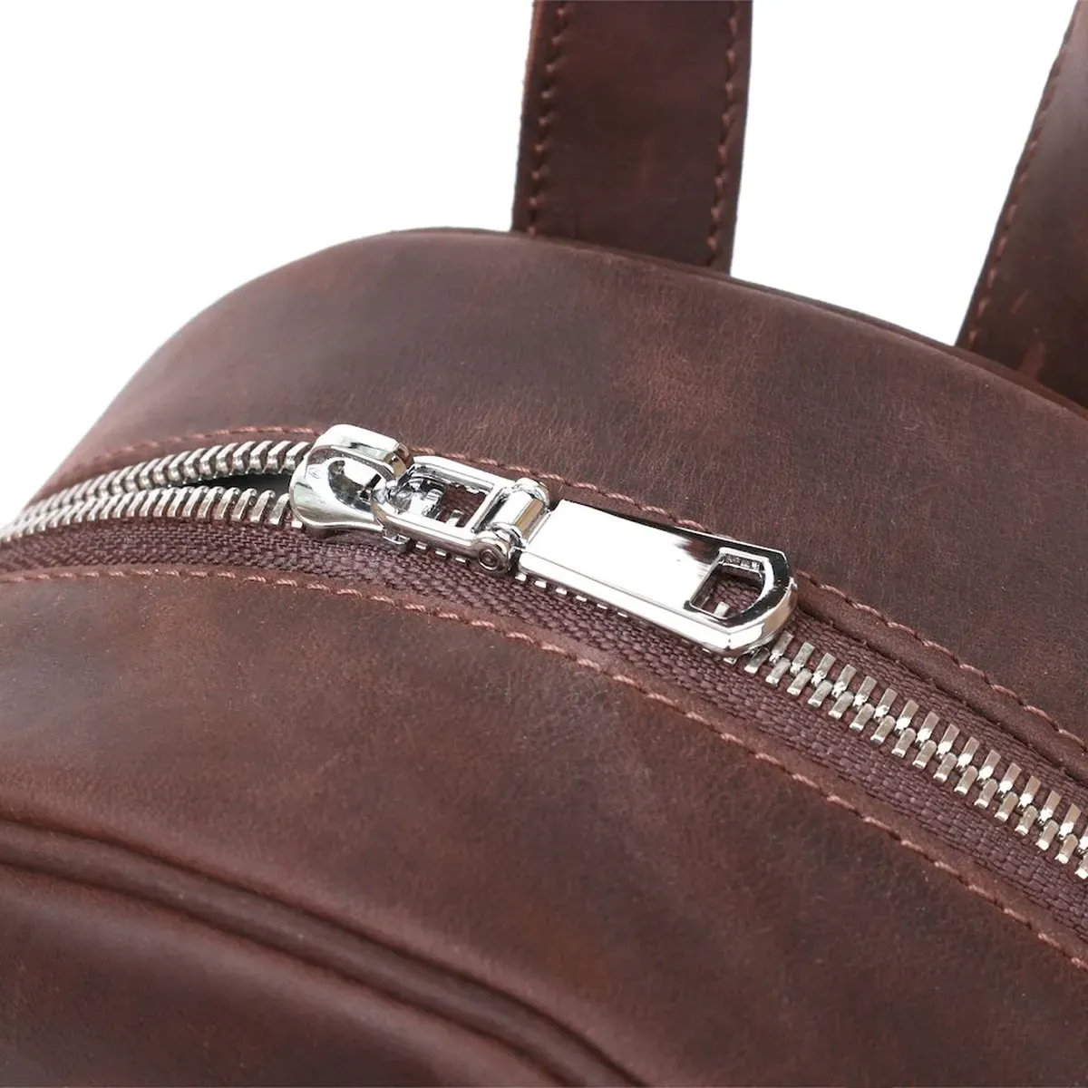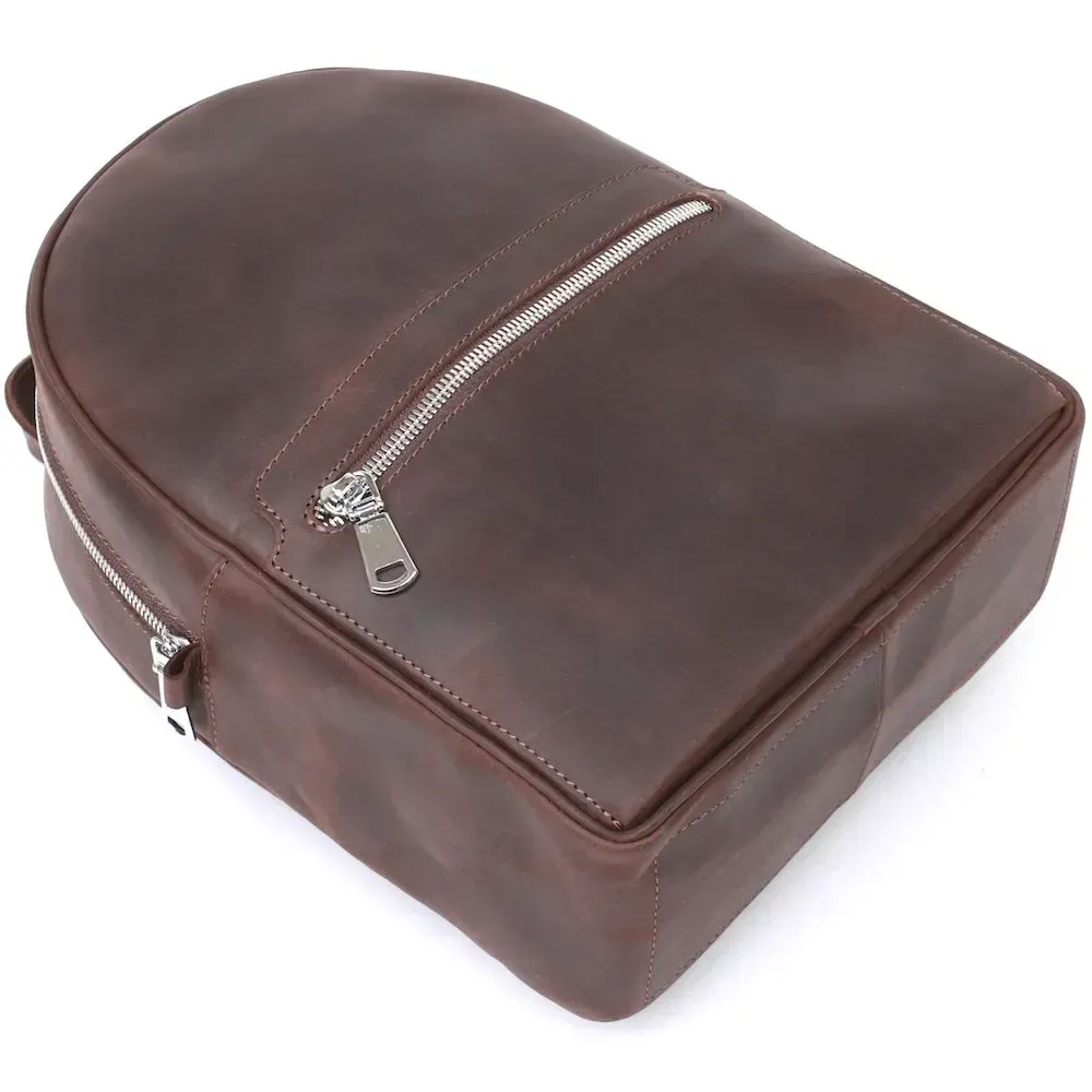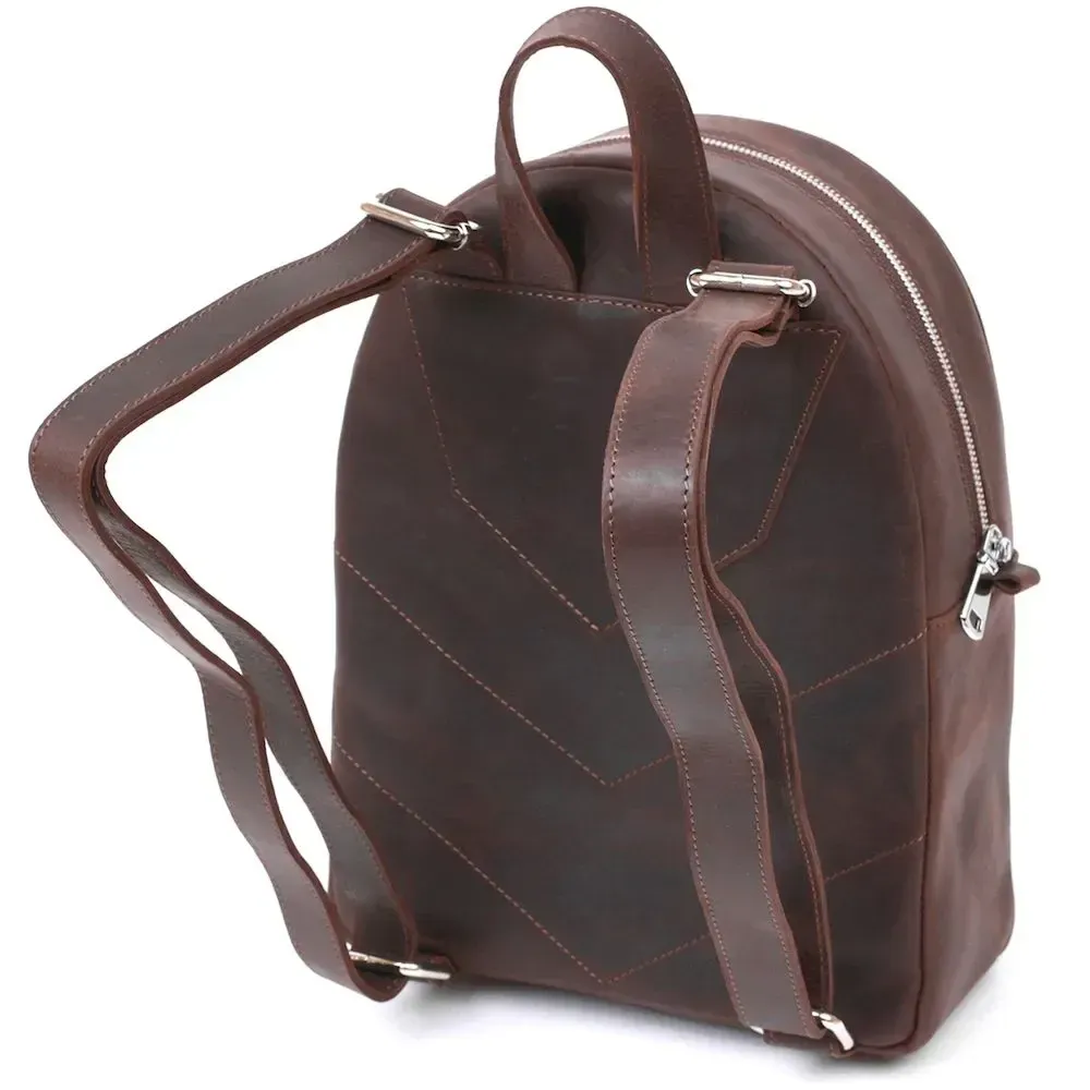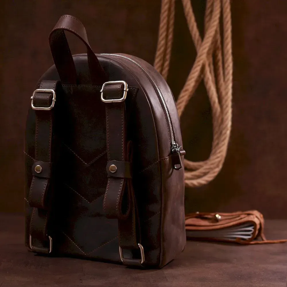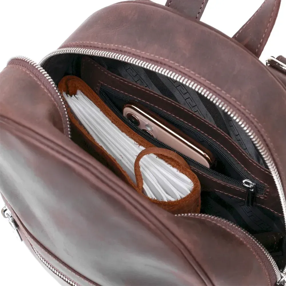 Невеликий жіночий рюкзак у стильному акуратному дизайні від українського виробника. Матеріал виготовлення – щільна натуральна шкіра високої якості із підвищеною міцністю. Усередині є одне просторе відділення і дві кишені, у тому числі одна на блискавці. На зовнішній стороні також є невелика кишеня, що дуже зручно. Колір – насичений коричневий.