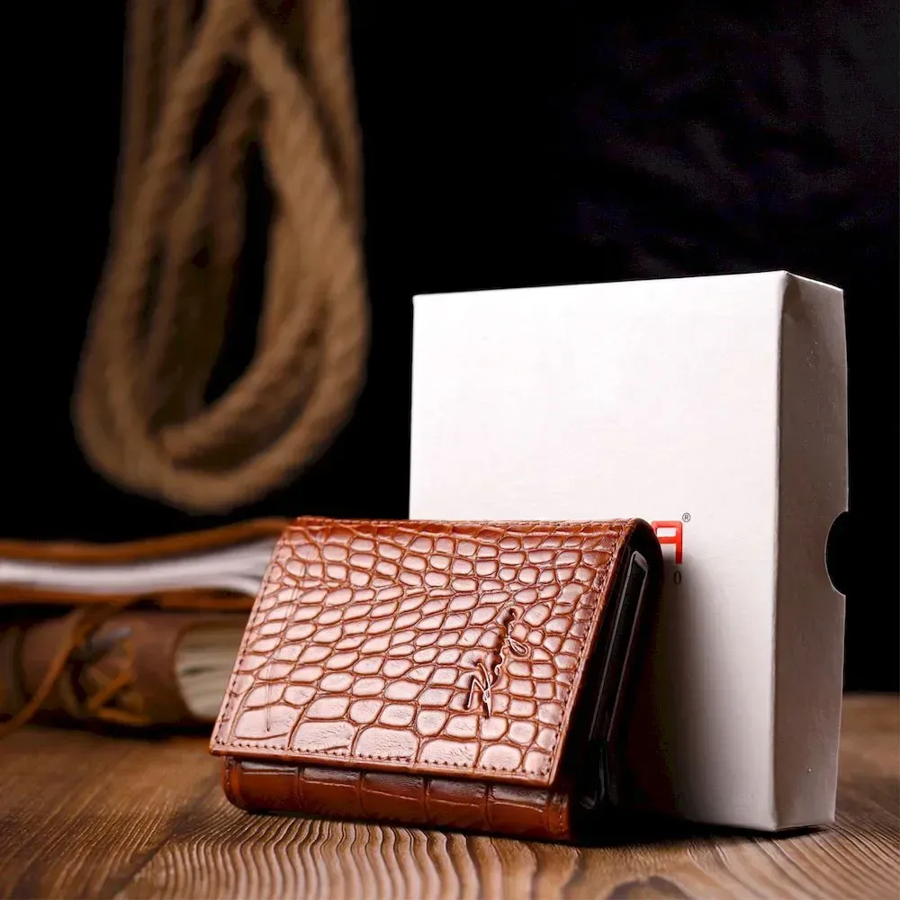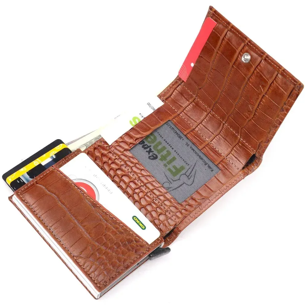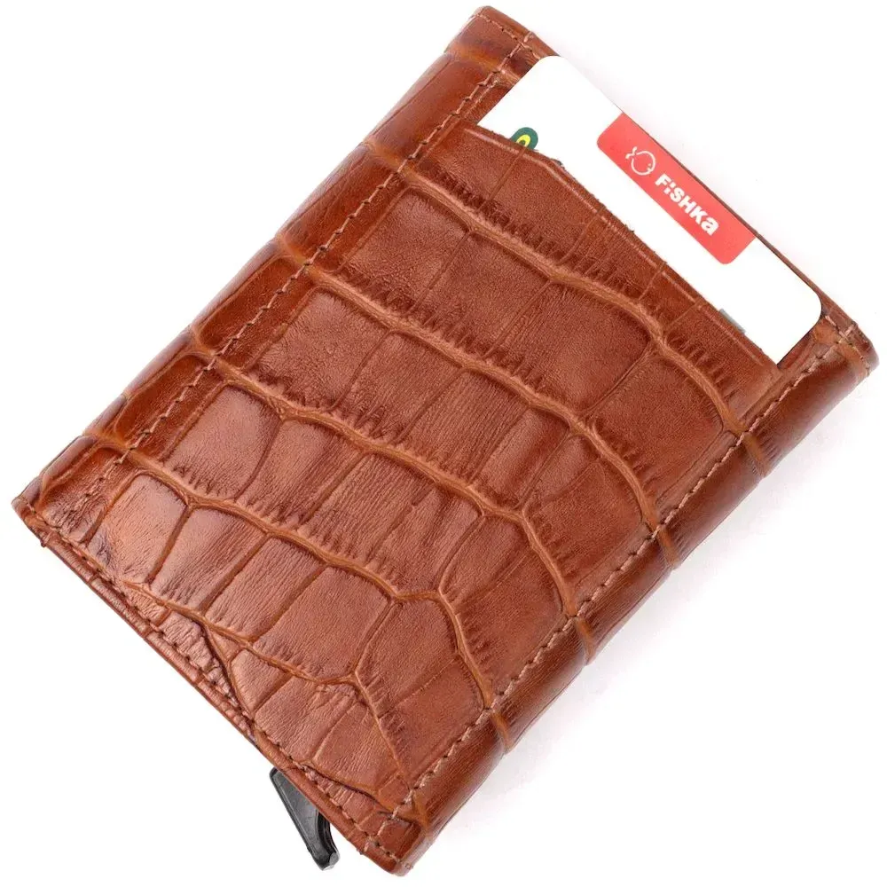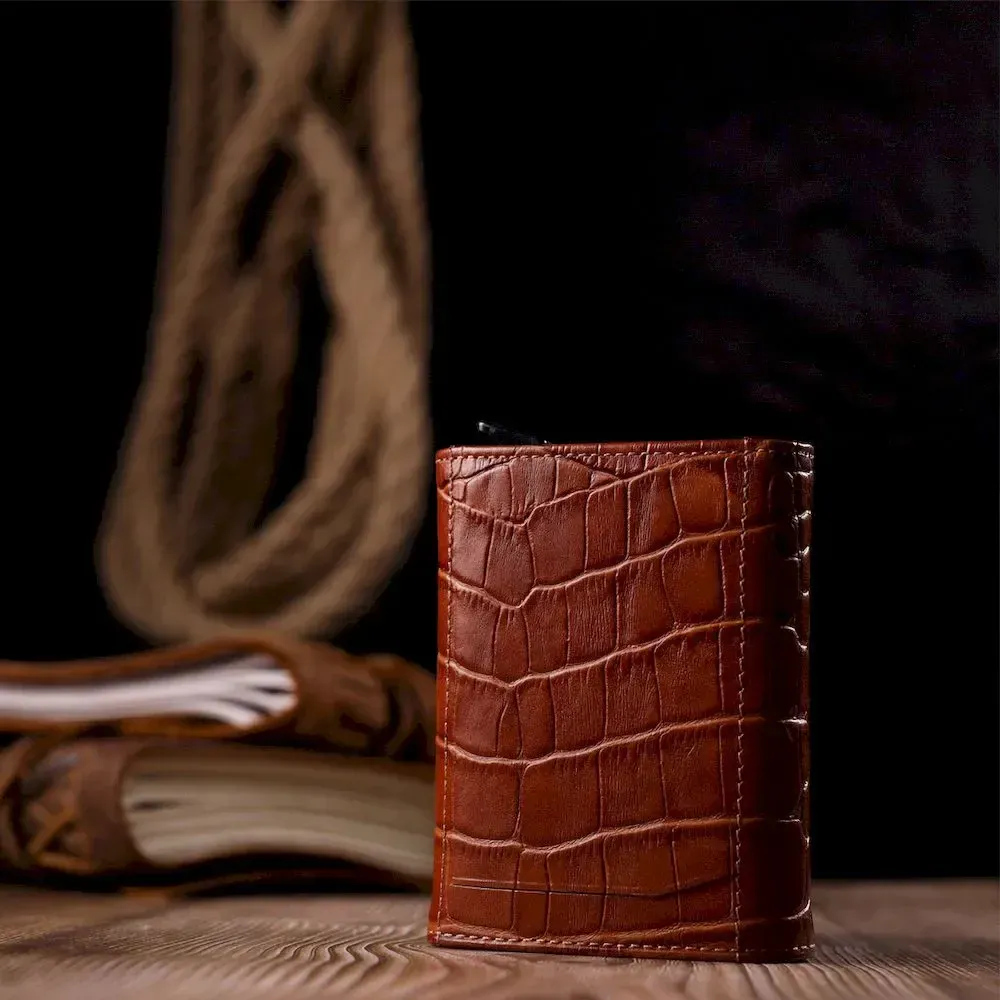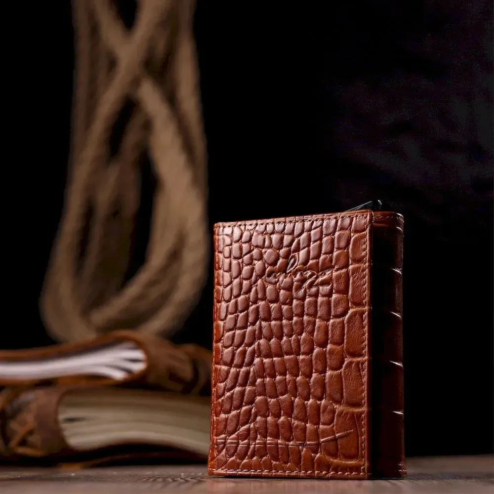 Відмінний картхолдер коричневого кольору з натуральної шкіри, з тисненням під крокодила, призначений для зберігання банківських і дисконтних карток і невеликої кількості готівки. Має лаконічний дизайн, відмінно лягає в руку, поміщається в кишеню, а також будь-яку сумку. Шкіра м'яка, приємна на дотик. Механізм працює надійно та зручний у використанні; картки добре закріплені в аксесуарі. Відмінна ідея для подарунка близькій людині.