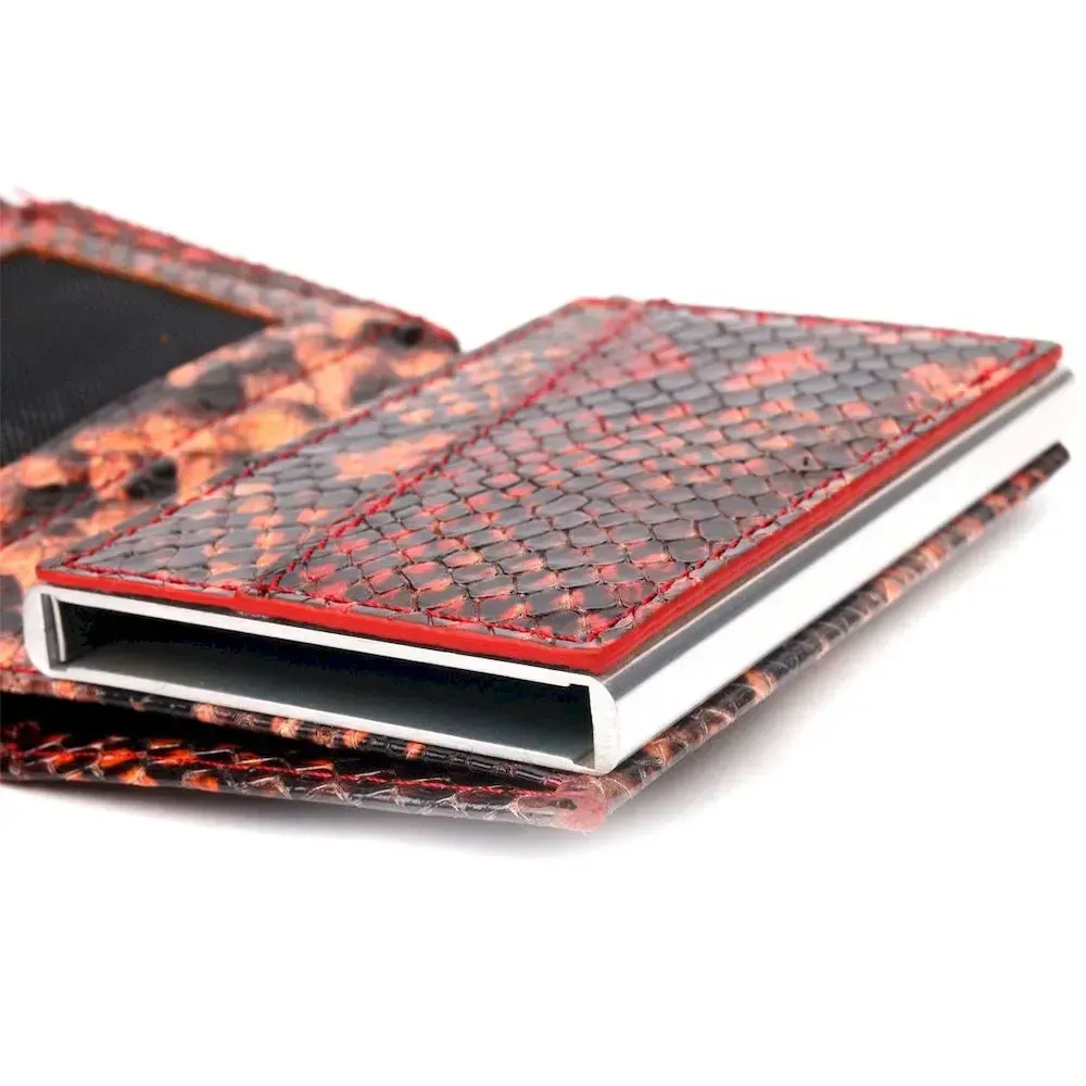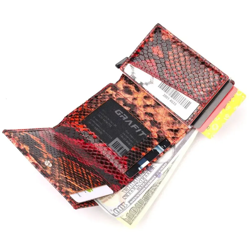 Яскравий картхолдер з лакованої шкіри , з тисненням під змію, призначений для зберігання банківських та дисконтних карток і невеликої кількості готівки. Має лаконічний дизайн, відмінно лягає в руку, поміщається в кишеню, а також будь-яку сумку. Шкіра м'яка, приємна на дотик. Механізм працює надійно та зручний у використанні; картки добре закріплені в аксесуарі. Відмінна ідея для подарунка близькій людині.