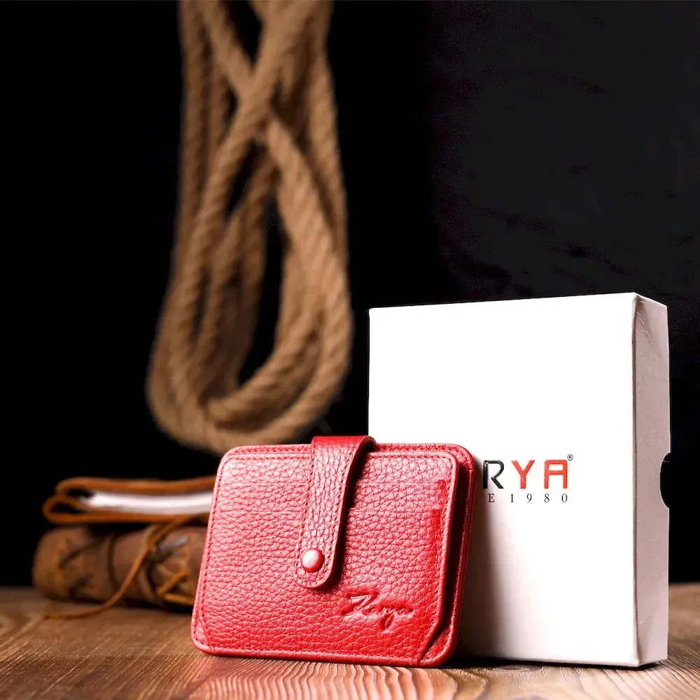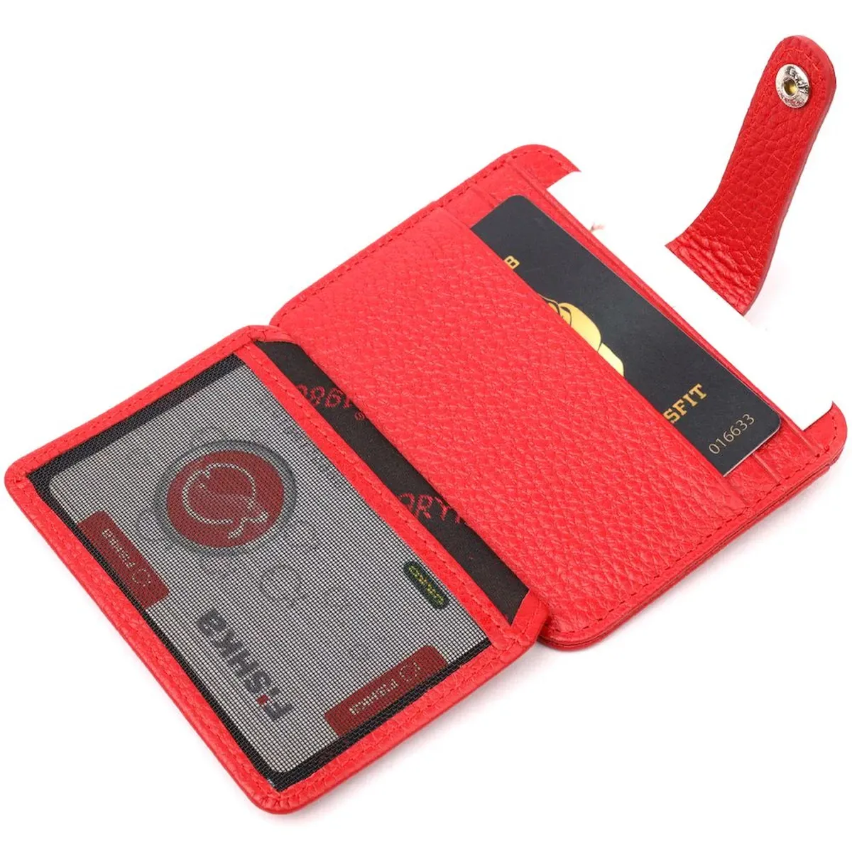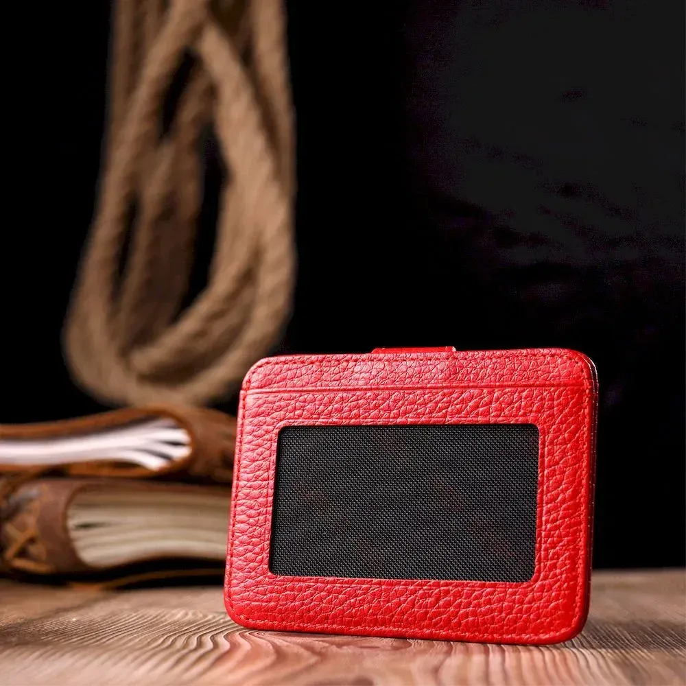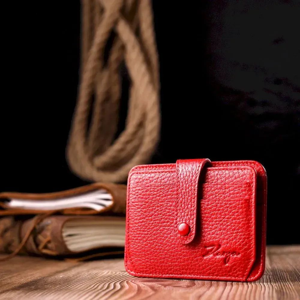 Гарний картхолдер із якісної натуральної шкіри, в червоному кольорі. При закритті, розворот фіксується на хлястик з кнопкою. Аксесуар упакований у фірмову коробочку. Вироби з натуральної шкіри завжди будуть чудовим подарунком для близької людини.