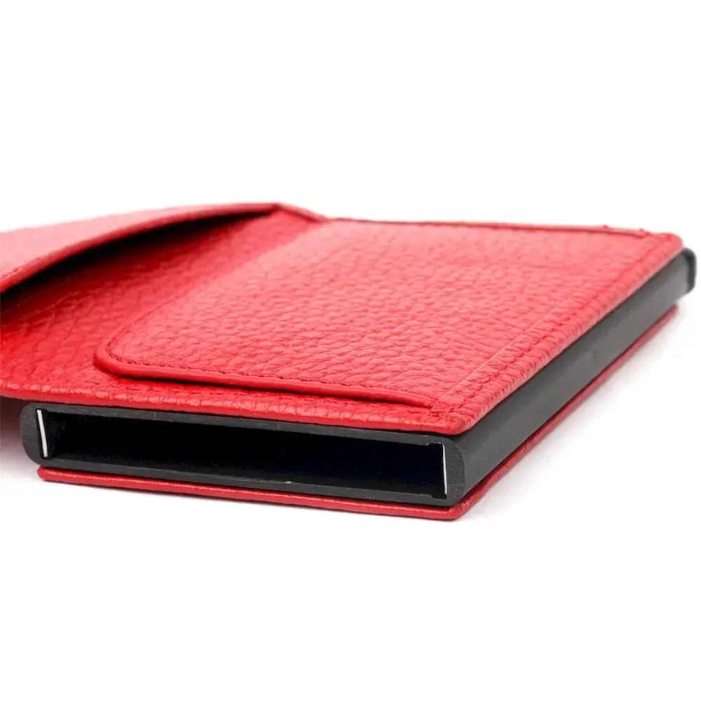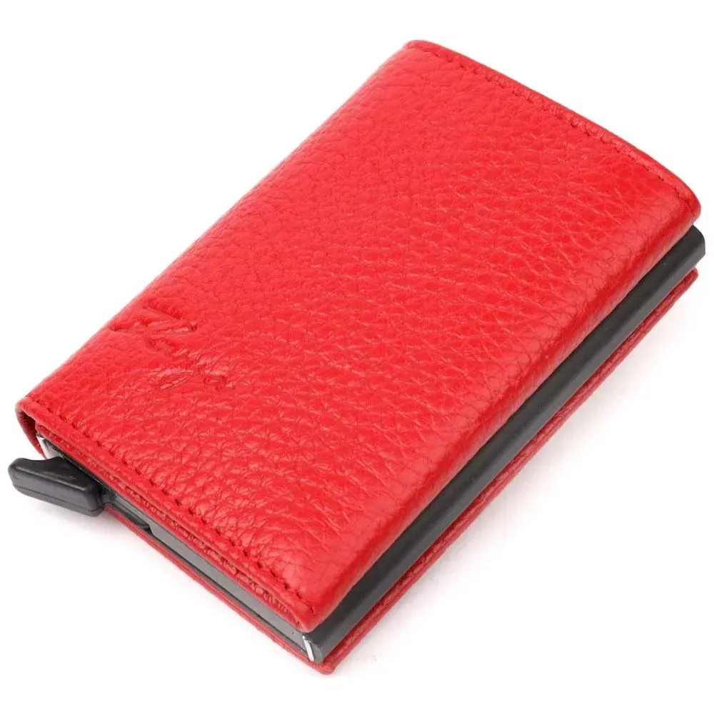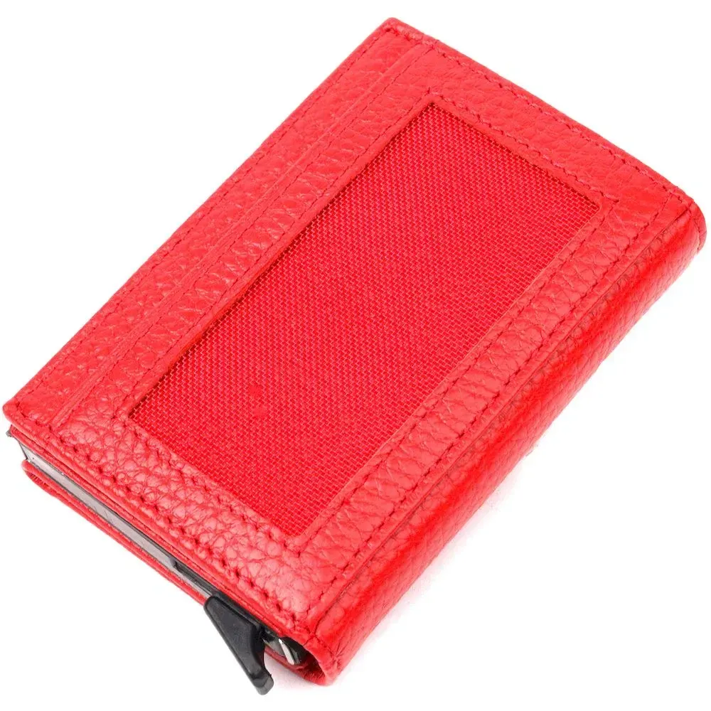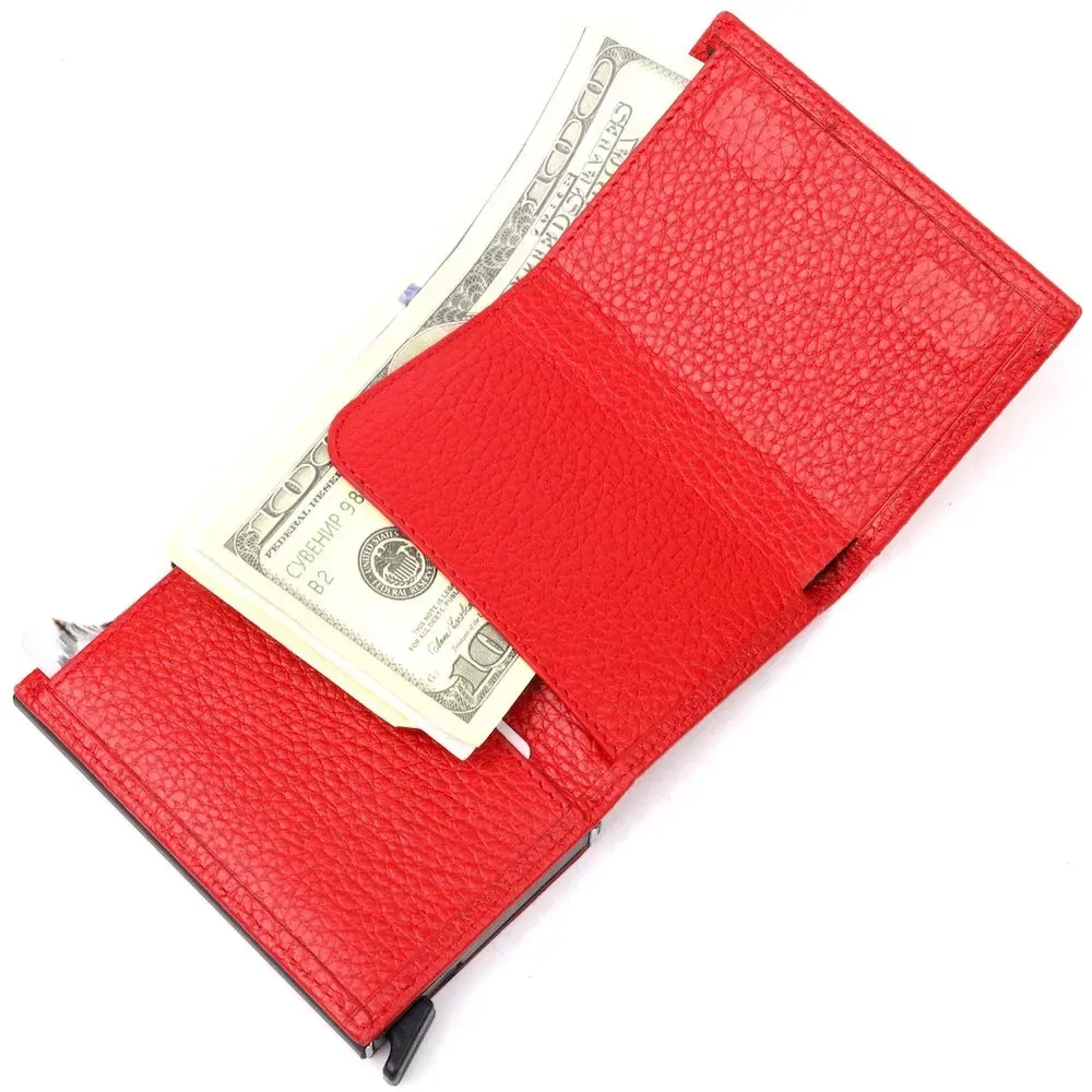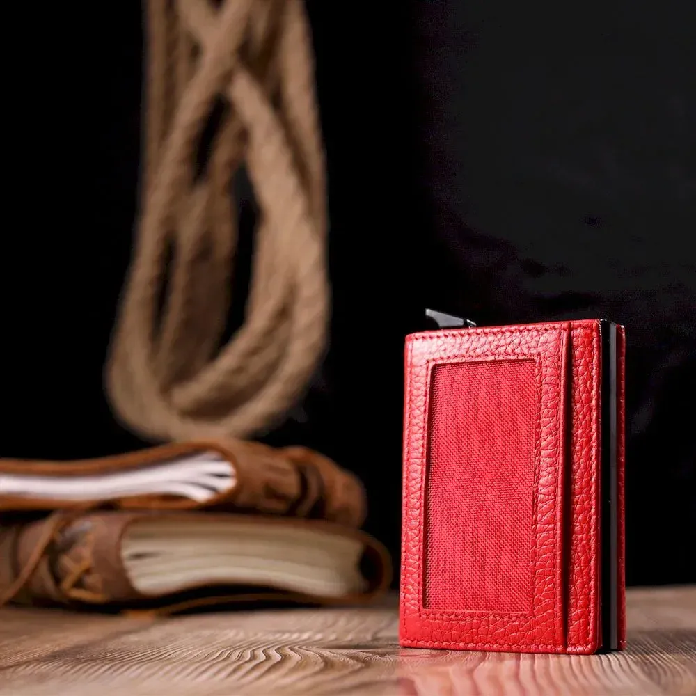 Яскравий картхолдер червоного кольору з натуральної шкіри, призначений для зберігання банківських і дисконтних карток і невеликої кількості готівки. Має лаконічний дизайн, відмінно лягає в руку, поміщається в кишеню, а також будь-яку сумку. Шкіра м'яка, приємна на дотик. Механізм працює надійно та зручний у використанні; картки добре закріплені в аксесуарі. Відмінна ідея для подарунка близькій людині.