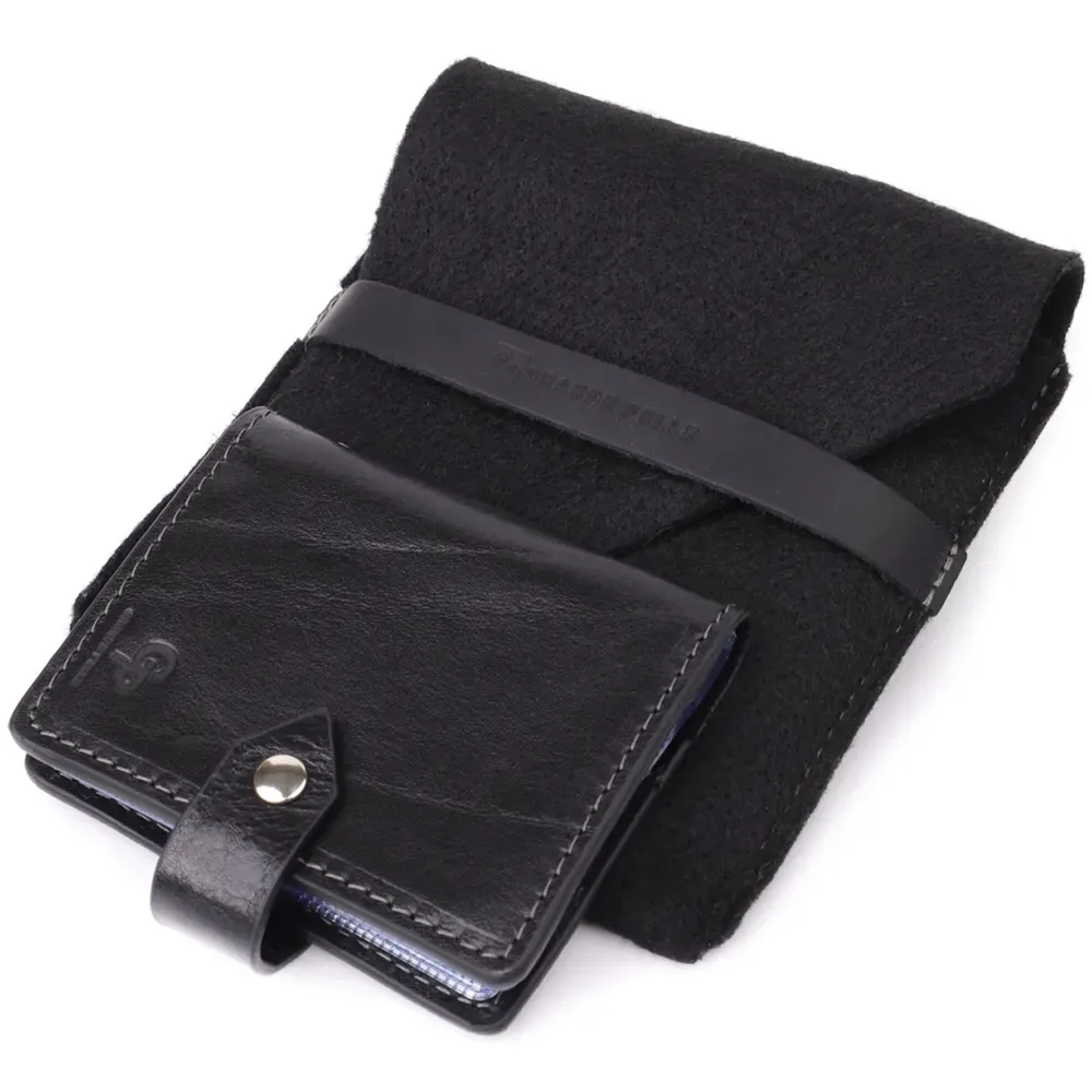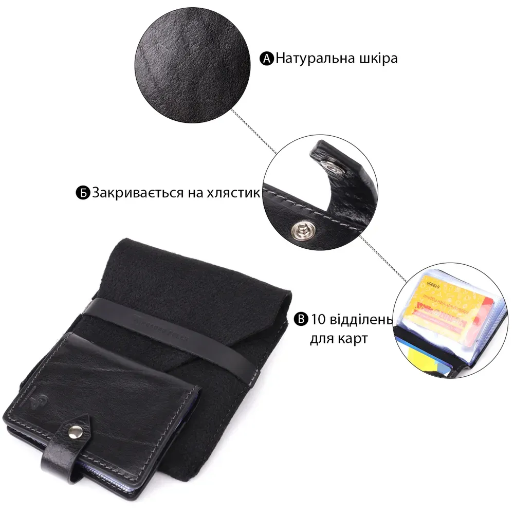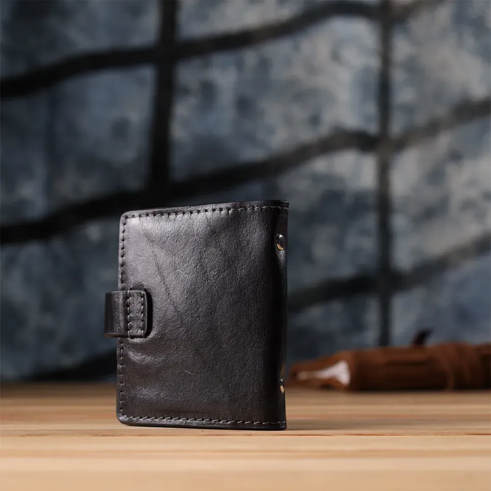 Практична невелика візитниця із високоякісної натуральної шкіри. Має універсальний чорний колір. Закривається виріб на хлястик з кнопкою, що дуже зручно під час використання, оскільки карти легкодоступні та надійно захищені. Такий презент стане чудовим знаком уваги для дорогої Вам людини.