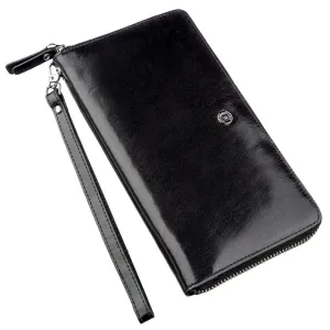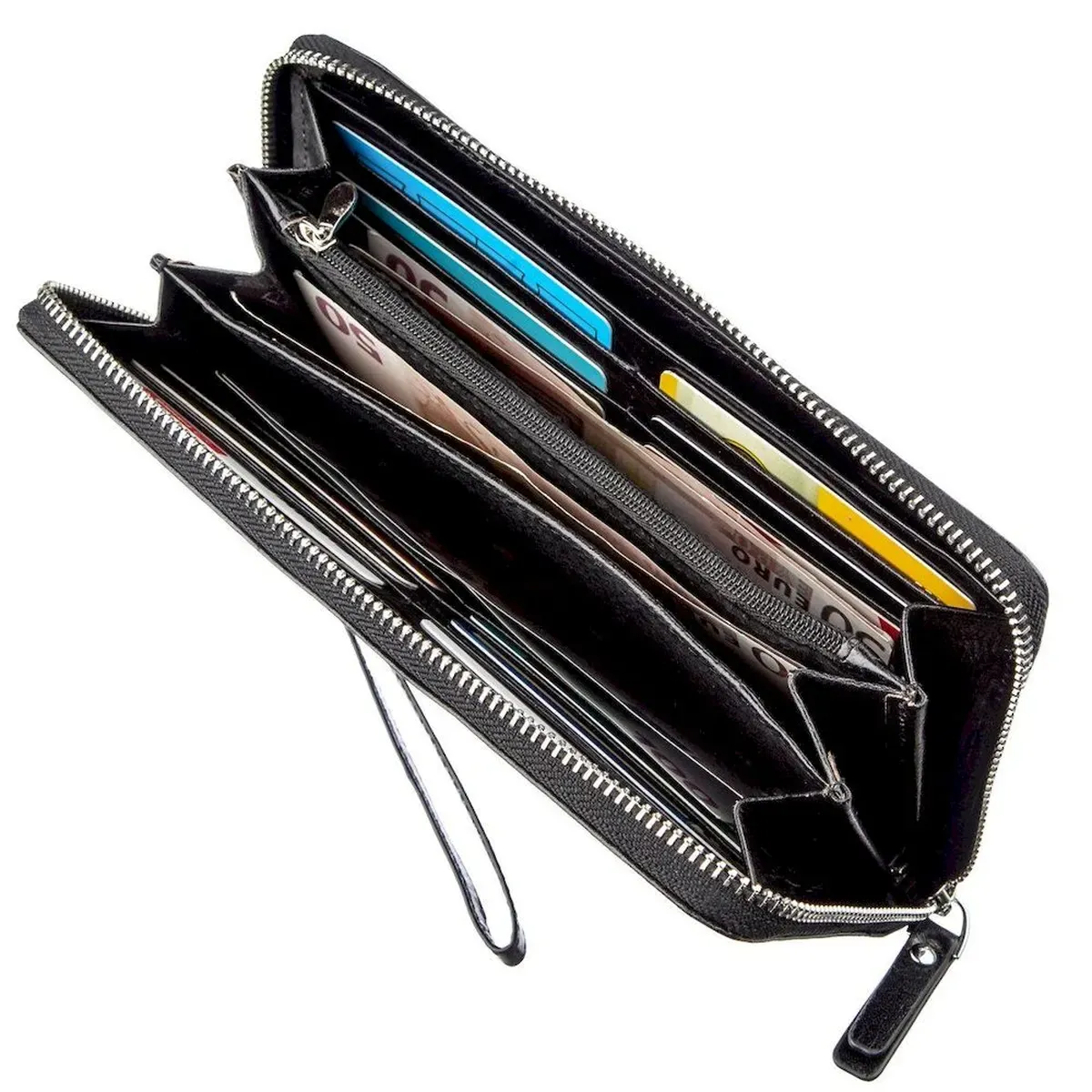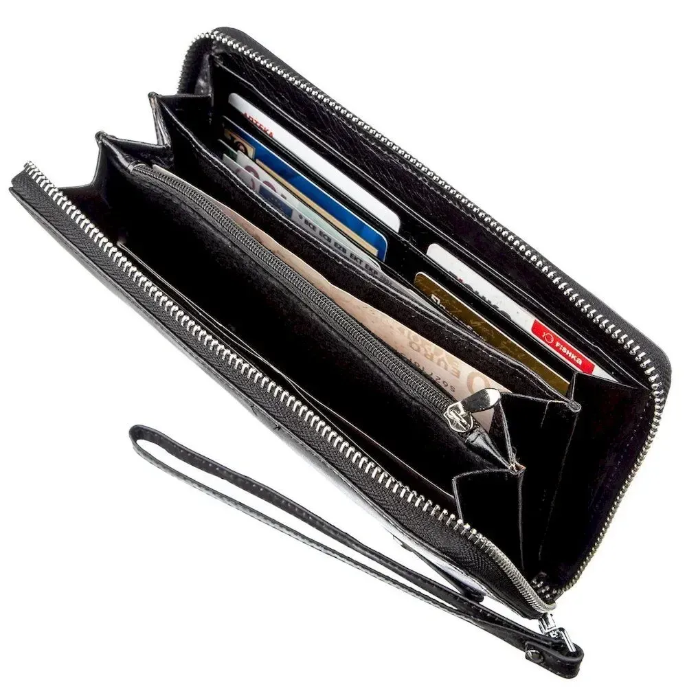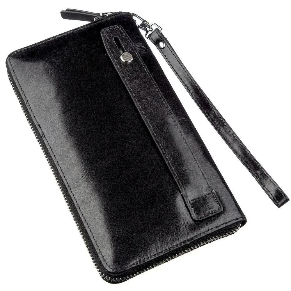 Дуже місткий і практичний чоловічий портмоне-клатч із високоякісної шкіри чорного кольору для впевненого в собі чоловіка. Має все необхідне, щоб стати Вам незамінним аксесуаром у повсякденному рутинному житті. Ви легко помістите в нього паперові купюри, монети, документи і картки. Таке портмоне неодмінно наголосить на високому рівні свого власника. Цей клатч можна носити як у сумочці чи портфелі, так і просто на зап'ясті за допомогою спеціального ремінця. Якщо Ви вирішите такий аксесуар подарувати близькій людині, то Вам гарантовано будуть дуже вдячні. Також зазначаємо, що упаковано портмоне-клатч у фірмову картонну коробку.