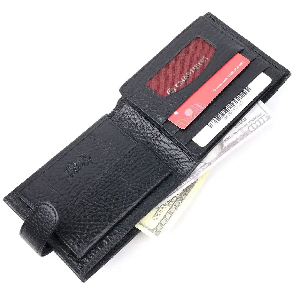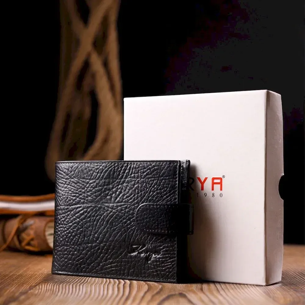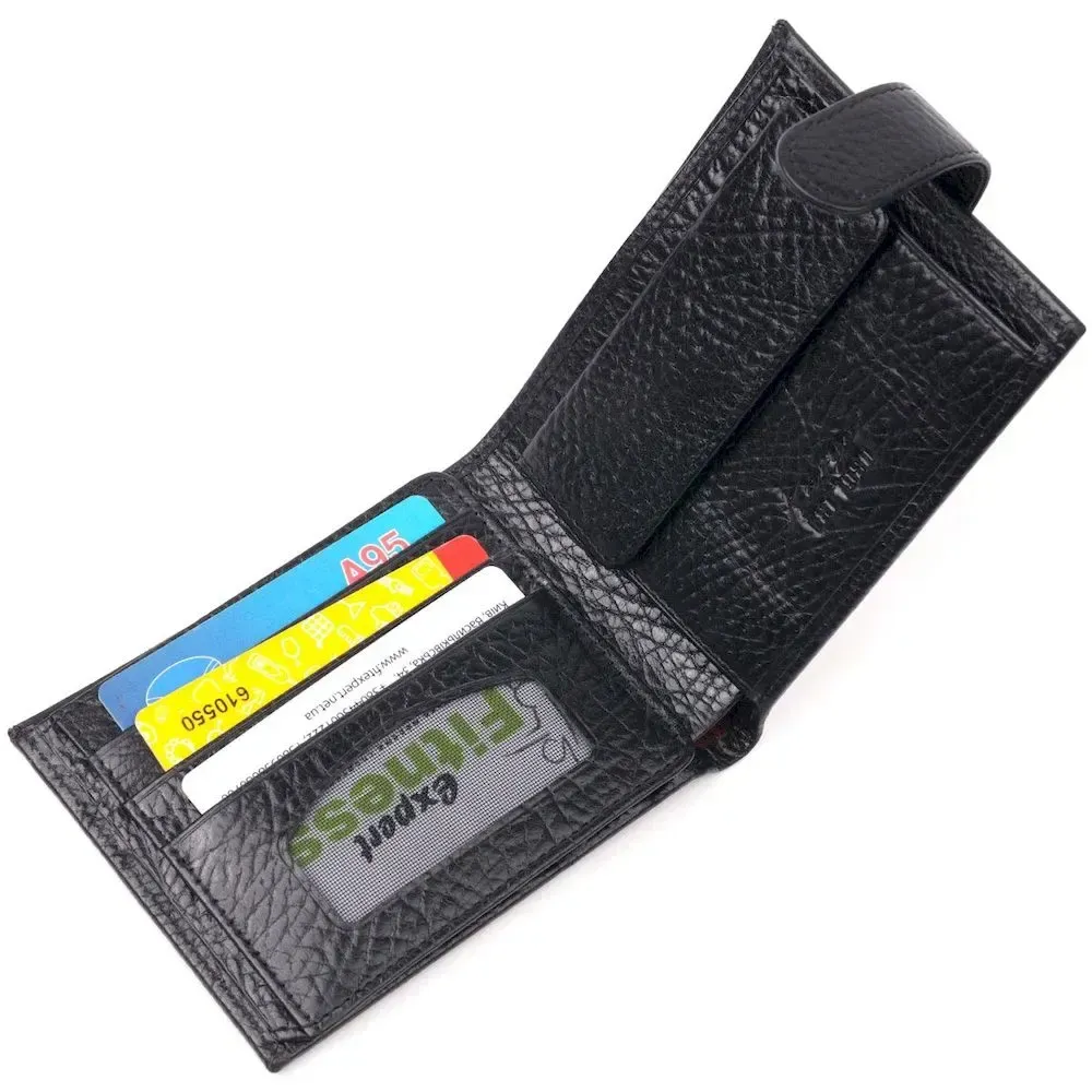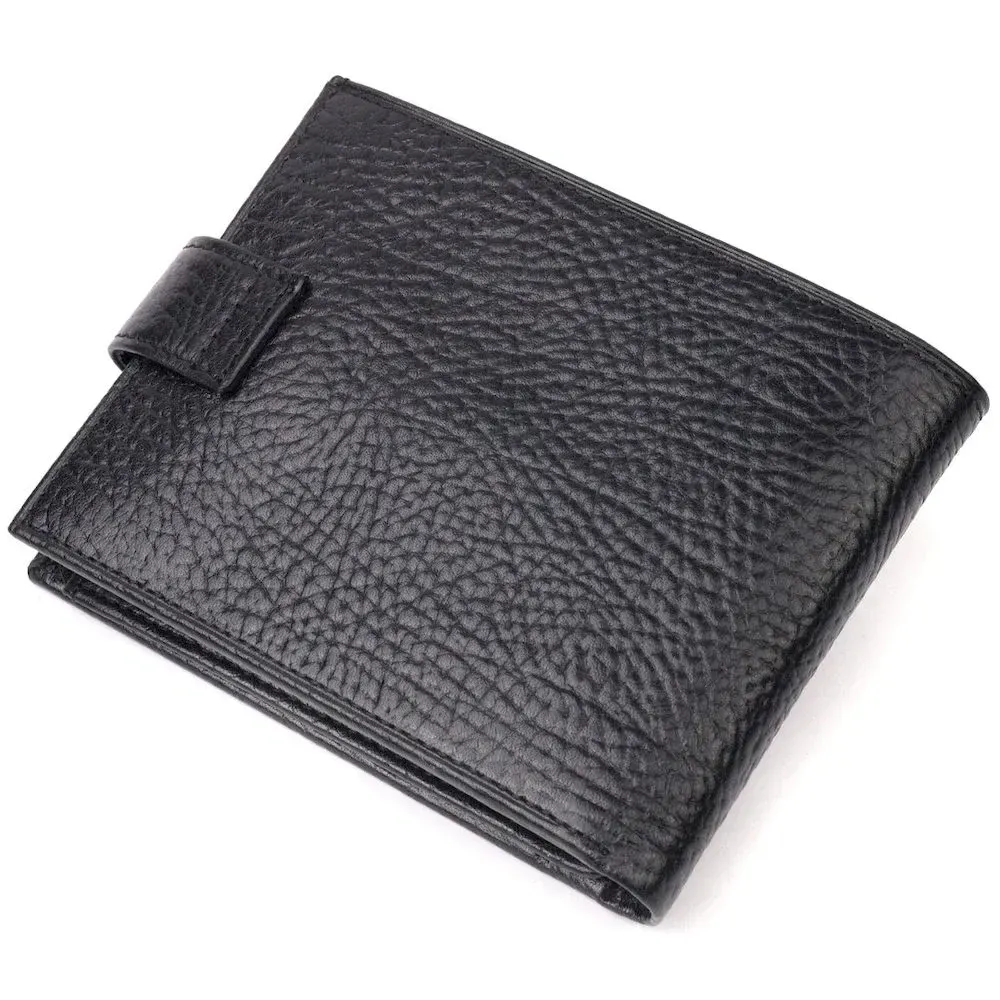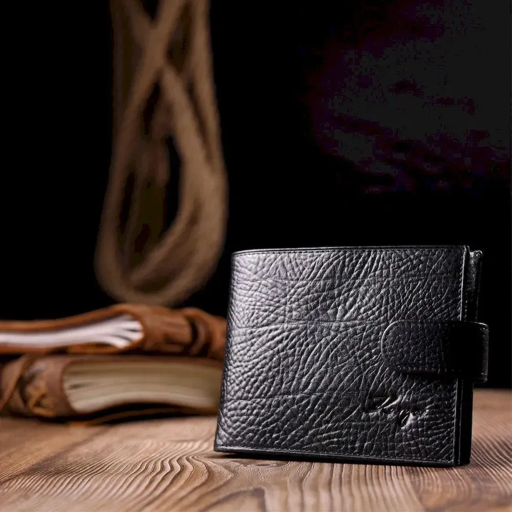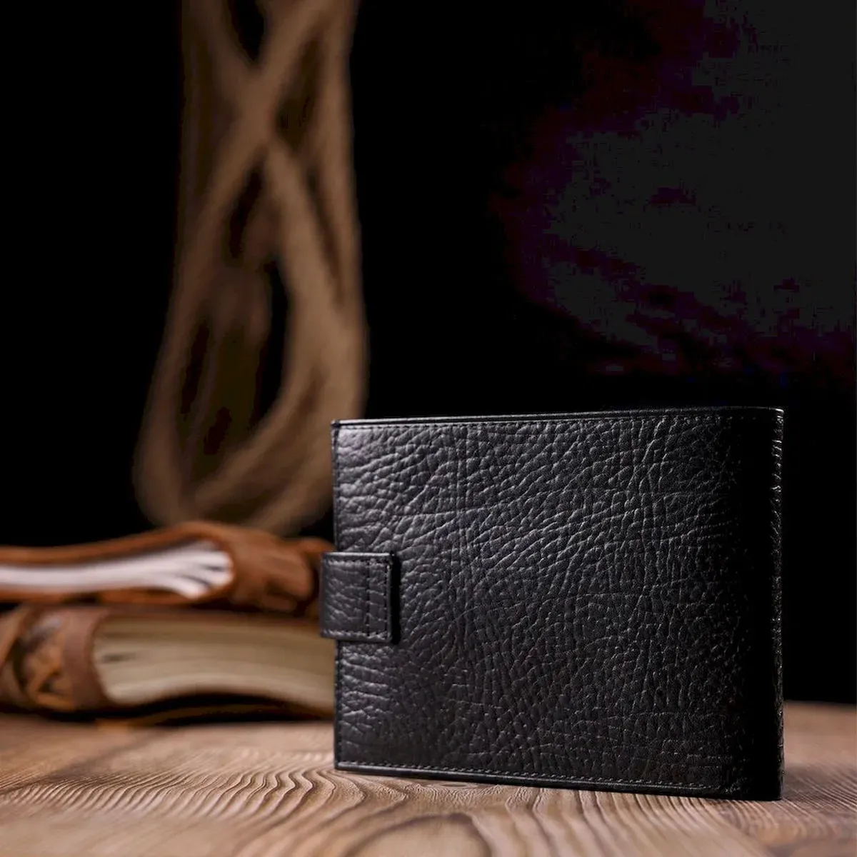 Місткий чоловічий гаманець з натуральної шкіри, у класичному чорному кольорі. Виріб закривається хлястиком на кнопку. Виріб має місткі відділення для купюр і всередині достатньо осередків для кредиток. Виріб упакований у фірмову коробочку. Вироби з натуральної шкіри завжди будуть чудовим подарунком для близької людини.