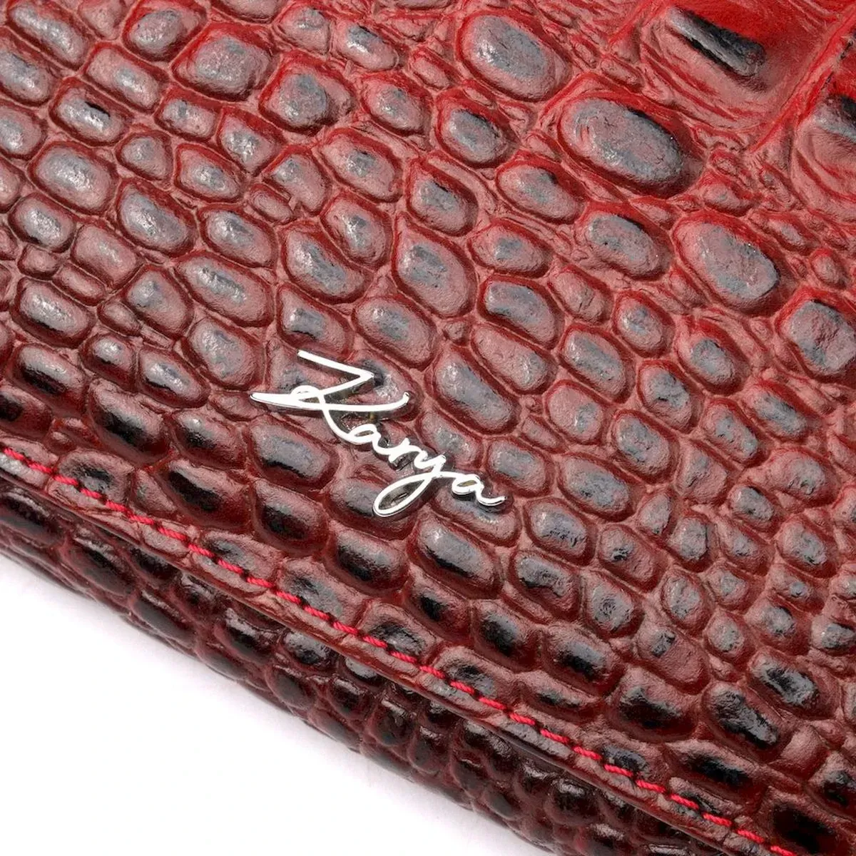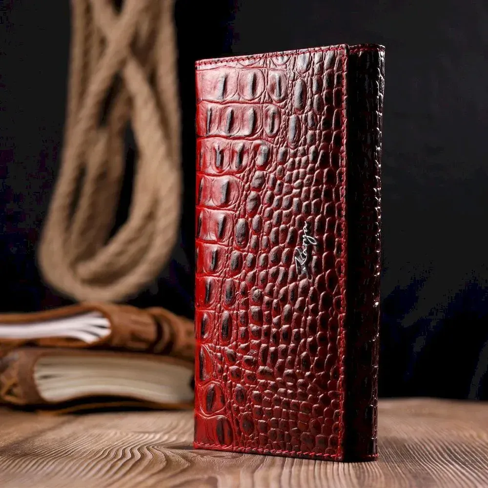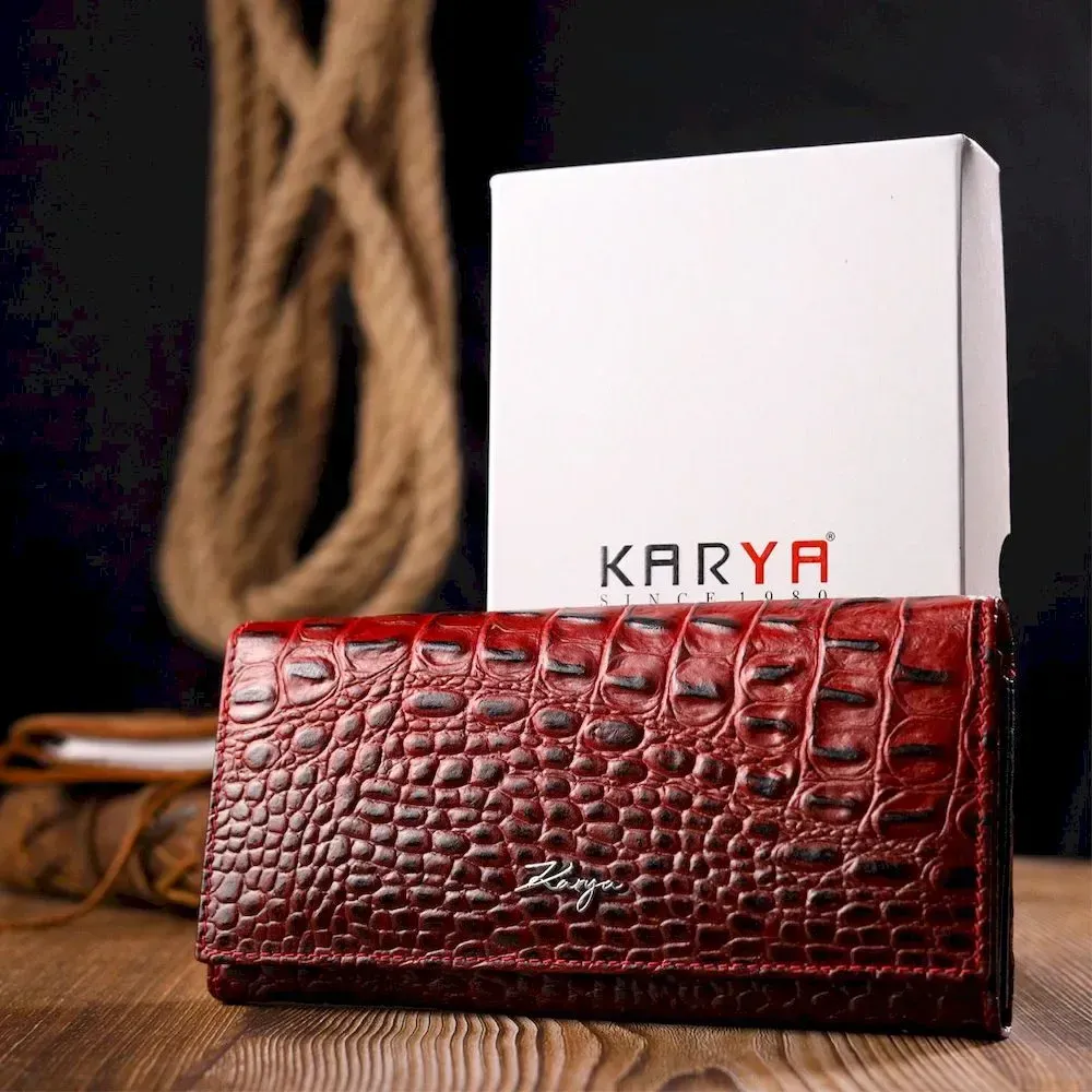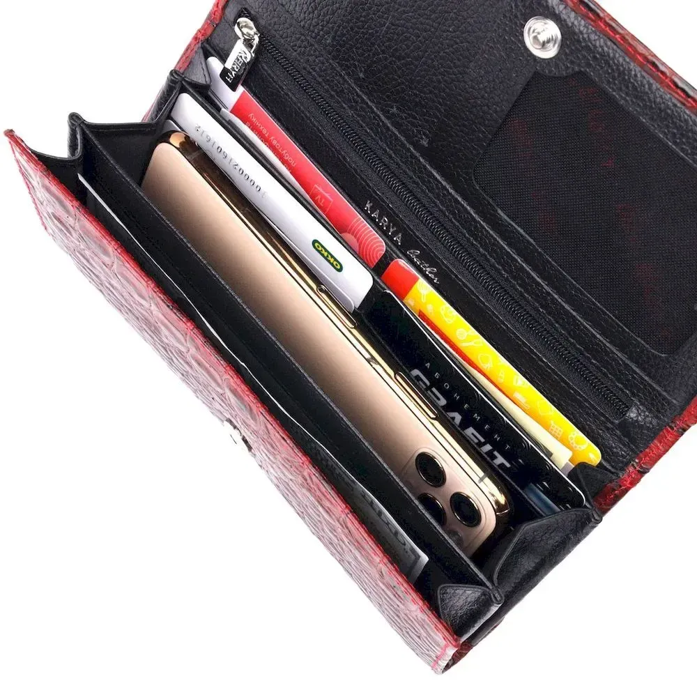 Місткий горизонтальний гаманець з натуральної шкіри з тисненням під крокодила KARYA 21168 Червоний