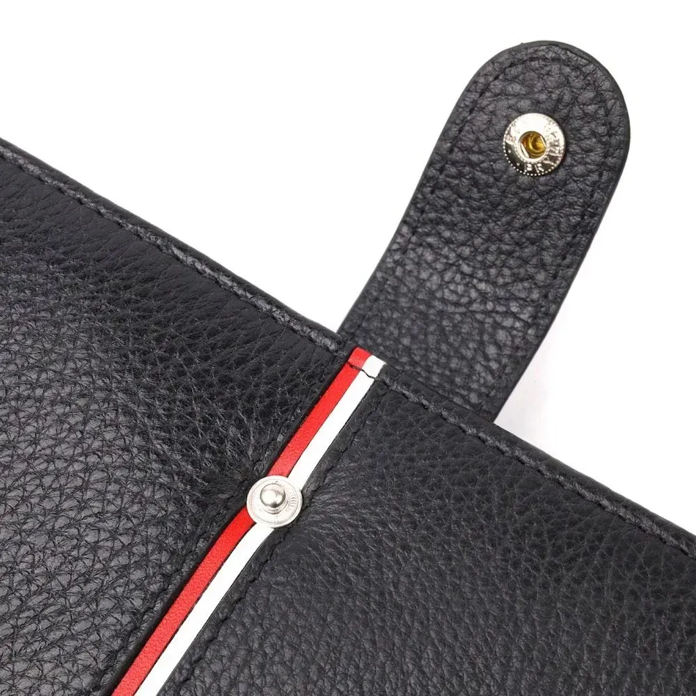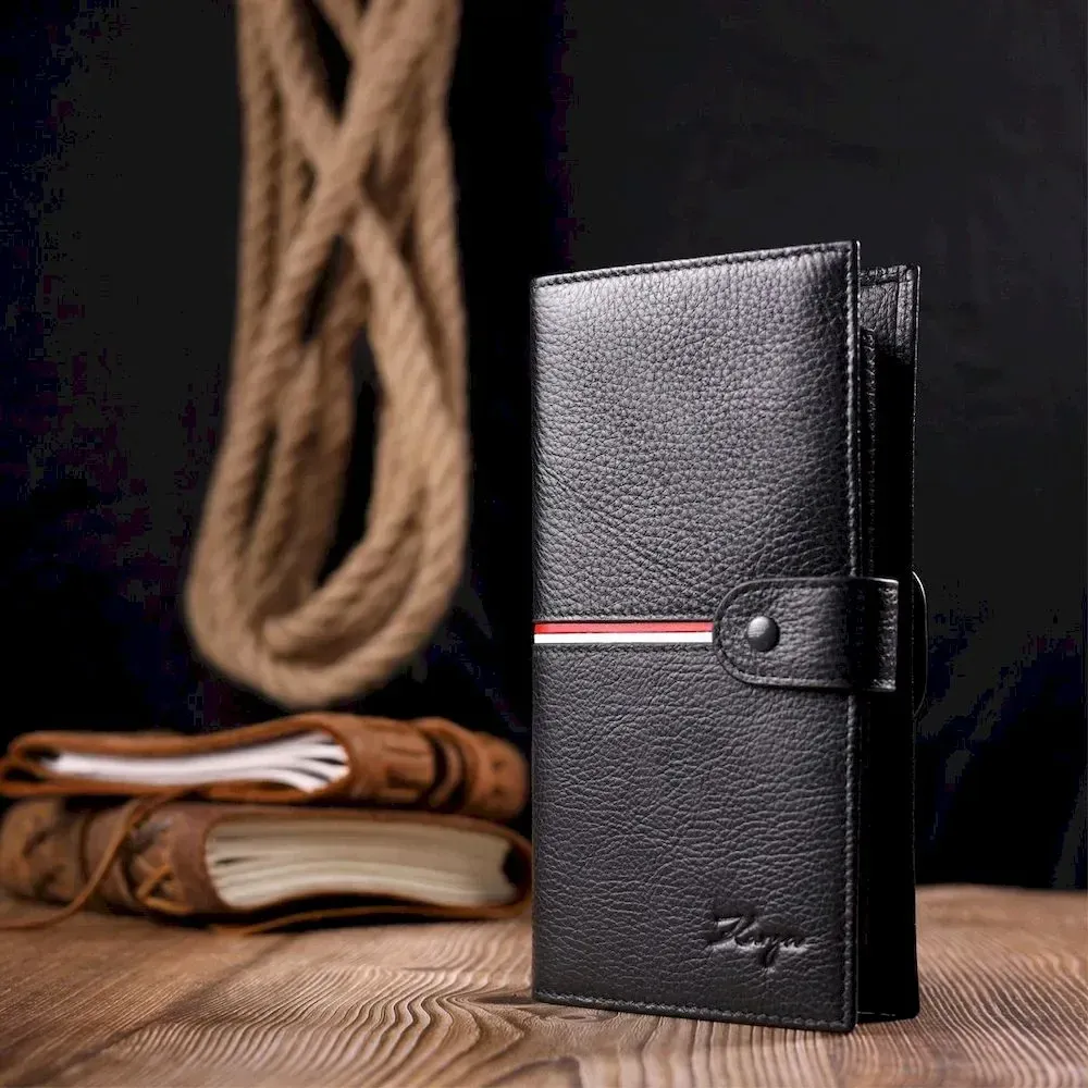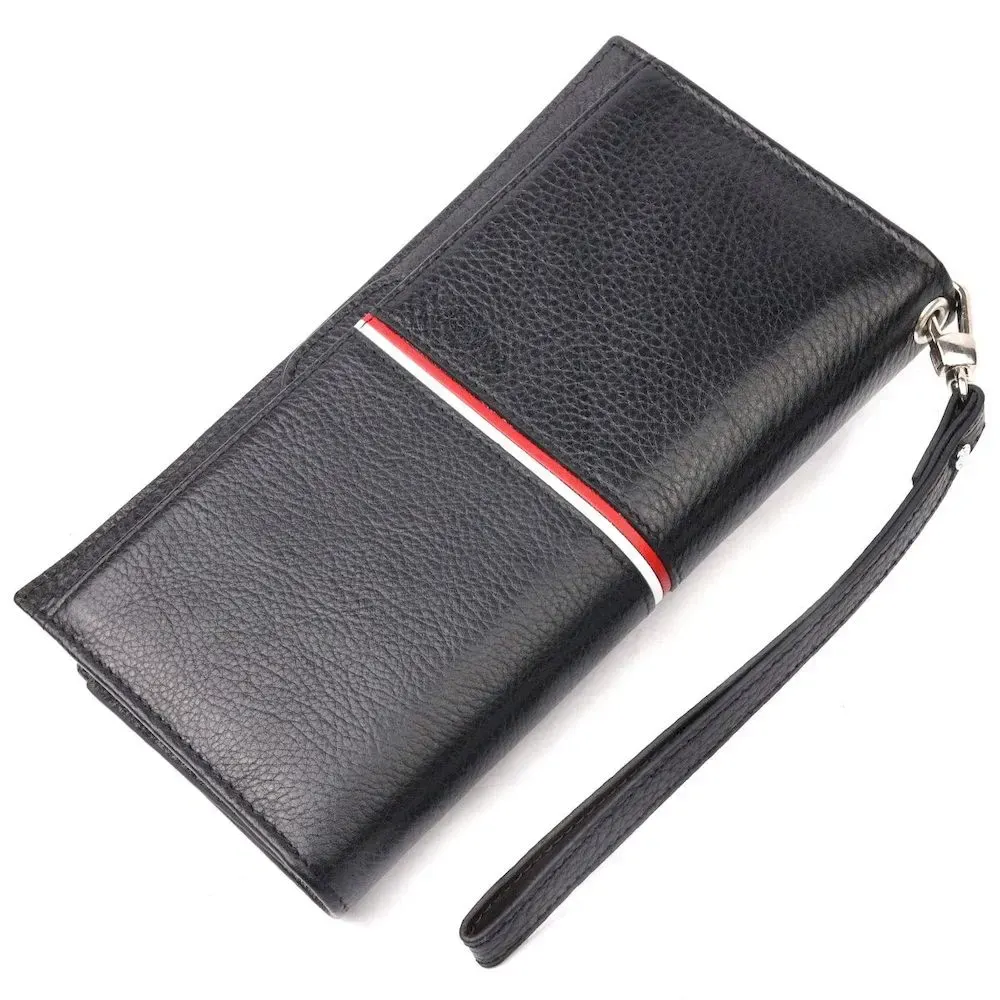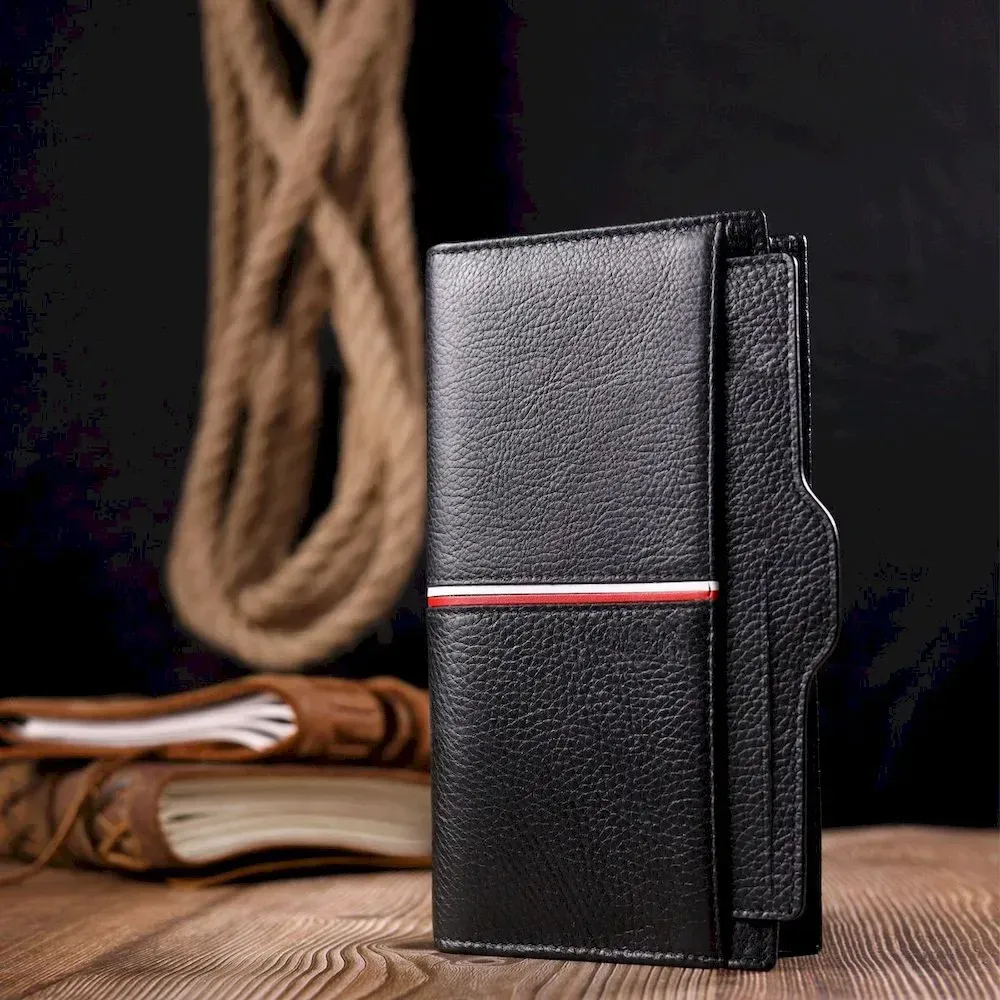 Практичний чоловічий клатч із натуральної шкіри з використанням добротного текстилю (внутрішня підкладка). Носиться за допомогою ремінця на зап'ясті або просто в руці. Має декоративну вставку червоно-білого кольору. Тип фіксації в клатчі: хлястик із металевою кнопкою. Для зручності в носінні гаманець укомплектований зап'ястним ремінцем. Дуже гідна модель вертикального формату. З таким аксесуаром чоловік буде виглядати солідно і впевненим у собі.