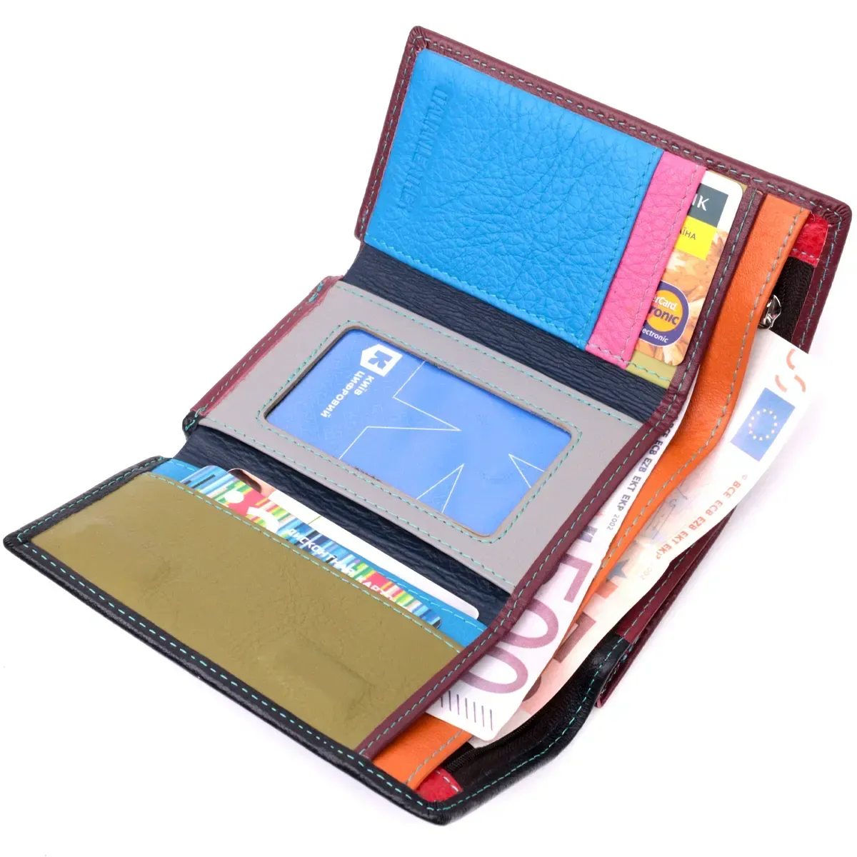 Зручне жіноче портмоне в три складення зручного середнього розміру з натуральної шкіри найвищої якості. Перше, що впадає в око це колірне рішення, замість однотонного аксесуара ми маємо різнокольоровий, який містить два основні зовнішні кольори - чорний і бордовий і кілька додаткових усередині. Шкіряне портмоне дуже практичне і служить досить довго. Аксесуар складається з двох містких кишень для купюр, кишені на блискавці через всю довжину, п'яти осередків для карт, прозорого віконця для пропуску та зовнішньої кишені на блискавці з перегородкою, що чудово прослужить для монет. Портмоне доповнено надійною фурнітурою. Укомплектований гаманець у фірмову картонну коробку білого кольору. Виріб стане ідеальним подарунком для дівчини будь-якого віку.