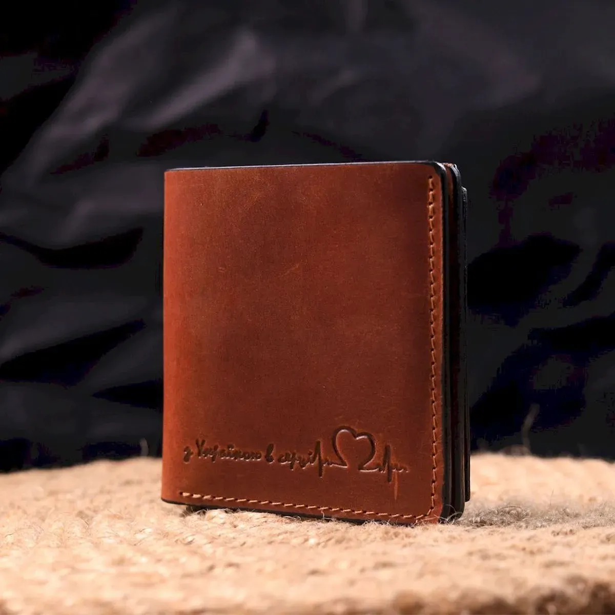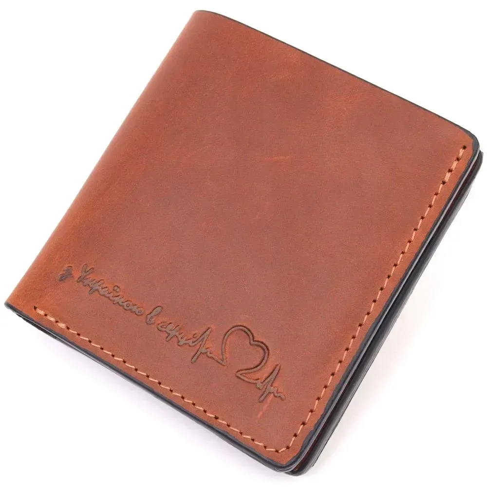 Добротний шкіряний гаманець, світло-коричневого кольору з патріотичним написом “З Україною в серці”. Виріб пошитий із якісної гладкої шкіри, з високими показниками зносостійкості. Портмоне має два великих відділення для купюр усіх номіналів, а також достатню кількість відділень для карток та монетницю, застібається виріб на надійний магніт. Шкіряний гаманець стане чудовим подарунком на всі випадки життя.
