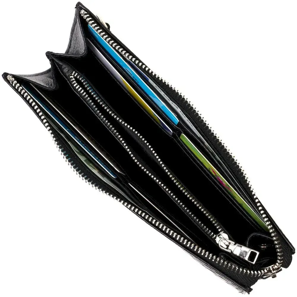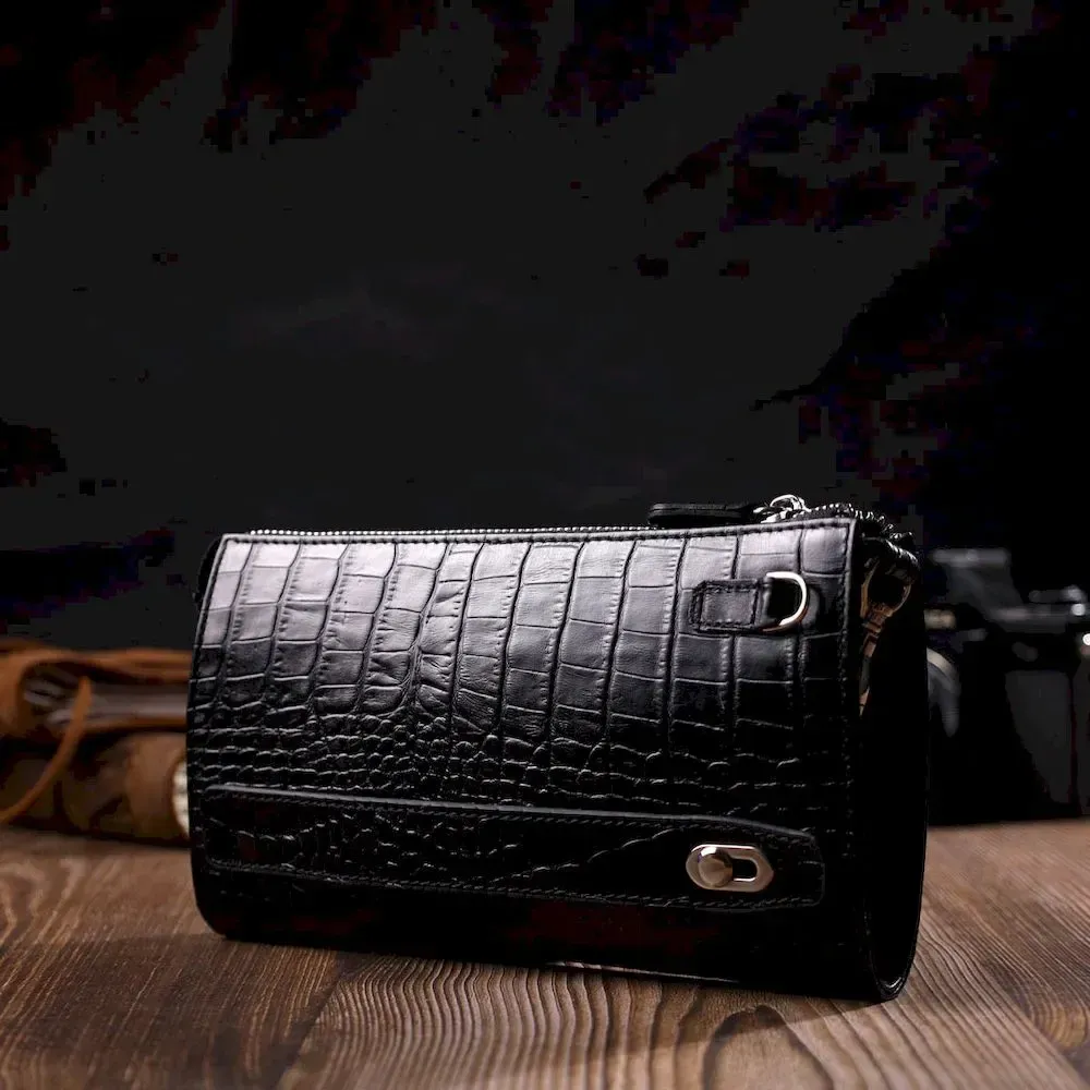 Унікальний чоловічий клатч з натуральної якісної шкіри з тисненням під крокодила, що закривається виріб на блискавку, всередині можна без проблем розміщувати паперові банкноти, банківські картки і навіть смартфон. Аксесуар складається з двох відділень для купюр, двох прилеглих кишень, дванадцяти слотів для кредиток та монетниці на блискавці. Є також ручка для долоні на тильній стороні клатчу та знімний кистьовий ремінь. Продається клатч у красивій коробці від виробника. Якісний і надійний клатч - саме такий аксесуар повинен бути у кожної людини, що поважає себе.