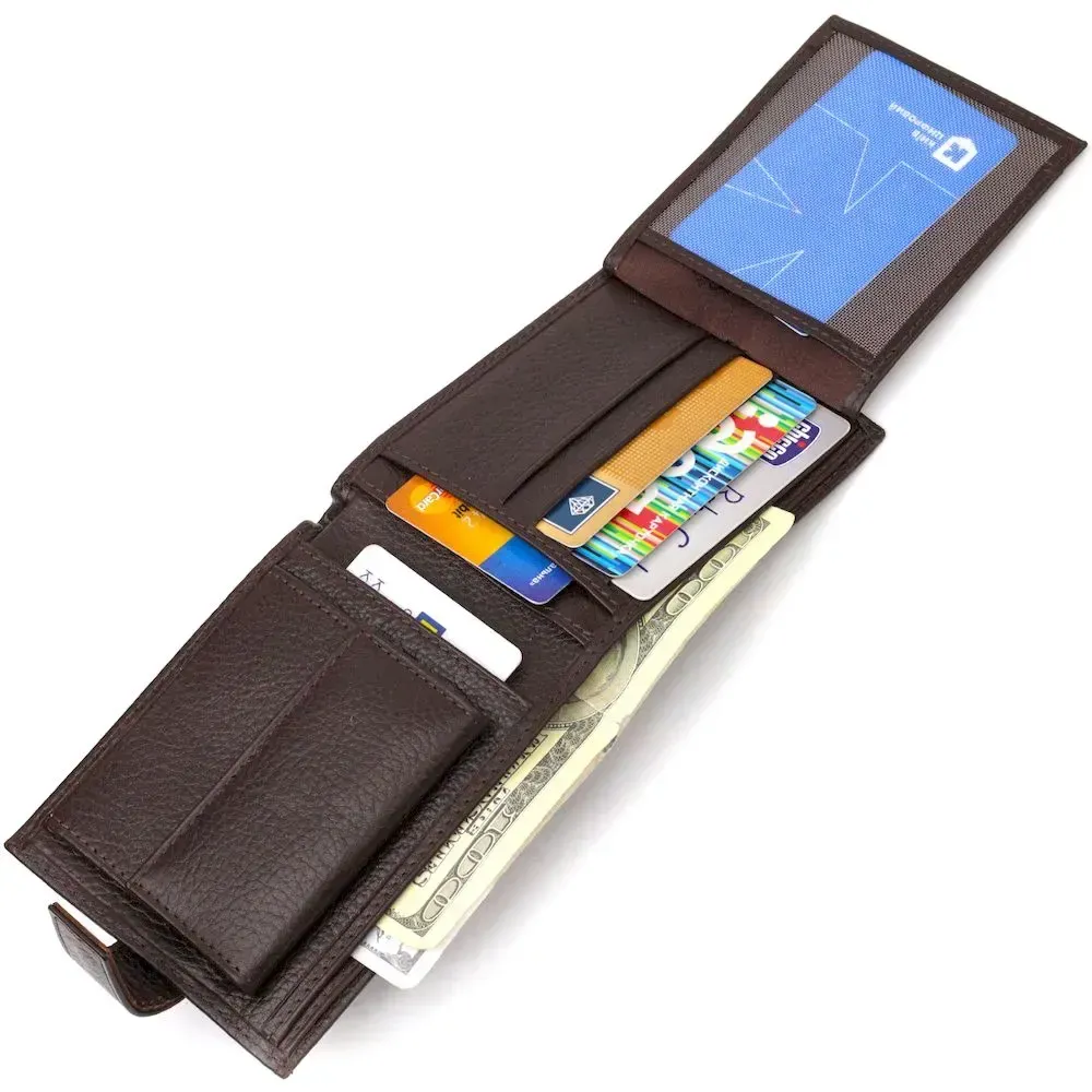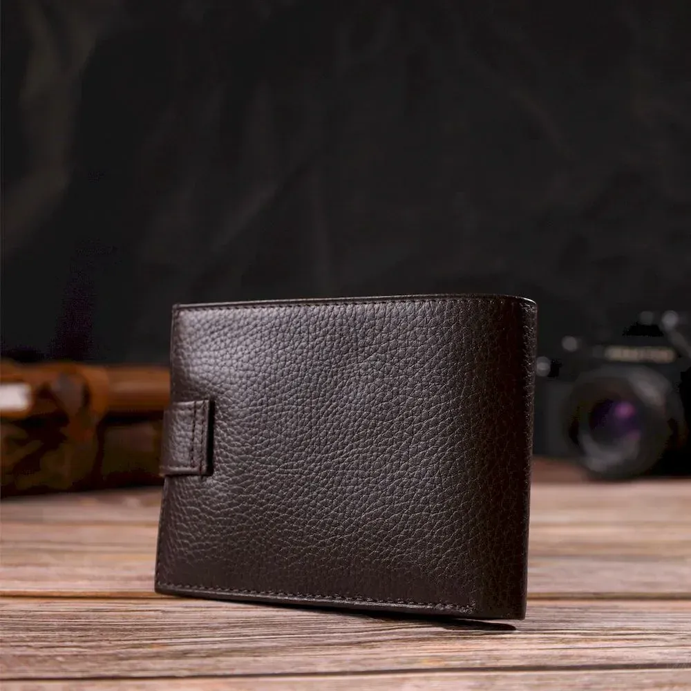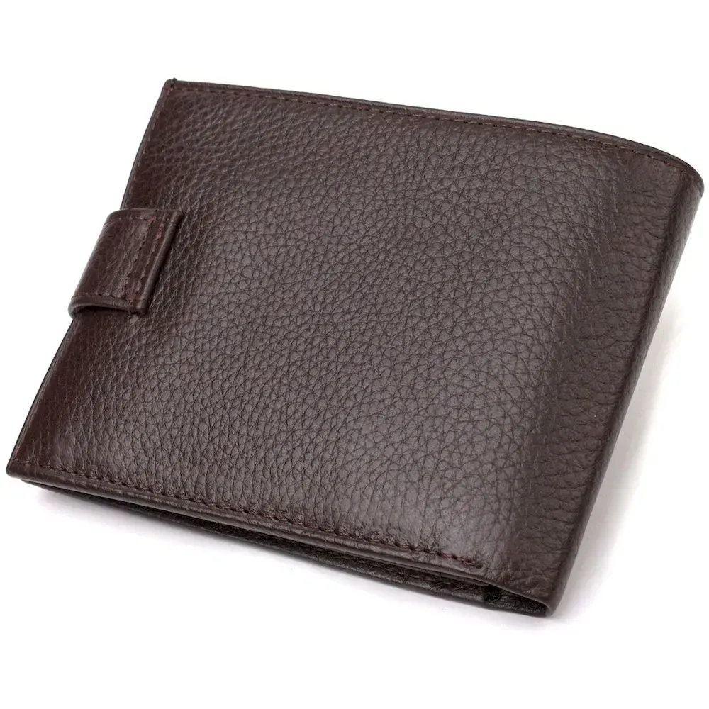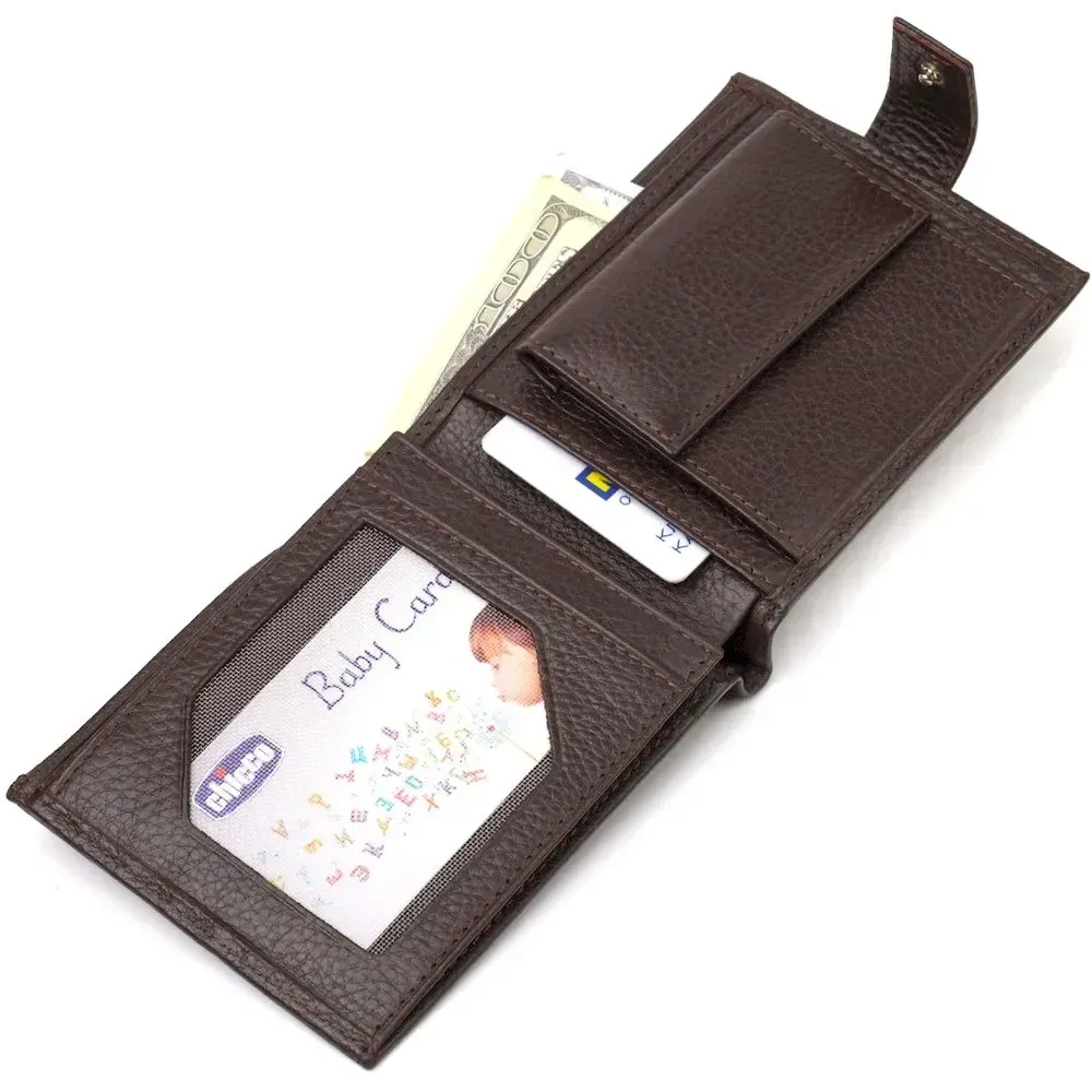 Надійний чоловічий гаманець середнього розміру з натуральної зернистої шкіри флотар. Аксесуар має основне відділення для купюр з перегородкою, чотири осередки для карток, дві кишені під сіточкою, три прилеглі кишені та монетницю. Гаманець складається навпіл, закривається хлястиком на кнопку. На лицьовій стороні в правому нижньому кутку розташований металевий логотип компанії виробника. Купуючи шкіряний гаманець у нашому магазині, Ви отримуєте модний, стильний аксесуар, який прослужить не один рік.
