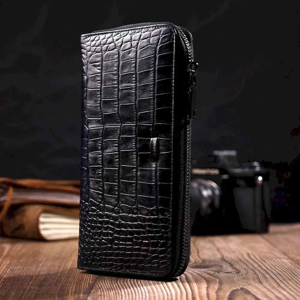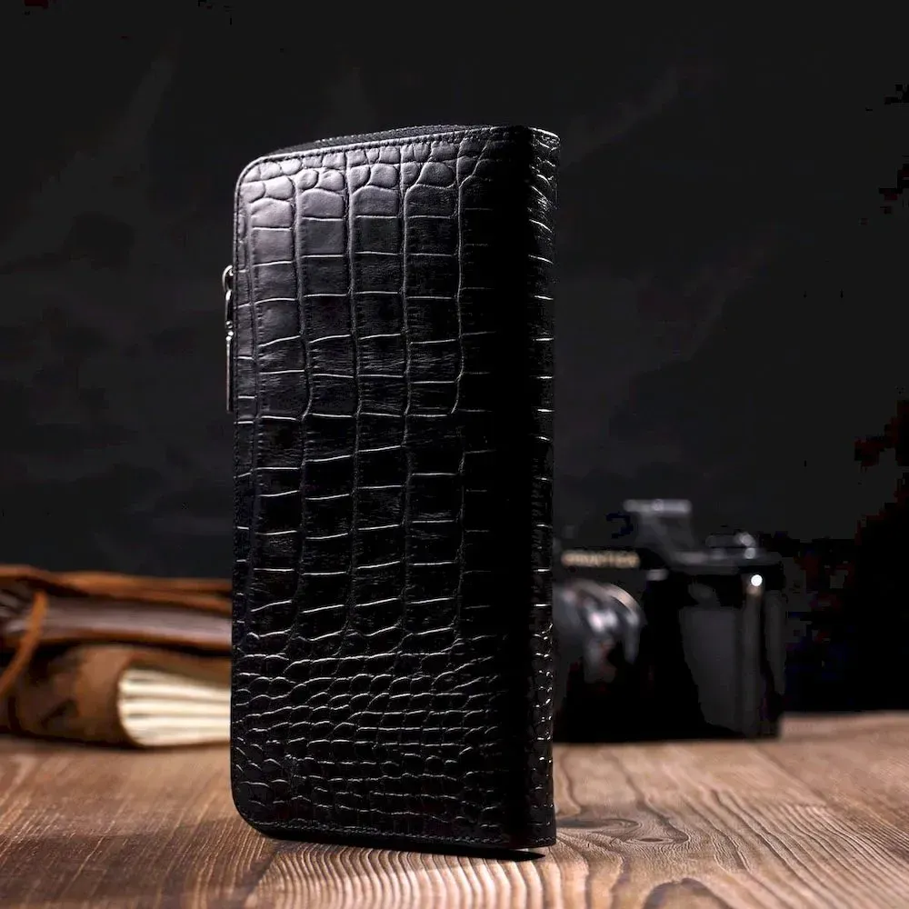 Місткий гаманець для сучасних жінок із натуральної шкіри з тисненням під крокодила. Аксесуар складається з трьох відділень для купюр, шести осередків для пластикових карток, трьох прилеглих кишень та монетниці. У виробі використано якісну фурнітуру. Закривається гаманець на блискавку. Якісний і надійний гаманець - саме такий аксесуар повинен бути у кожної людини, що поважає себе.