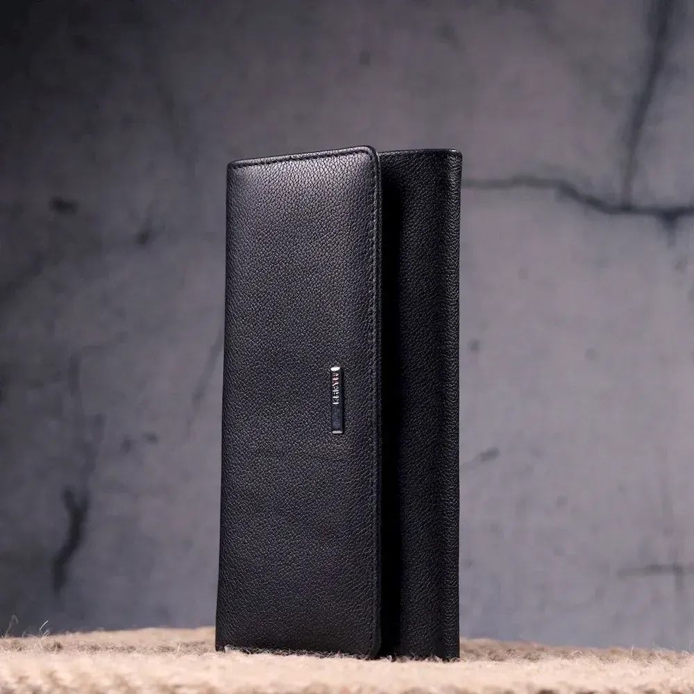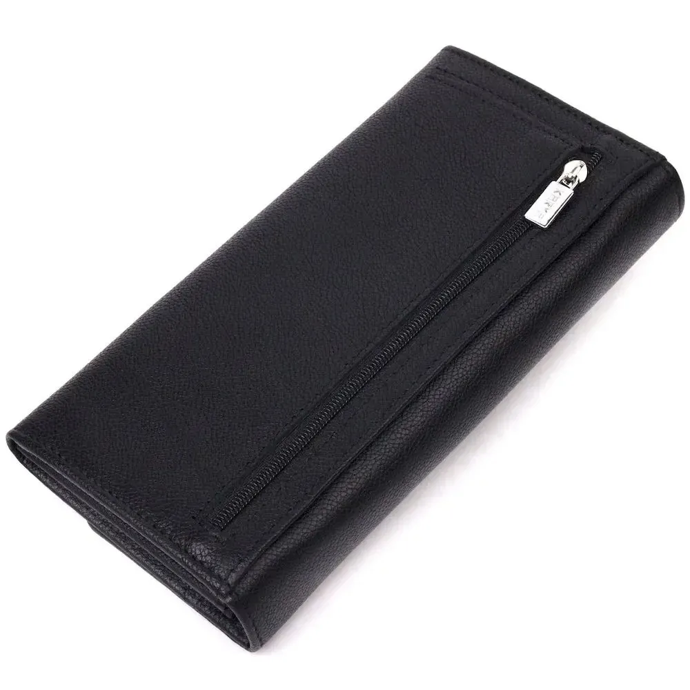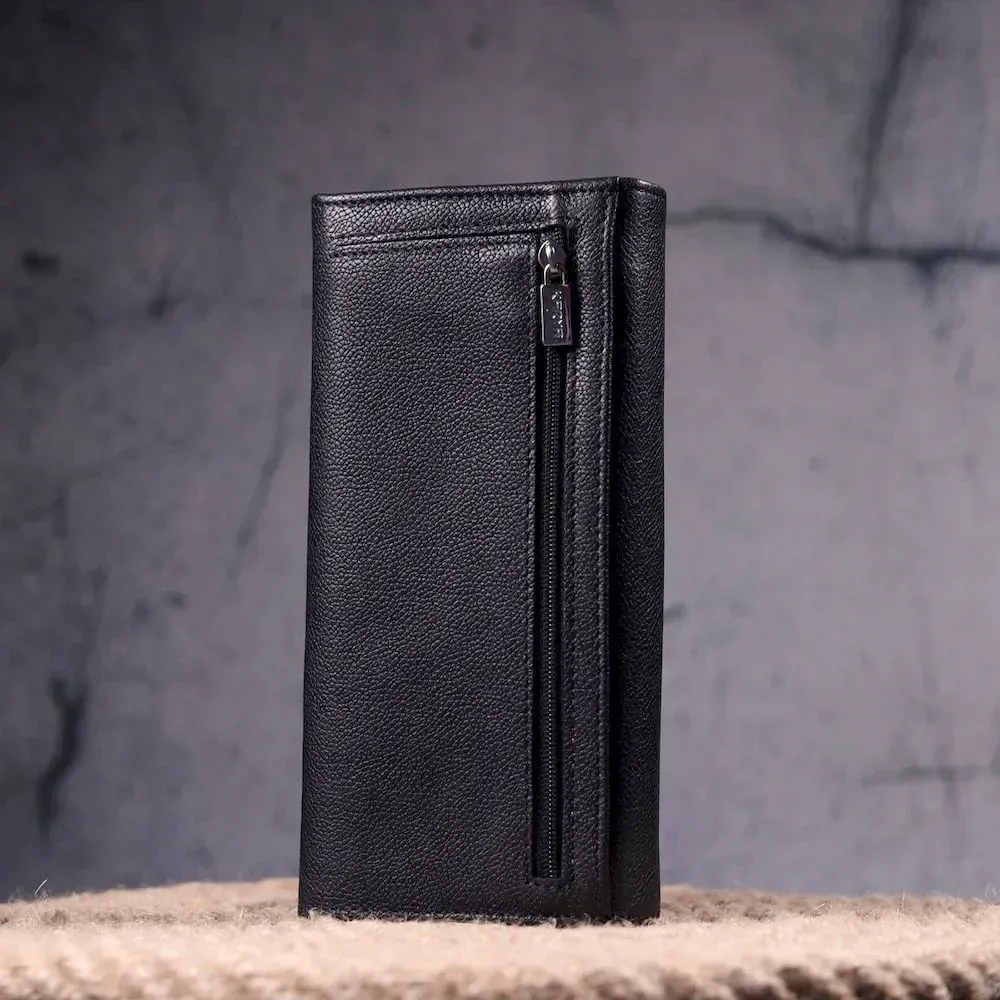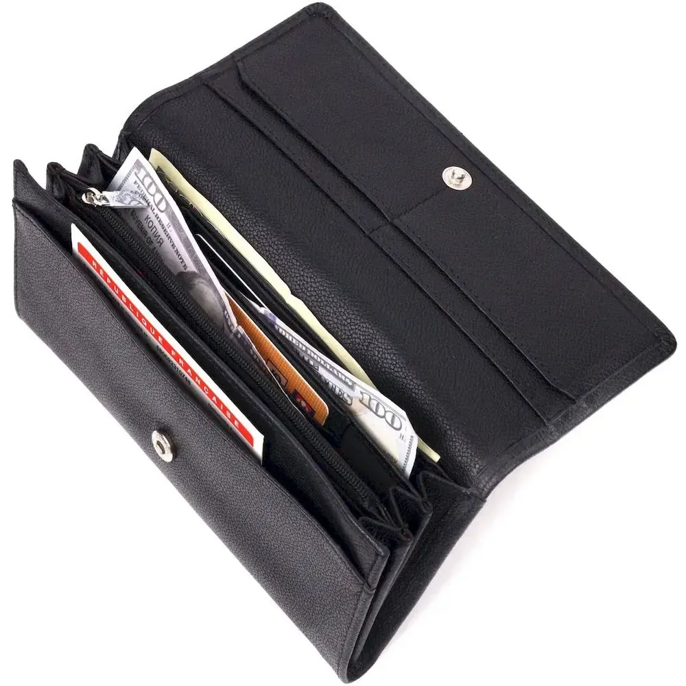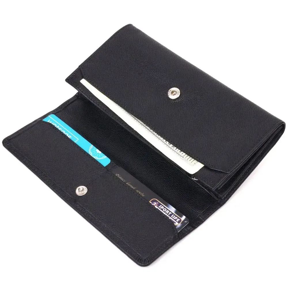 Стильний гаманець з натуральної зернистої шкіри, у класичному чорному кольорі. Внутрішній розворот складається з трьох відкритих відділень для купюр, двох прилеглих кишень, монетниці з розширювачем на застібці зовні, однієї кишені-перегородки на блискавці, дванадцяти секцій для пластикових карток. Складається аксесуар навпіл, з фіксацією на клапан та кнопку. Такий гаманець із натуральної шкіри - це ідеальний варіант на кожен день для тих, хто цінує якість, зручність та комфорт.
