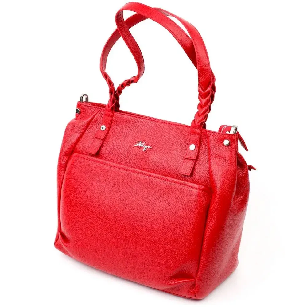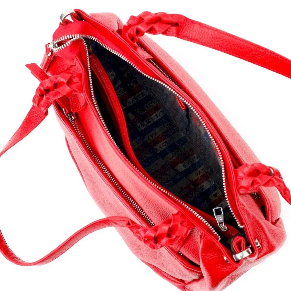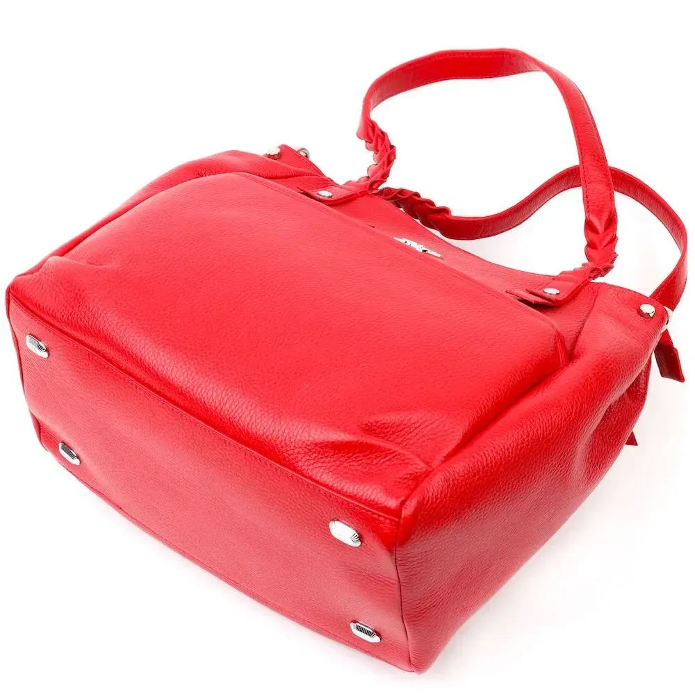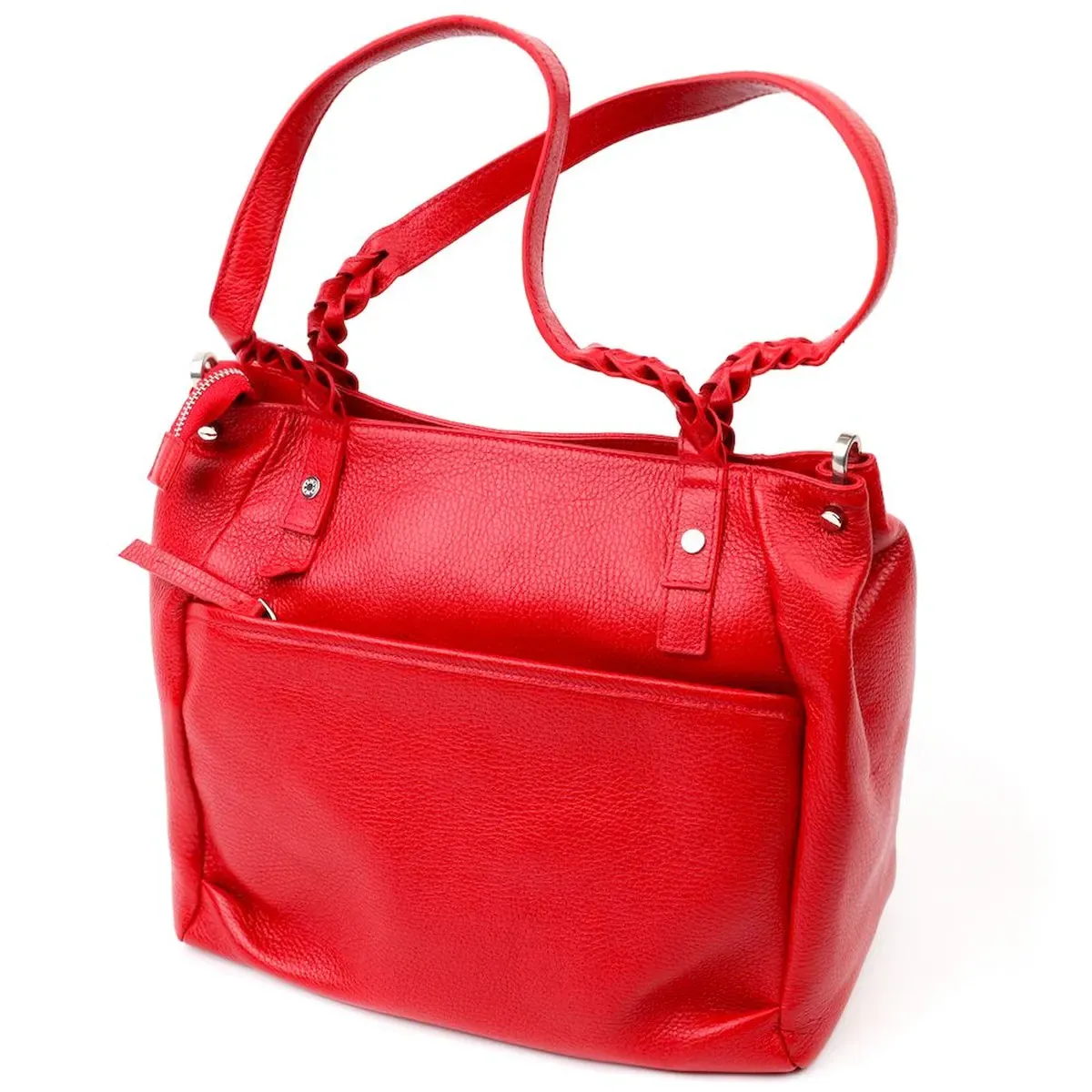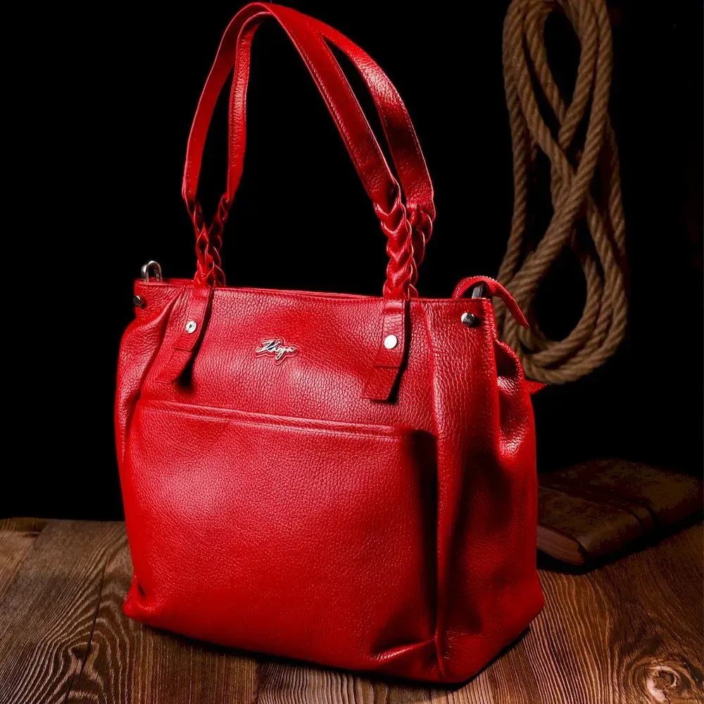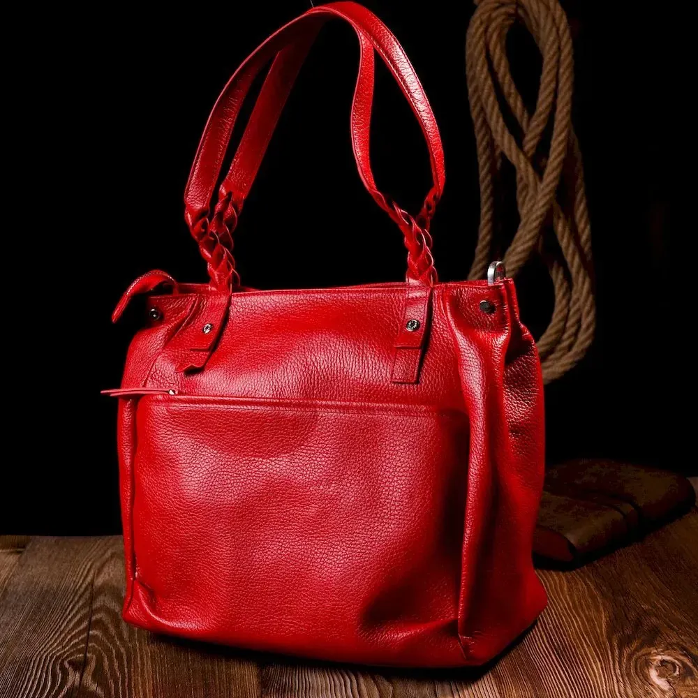Яскрава та функціональна жіноча сумка-шоппер з натуральної шкіри, в червоному кольорі. Фурнітура срібного кольору. Сумку зручно носити в руці, на плечі. Сумка упакована у фірмовий текстильний чохол Karya. Сумка з натуральної шкіри завжди буде чудовим подарунком будь-якій жінці.