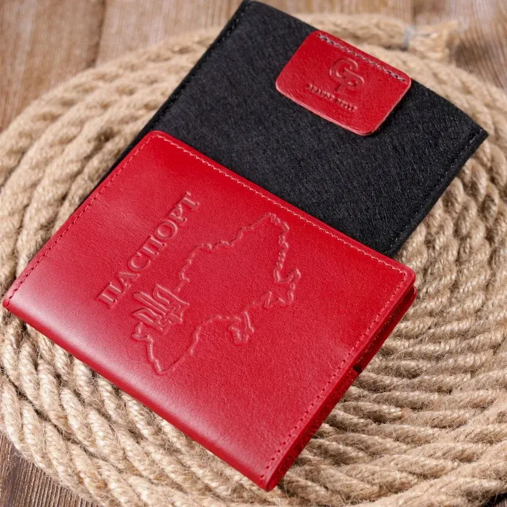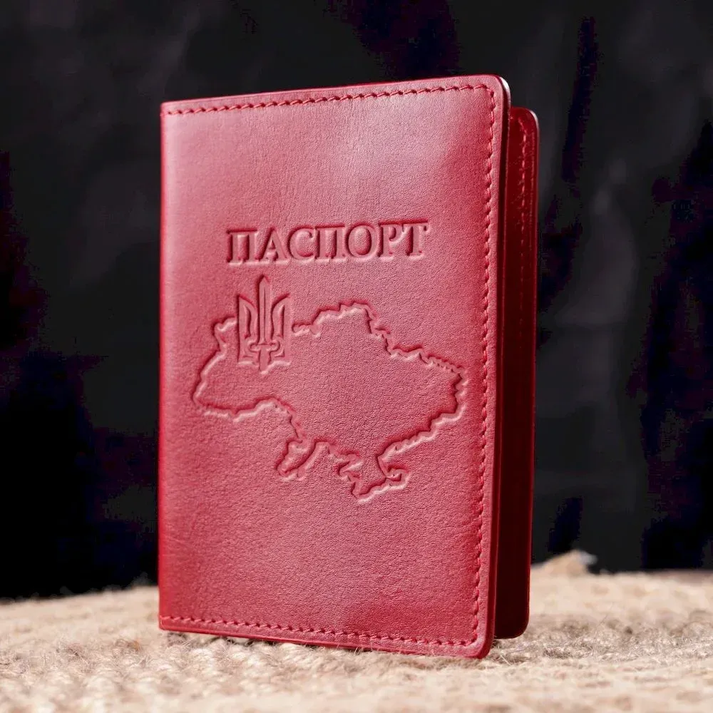Яскрава обкладинка для захисту паспорта з якісної італійської шкіри із патріотичним тисненням карти України. Особливістю шкіряної обкладинки є те, що вона надійно захищає документ від пошкоджень та має довгий термін служби. Виріб без застібки, упакований у фірмовий чохол із фетру. Шкіряна обкладинка на паспорт стане чудовим подарунком жінці на будь-яке свято.