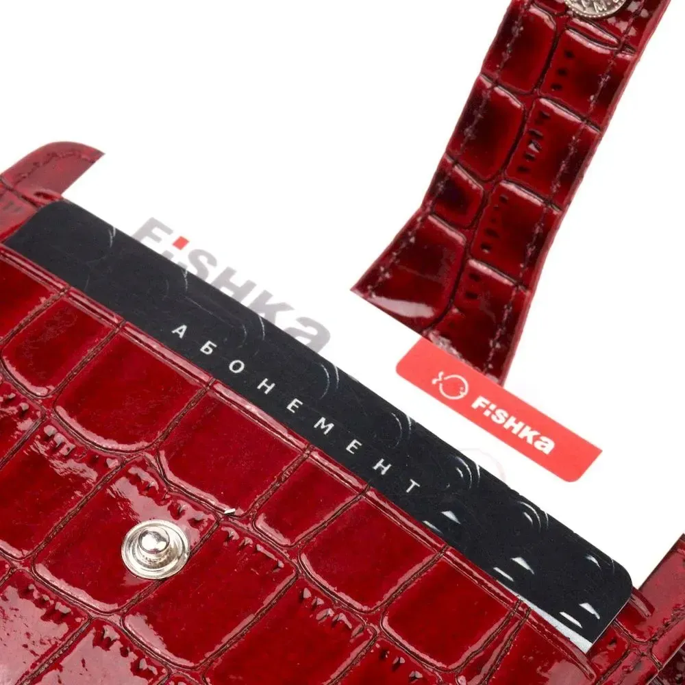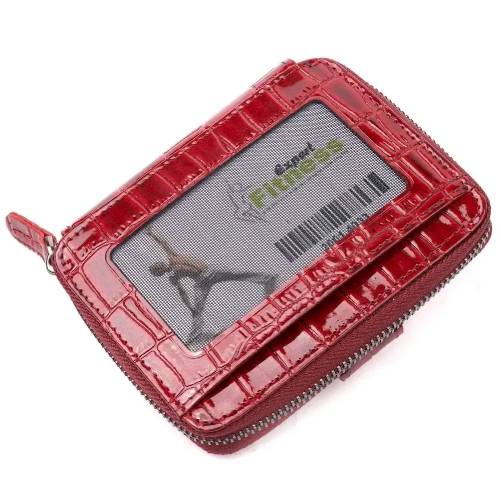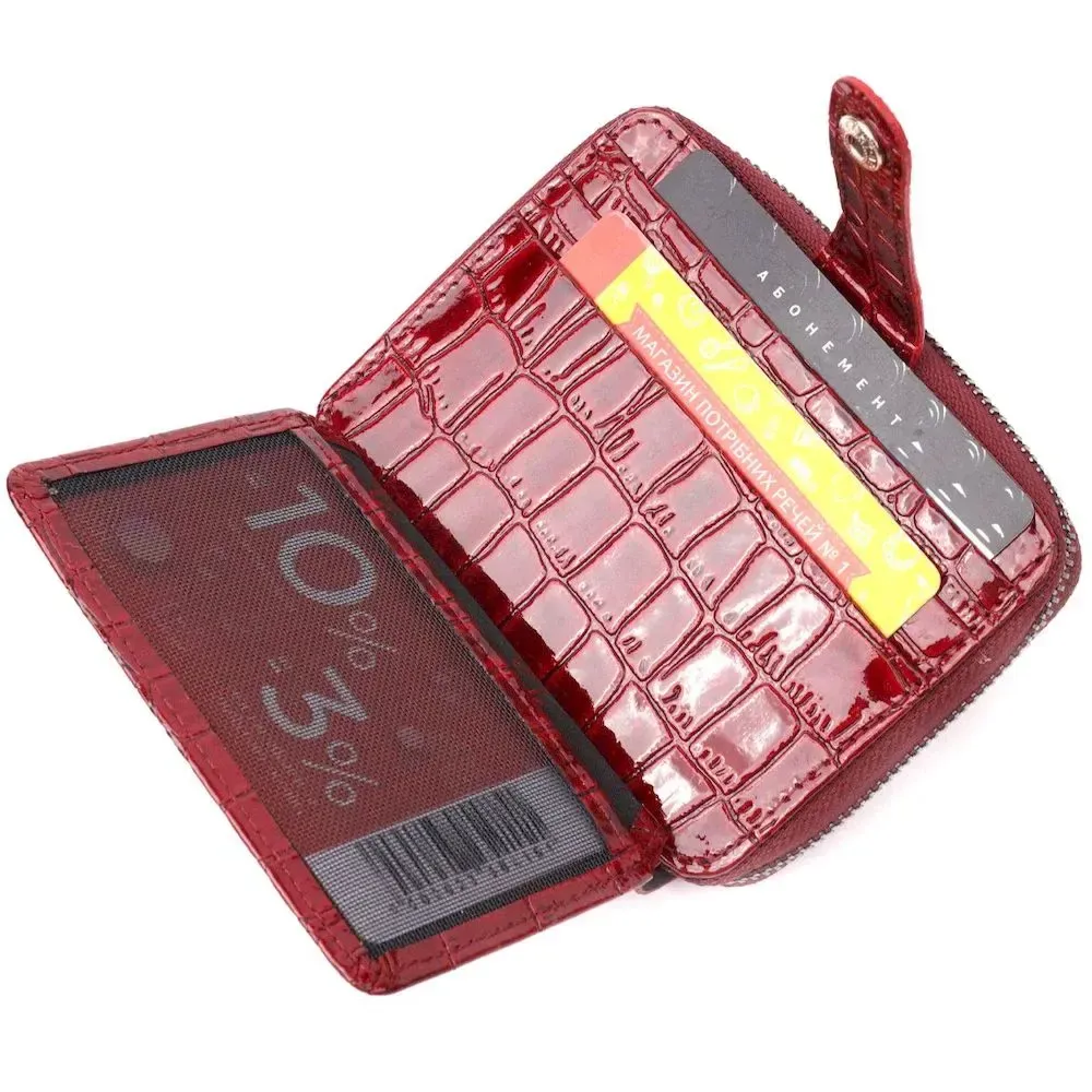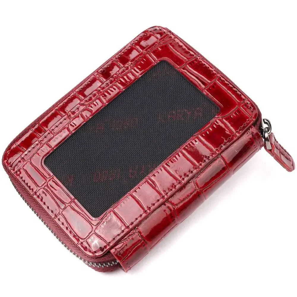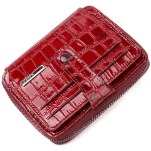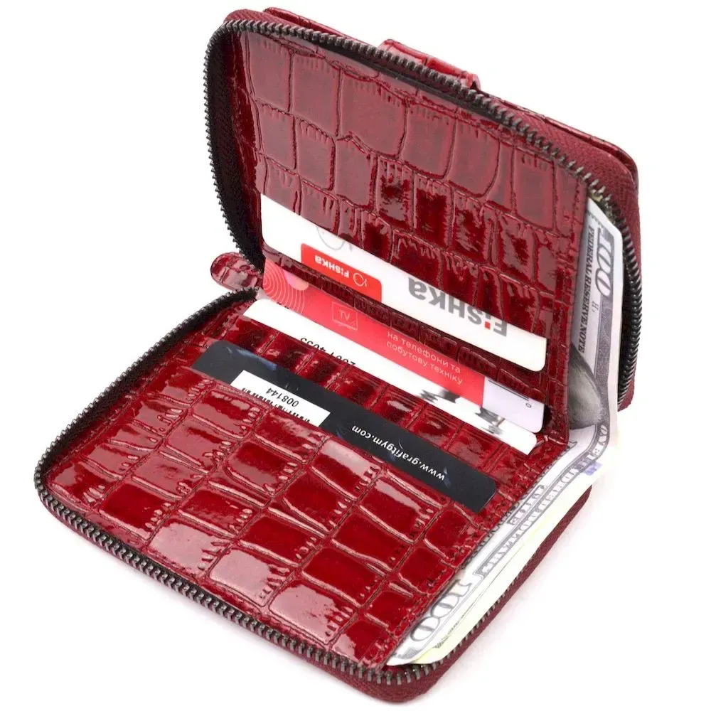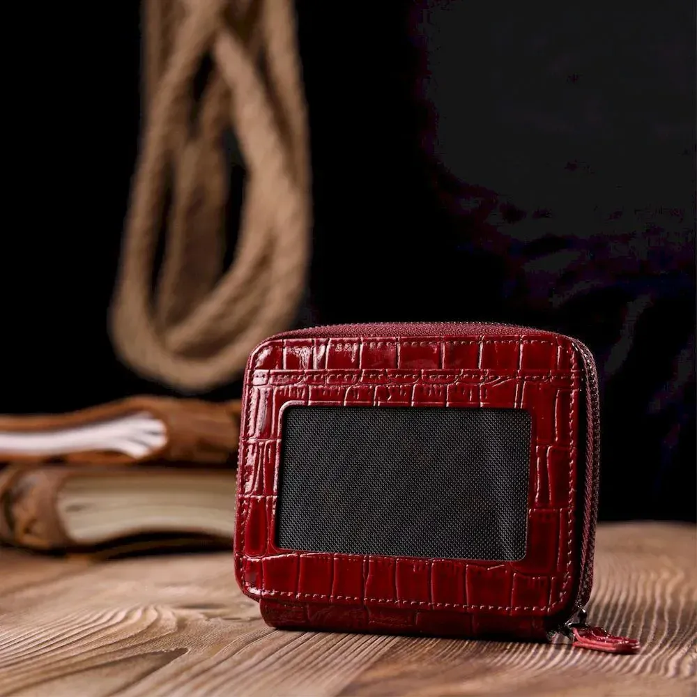 Яскравий гаманець-картхолдер з натуральної лакованої шкіри з тисненням під крокодила, в насиченому бордовому кольору. Виріб закривається на блискавку (основне відділення) і на хлястик з кнопкою (бічне відділення). На лицьовій стороні у вигляді декору розташований металевий логотип виробника. Аксесуар упакований у фірмову коробочку. Вироби з натуральної шкіри завжди будуть чудовим подарунком для близької людини.