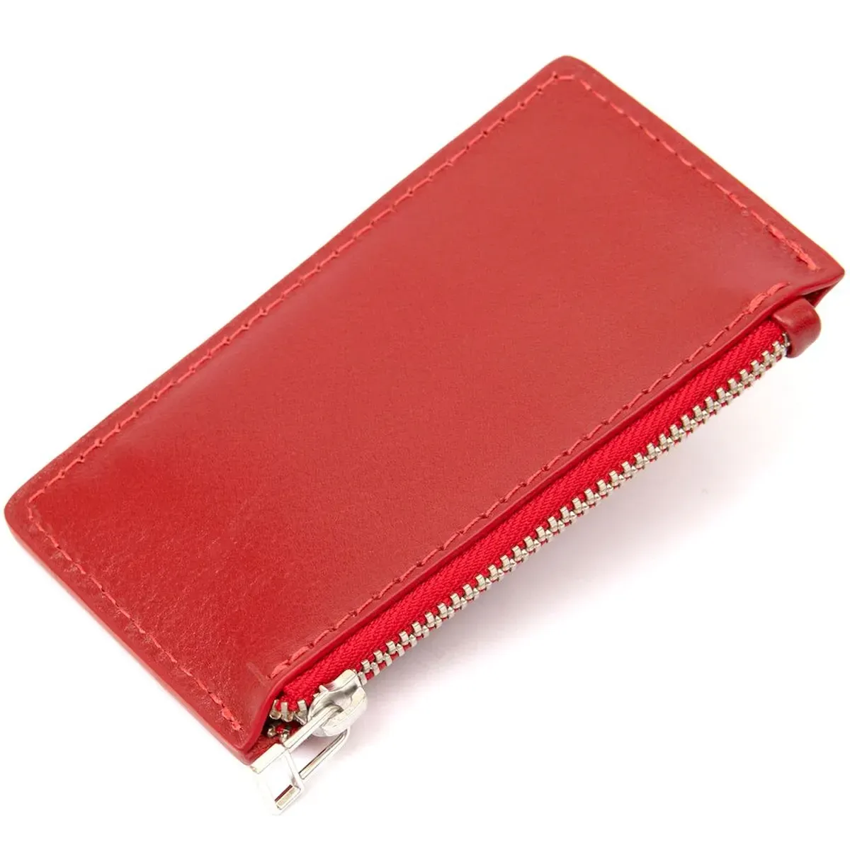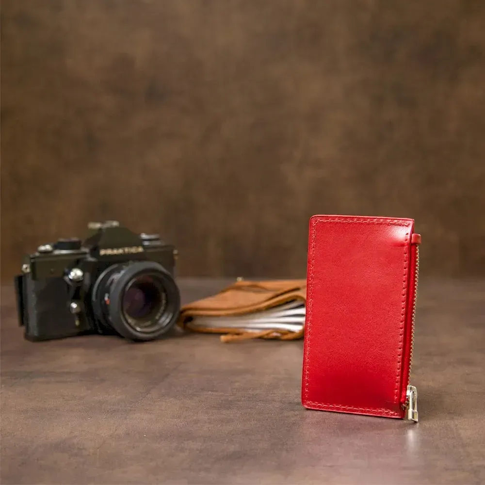 Компактний і практичний картхолдер для найнеобхідніших карток або візиток. Виконаний із натуральної м'якої шкіри високої якості українським виробником. Є дуже зручна кишеня на блискавці, яку можна використовувати для зберігання дрібниць або інших карт. Колір – глибокий червоний із срібною фурнітурою.