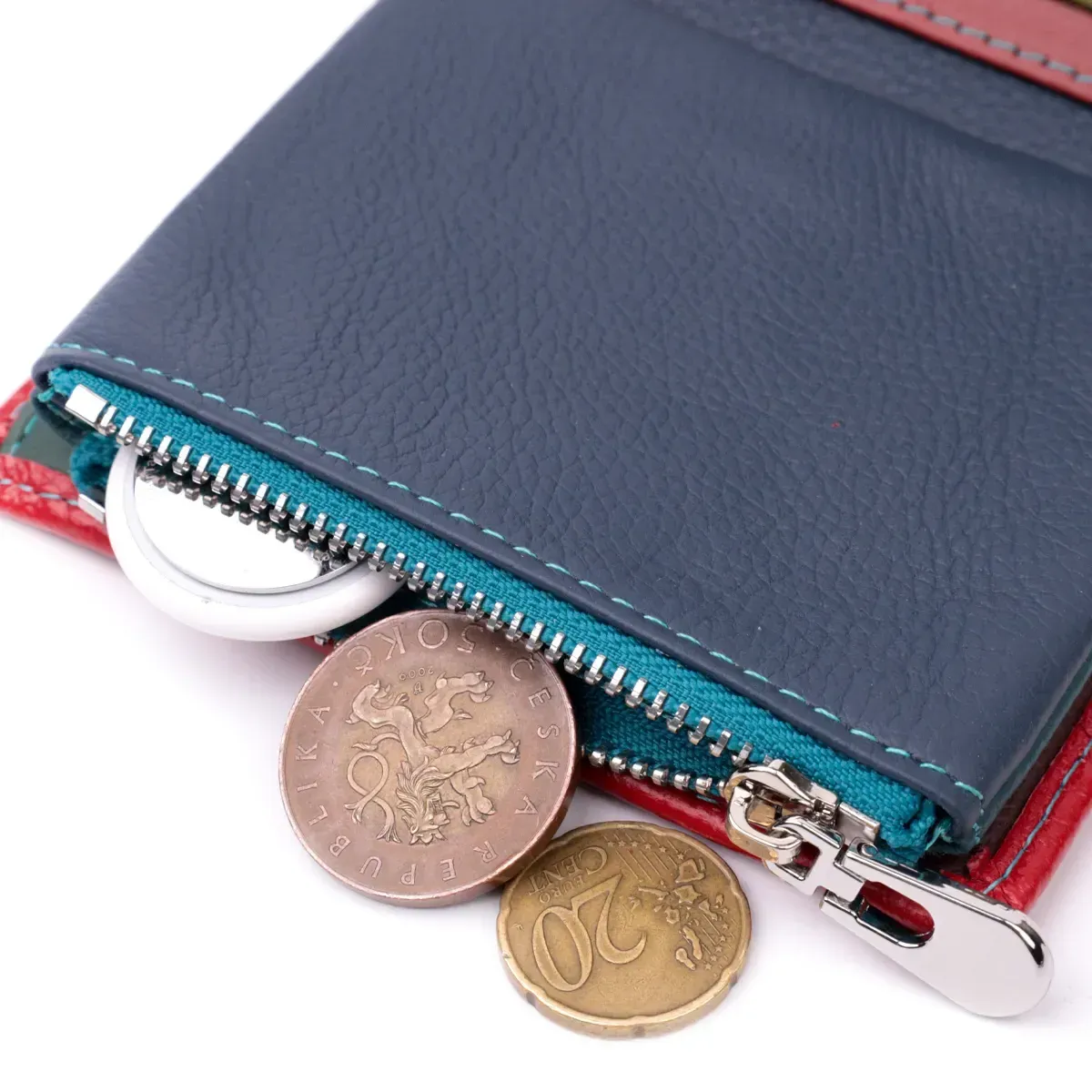 Яскраве вертикальне портмоне в два складення зручного розміру з натуральної шкіри найвищої якості. Гаманець червоного кольору зовні та різнобарвний усередині, що дуже стильно та сучасно. Шкіряне портмоне дуже практичне і служить досить довго. Аксесуар складається з основного відділення зі шкіряною перегородкою для купюр, монетниці, чотирьох осередків для карт, прозорого віконця для пропуску та чотирьох прихованих кишень. Портмоне доповнено надійною фурнітурою і прошито по краю рівним рядком бірюзового кольору. Укомплектований гаманець у фірмову картонну коробку білого кольору. Виріб стане ідеальним подарунком для дівчини будь-якого віку.