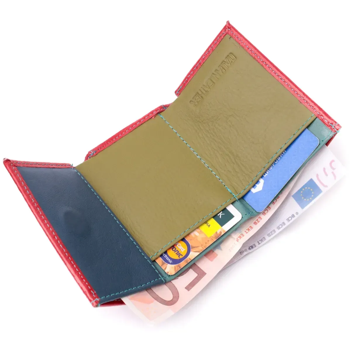 Ультрамодне жіноче портмоне в три складення з натуральної шкіри найвищої якості. Акцентом цього гаманця є колір, точніше кілька кольорів – він червоного кольору зовні та багатобарвний усередині. Аксесуар складається з двох містких відділень для купюр, двох осередків для карток та кишені для монет. Зовні виріб прошитий рівним рядком бірюзового кольору по краю і прикрашений металевим логотипом компанії виробника. Портмоне доповнено надійною фурнітурою та міцною підкладкою. Укомплектований гаманець у фірмову картонну коробку білого кольору.